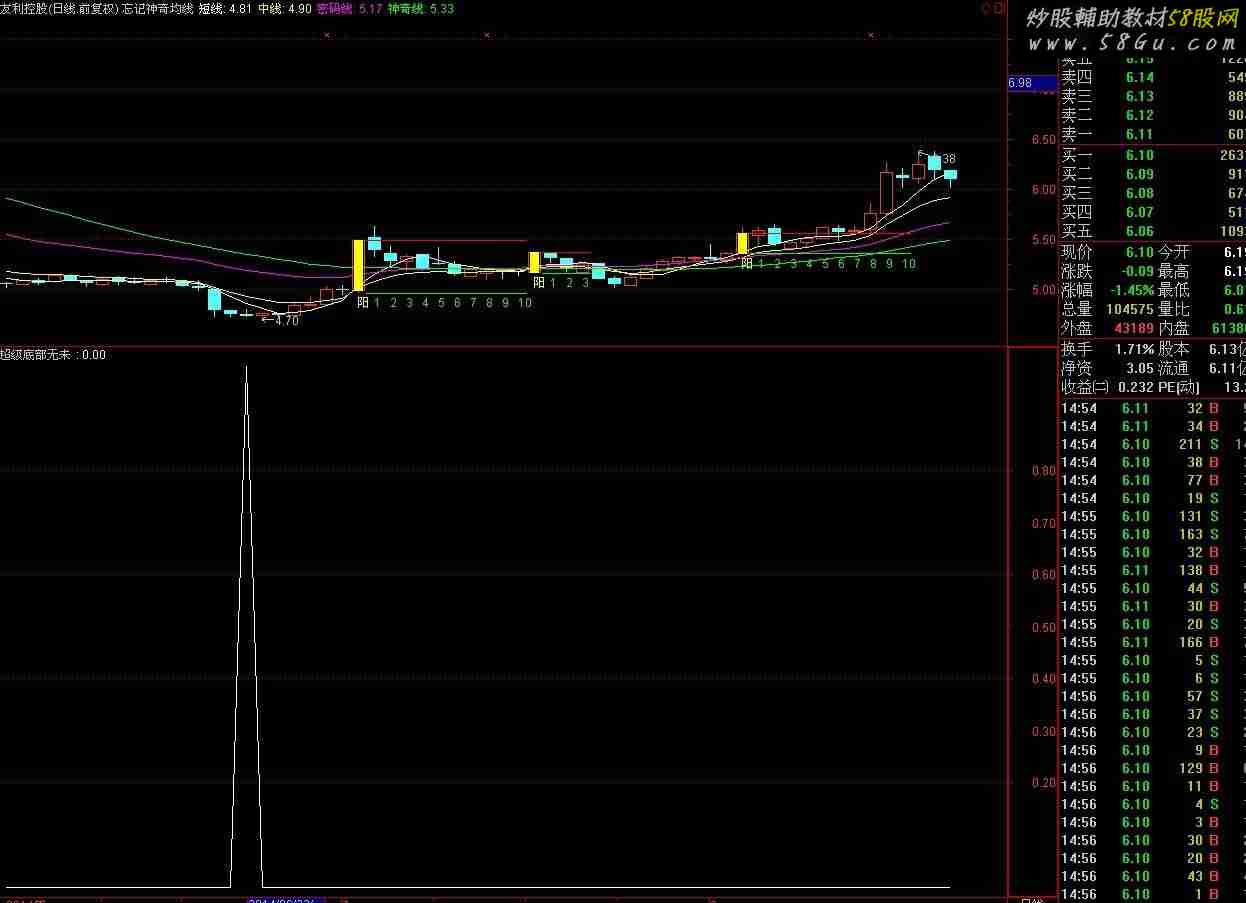 给大家发一个自用的 超级底部选股 看图就明白 本人发图历来规范 我看了很多谓“精华指标”,连抓图都扭扭捏捏 , 代码、日期一概不敢抓全, 有的就跟本没法看,还“精华”呢? 狗屁不如,建议这样的图就不要发了 要发就要真心实意, 让大家看个明白A1:=SUM(MAX(0,HIGH-REF(CLOSE,1)),26)/SUM(MAX(0,REF(CLOSE,1)-LOW),26)*100; A2:=SUM(HIGH-OPEN,26)/SUM(OPEN-LOW,26)*100; A3:=SUM(IF(CLOSE>REF(CLOSE,1),VOL,0),26); A4:=SUM(IF(CLOSE<REF(CLOSE,1),VOL,0),26); A5:=SUM(IF(CLOSE=REF(CLOSE,1),VOL,0),26); A6:=100*(A3*2+A5)/(A4*2+A5); A7:=COUNT(CLOSE>REF(CLOSE,1),12)/12*100; A8:=REF(VOL,1); A9:=SMA(MAX(VOL-A8,0),6,1)/SMA(ABS(VOL-A8),6,1)*100; MID:=REF(HIGH+LOW,1)/2; A10:=SUM(MAX(0,HIGH-MID),26)/SUM(MAX(0,MID-LOW),26)*100; DTM:=IF(OPEN<=REF(OPEN,1),0,MAX((HIGH-OPEN),(OPEN-REF(OPEN,1)))); DBM:=IF(OPEN>=REF(OPEN,1),0,MAX((OPEN-LOW),(OPEN-REF(OPEN,1)))); STM:=SUM(DTM,23); SBM:=SUM(DBM,23); A11:=IF(STM>SBM,(STM-SBM)/STM,IF(STM=SBM,0,(STM-SBM)/SBM)); A1<60 AND A2<74 AND A6<60 AND A7<20 AND A9<51 AND A10<50 AND A11<-0.3 AND C*1.32<MCST.MCST AND (C-REF(C,1))/REF(C,1)<0.04 ;