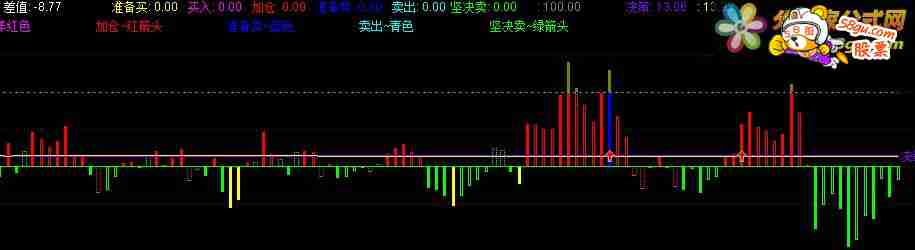 AA := REF(CLOSE,1); BBB:=SMA(MAX(CLOSE-AA,0),34,1)/SMA(ABS(CLOSE-AA),34,1)*1000; HHH:=BBB-LLV(BBB,36); 短期:=(MA(HHH,2)*3+HHH*13)/16; 中期:=MA(HHH,10); 差值:短期-中期,NODRAW; CCC:=LLV(BBB,36)-BBB; 短期二:=(MA(CCC,2)*3+CCC*13)/16; 中期二:=MA(CCC,10); VB:=2*(短期-中期),NODRAW; 乖离率6:=(CLOSE-MA(CLOSE,6))/MA(CLOSE,6)*100; 乖离率12:=(CLOSE-MA(CLOSE,12))/MA(CLOSE,12)*100; 乖离率24:=(CLOSE-MA(CLOSE,24))/MA(CLOSE,24)*100; ZP:=乖离率6<-6 AND 乖离率12<-10 AND 乖离率24<-16; DRAWICON(ZP,-50,26); STICKLINE(VB>=0 AND VB>REF(VB,1),0,VB,1,0),COLORRED; STICKLINE(VB>=0 AND VB<REF(VB,1),0,VB,1,1),COLORRED; STICKLINE(VB<0 AND 中期>REF(中期,1),0,VB,1,1),COLORRED; STICKLINE(VB<0 AND VB<REF(VB,1),0,VB,1,0),COLORGREEN; STICKLINE(VB<0 AND VB>REF(VB,1),0,VB,1,1),COLORGREEN; STICKLINE(VB<0 AND 中期>REF(中期,1),0,VB,2,-1),COLORRED; STICKLINE(VB>=0 AND 中期<REF(中期,1),0,VB,2,-1),COLORGREEN; STICKLINE(短期<3,VB,0,1,0),COLORYELLOW; 准备买:IF(短期<3,8,0),COLORYELLOW,NODRAW; STICKLINE(短期=0,VB,0,1,0),COLORMAGENTA; 买入:IF(短期=0,8,0),COLORMAGENTA,NODRAW; DRAWICON(MA(短期,3)=0,VB,1); 加仓:IF(MA(短期,3)=0,8,0),COLORRED,NODRAW; STICKLINE(差值>60 AND VB>0 AND 中期>50,VB,0,1,0),COLORBLUE; 准备卖:IF(差值>60 AND VB>0 AND 中期>50,4,0),COLORBLUE; STICKLINE(差值>60 AND VB>0 AND 中期>100,VB,0,1,0),COLORCYAN; 卖出:IF(差值>60 AND VB>0 AND 中期>100,4,0),COLORCYAN; 坚决卖:IF(EVERY(差值>60 AND VB>0 AND 中期>100,2),4,0),COLORGREEN; DRAWICON(EVERY(差值>60 AND VB>0 AND 中期>100,2),VB,2); STICKLINE(VB>100,100,VB,1,0),COLORBROWN; STICKLINE(VB>200,200,VB,1,0),COLORLIRED; 100,DOTLINE,COLORGRAY; DRAWTEXT_FIX(ISLASTBAR,0,0,0,'准备买~黄色'),COLORYELLOW; DRAWTEXT_FIX(ISLASTBAR,0.12,0,0,'买入~洋红色'),COLORMAGENTA; DRAWTEXT_FIX(ISLASTBAR,0.24,0,0,'加仓~红箭头'),COLORRED; DRAWTEXT_FIX(ISLASTBAR,0.36,0,0,'准备卖~蓝色'),COLORBLUE; DRAWTEXT_FIX(ISLASTBAR,0.48,0,0,'卖出~青色'),COLORCYAN; DRAWTEXT_FIX(ISLASTBAR,0.60,0,0,'坚决卖~绿箭头'),COLORGREEN; DRAWTEXT_FIX(ISLASTBAR,0,0.12,0,'{红色柱~买入}'),COLORRED; DRAWTEXT_FIX(ISLASTBAR,0,0.24,0,'{绿色柱~卖出}'),COLORGREEN;