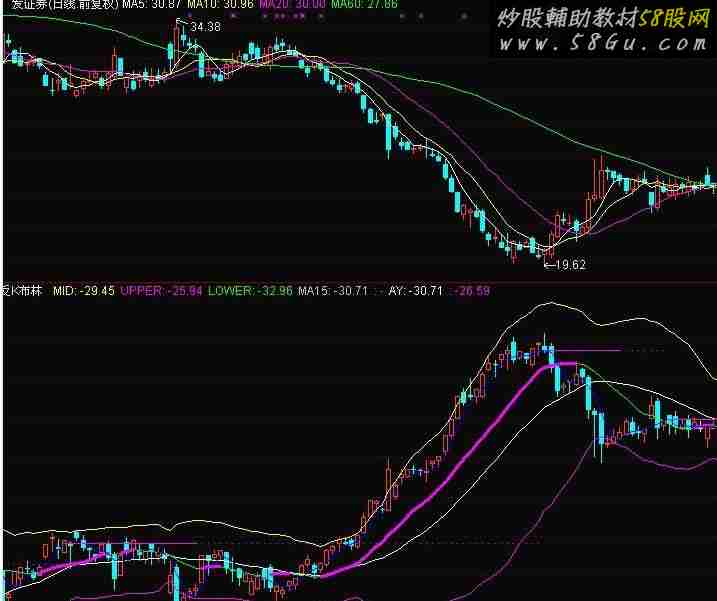 C1:=REVERSE(C); DRAWKLINE(-LOW, -OPEN, -HIGH, -CLOSE);MID : MA(C1,26); UPPER: MID + 2*STD(C1,26); LOWER: MID - 2*STD(C1,26); MA15:MA(C1,15); IF(MA15>REF(MA15,1),MA15,DRAWNULL),LINETHICK3,COLORMAGENTA;AY:MA(C1,4); A3:=REF(AY,10)=HHV(AY,2*10+1); B3:=FILTER(A3,10); C3:=BACKSET(B3,10+1); AD:=FILTER(C3,10); A4:=REF(AY,10)=LLV(AY,2*10+1); B4:=FILTER(A4,10); C4:=BACKSET(B4,10+1); CD:=FILTER(C4,10); E:=REF(AY,BARSLAST(AD)); F:=REF(AY,BARSLAST(CD)); T3:=BARSLAST(AD)<BARSLAST(CD) AND NOT(AD) ; T4:=BARSLAST(AD)>BARSLAST(CD) AND NOT(CD); IF(T3,E,E),COLORFF00FF,POINTDOT; STICKLINE(T3,E,E,10,0),COLORFF00FF;