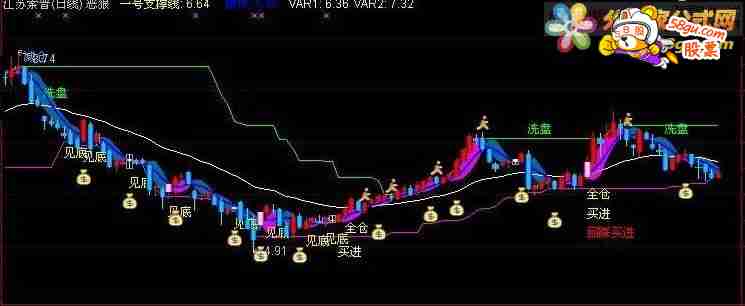 回归斜率线A:=EMA(SLOPE(C,4)*20+C,42); 经典RL:=(CLOSE-LLV(LOW,9))/(HHV(HIGH,9)-LLV(LOW,9))*100; 经典K:=SMA(经典RL,3,1); 经典D:=SMA(经典K,3,1); 经典J:=3*经典K-2*经典D; MAHL1:=100*((EMA((H+L)/2,3)-LLV(EMA((H+L)/2,5),30)-(EMA(H,20)-EMA(L,20))) /(LLV(EMA((H+L)/2,5),30)-(EMA(H,20)-EMA(L,20)))); MAHL2:=IF(EMA(C,2)>回归斜率线A AND MAHL1>0,EMA(C,3),LLV(EMA((H+L)/2,5),30));{A} MAHL3:=IF(EMA(C,2)>回归斜率线A AND MAHL1>0,LLV(EMA((H+L)/2,5),30),EMA(C,5));{A}回归斜率带:DRAWBAND(回归斜率线A,RGB(235,0,230),REF(回归斜率线A,2),RGB(0,104,154));上线:=SMA(C,6.5,1); 一号支撑线:SMA(C,14.5,1); 上线1:=SMA(C,3,1); 一号支撑线1:=SMA(C,8,1); 上线2:=SMA(C,3.5,1); DRAWTEXT(CROSS(一号支撑线1,上线1),H*1.08,'洗盘'),COLOR00FF00; BBI:=(MA(CLOSE,3)+MA(CLOSE,6)+MA(CLOSE,12)+MA(CLOSE,25))/4; UPR:=BBI+3*STD(BBI,13),LINETHICK2; DWN:=BBI-3*STD(BBI,13); 安全:=MA(CLOSE,55),LINETHICK2; LC:=REF(CLOSE,1); RSI:=SMA(MAX(CLOSE-LC,0),6,1)/SMA(ABS(CLOSE-LC),6,1)*100; DRAWTEXT( CROSS(82,RSI) AND CLOSE<上线1 , HIGH*1.04,'减仓') ,COLORFF9966,LINETHICK2; A7:=(2*C+H+L)/4; 操作:MA(A7,5),COLORBLUE,LINETHICK2; 操作1:=MA(A7,5)*1.03,LINETHICK2; 操作2:=MA(A7,5)*0.97,LINETHICK2;DRAWTEXT( CROSS(上线1,上线) AND 上线1>操作,LOW *0.92,'买进' ),COLORYELLOW; VAR1:LLV(A7,21); VAR2:HHV(A7,30); DRAWTEXT( CROSS(上线1,操作) AND 上线1<一号支撑线 AND 上线1<一号支撑线1 AND 上线1<上线 AND CLOSE>VAR1,LOW *0.98,'见底' ),COLORYELLOW; YCX:=操作>=REF(操作,1); H1:=MAX(MAX(上线,一号支撑线1),一号支撑线); L1:=MIN(MIN(上线,一号支撑线1),一号支撑线); DRAWTEXT(CROSS(上线1,一号支撑线1) AND 上线1>操作 ,LOW *0.98,'全仓' ),COLORYELLOW; SK:=EMA((A7-VAR1)/(VAR2-VAR1)*100,7); SD:=EMA(0.667*REF(SK,1)+0.333*SK,5); M1:=1000*操作/一号支撑线<=1015 AND 1000*操作/一号支撑线>=975; M2:=1000*一号支撑线1/一号支撑线<=1020 AND 一号支撑线1/一号支撑线>=980; M3:=1000*上线/一号支撑线<=1015 AND 上线/一号支撑线>=985; DRAWTEXT(IF(COUNT(CLOSE<REF(CLOSE,1),13)/13>6/10 AND COUNT(SK>SD,6) AND REF(LOW,5)=LLV(LOW,120) AND REF(CLOSE>=OPEN,4) AND REF(CLOSE>OPEN,3) AND REF(CLOSE>OPEN,2) AND REF(OPEN>CLOSE,1) AND OPEN>REF(CLOSE,1),1,0),LOW*0.94,'买进') ,COLORYELLOW; D:=MA(CLOSE,89)-MA(CLOSE,10)/3; DRAWTEXT(IF(CLOSE<D AND VOL/240>MA(VOL,5)/240 AND CLOSE>REF(CLOSE,1)*1.08 AND CLOSE<MA(CLOSE,13)*1.3,1,0),LOW*0.88,'抄底'),COLORBROWN; RSV:=(CLOSE-LLV(LOW,25))/(HHV(HIGH,25)-LLV(LOW,25))*100; K:=SMA(RSV,3,1); D1:=SMA(K,3,1); J:=3*K-2*D1; VAR3:=(2*CLOSE+HIGH+LOW)/3;{可将3该为4,信号少点} VAR4:=EMA(EMA(EMA(VAR3,4),4),4);{可将3该为4,信号少点} E:=(VAR4-REF(VAR4,1))/REF(VAR4,1)*100; F:=MA(E,3)+0.03; G:=MA(E,1);DRAWICON(CROSS(F,G) AND J>65,HIGH*1.02,15),COLORGREEN; DRAWICON(CROSS(G,F),LOW *0.9,9),COLORYELLOW;DRAWTEXT(CLOSE>OPEN AND H1<C AND O<L1 AND YCX AND CROSS(上线1,操作) AND LOW>VAR1 AND 上线1>一号支撑线 AND J<90,LOW *0.9,'主升' ),COLORRED;DRAWTEXT( CROSS(上线1,操作) AND M1 AND M2 AND M3,LOW *0.94,'买进' ),COLORYELLOW; DRAWTEXT(CLOSE>OPEN AND 上线>一号支撑线1 AND 一号支撑线1>一号支撑线 AND CLOSE>MA(CLOSE,一号支撑线) AND 操作>=REF(CLOSE,操作) AND CROSS(上线1,操作) AND LOW>VAR1 AND J<90,LOW *0.9,'主升' ),COLORRED; DRAWTEXT(CLOSE>OPEN AND 操作>上线 AND 上线>一号支撑线1 AND 一号支撑线1>一号支撑线 AND CROSS(上线1,操作) AND LOW>VAR1 AND J<90,LOW *0.86,'回踩买进' ),COLORRED; DRAWTEXT(CLOSE>OPEN AND CROSS(上线,一号支撑线) AND LOW>VAR1 AND J<90,LOW *0.86,'回踩买进' ),COLORRED;STICKLINE(CLOSE> REF(CLOSE,1) ,HIGH,LOW,0,0 ),COLORRED; STICKLINE(C<O AND C>REF(C,1),C,O,3,0),COLORFFCC00; STICKLINE(CLOSE> REF(CLOSE,1) AND C>O ,OPEN,CLOSE,3,0 ),COLOR000055;{红K}; STICKLINE(CLOSE> REF(CLOSE,1) AND C>O ,OPEN,CLOSE,2.7,0 ),COLOR000077;{红K}; STICKLINE(CLOSE> REF(CLOSE,1) AND C>O ,OPEN,CLOSE,2.1,0 ),COLOR000099; STICKLINE(CLOSE> REF(CLOSE,1) ,OPEN,CLOSE,1.5,0 ),COLOR0000BB; STICKLINE(CLOSE> REF(CLOSE,1) ,OPEN,CLOSE,0.9,0 ),COLOR0000DD; STICKLINE(CLOSE> REF(CLOSE,1) ,OPEN,CLOSE,0.3,0 ),COLOR0000FF; STICKLINE(CLOSE= REF(CLOSE,1) ,H,L,3,1 ),COLOR999999; STICKLINE(CLOSE= REF(CLOSE,1) ,HIGH,LOW,0,0 ),COLORWHITE; STICKLINE(CLOSE= REF(CLOSE,1) ,OPEN,CLOSE,3,0 ),COLOR555555; STICKLINE(CLOSE= REF(CLOSE,1) ,OPEN,CLOSE,2.7,0 ),COLOR777777; STICKLINE(CLOSE= REF(CLOSE,1) ,OPEN,CLOSE,2.1,0 ),COLOR999999; STICKLINE(CLOSE= REF(CLOSE,1) ,OPEN,CLOSE,1.5,0 ),COLORBBBBBB; STICKLINE(CLOSE= REF(CLOSE,1) ,OPEN,CLOSE,0.9,0 ),COLORDDDDDD; STICKLINE(CLOSE= REF(CLOSE,1) ,OPEN,CLOSE,0.3,0 ),COLORFFFFFF; STICKLINE(CLOSE< REF(CLOSE,1) ,HIGH,LOW,0,1 ),COLORCYAN; STICKLINE(C<REF(C,1) AND C>O,C,O,3,0),COLORFFCC00; STICKLINE(C<REF(C,1) AND C<O ,OPEN,CLOSE,3,0 ),COLOR990000; STICKLINE(C<REF(C,1) AND C<O ,OPEN,CLOSE,2.7,0 ),COLORCC0000; STICKLINE(CLOSE< REF(C,1) ,OPEN,CLOSE,2.1,0 ),COLORFF4400; STICKLINE(CLOSE< REF(C,1) ,OPEN,CLOSE,1.5,0 ),COLORFF8800; STICKLINE(CLOSE< REF(C,1) ,OPEN,CLOSE,0.9,0 ),COLORFFCC00; STICKLINE(CROSS(J,D1) AND J<70,CLOSE,OPEN,3.2,0),COLORBB00FF; STICKLINE(CROSS(J,D1) AND J<70,CLOSE,OPEN,2.7,0),COLORFF33FF; STICKLINE(CROSS(J,D1) AND J<70,CLOSE,OPEN,2.1,0), COLORFF66FF; STICKLINE(CROSS(J,D1) AND J<70,CLOSE,OPEN,1.5,0),COLORFF99FF; STICKLINE(CROSS(J,D1) AND J<70,CLOSE,OPEN,0.9,0),COLORFFBBFF; STICKLINE(CROSS(J,D1) AND J<70,CLOSE,OPEN,0.3,0),COLORFFDDFF;