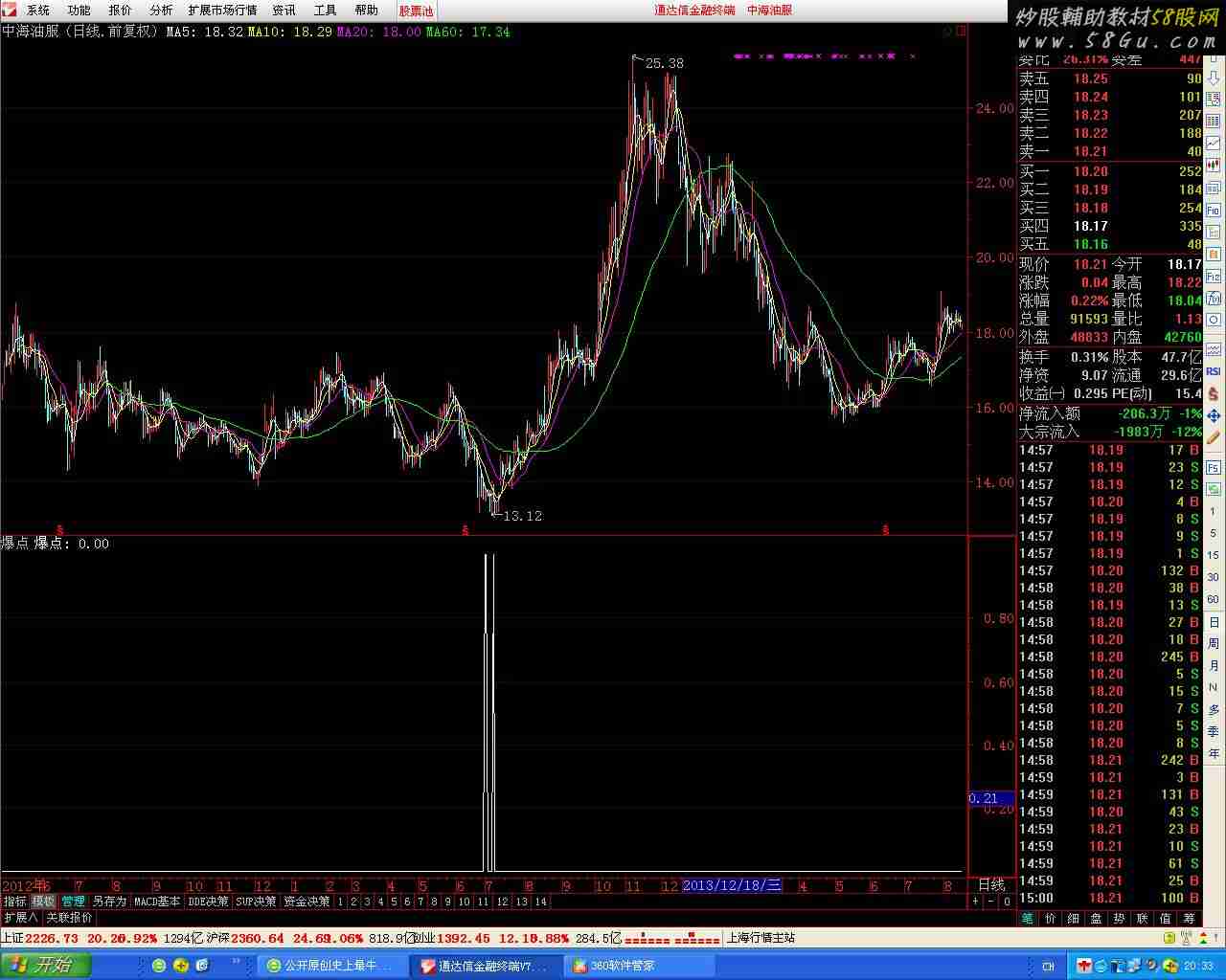 (源码 副图 可以预警)(无源码的请下载附件导入)公开原创史上最牛B选股——最佳炒底爆点(源码 副图 可以预警) 有些朋友不会选股怎么办? 有些朋友不知选的股是牛股或熊股怎么办? 有些朋友选了牛股拿不住怎么办? 有些朋友长期帐户亏损怎么办? 。。。。。。。。。。。。。。。。。。。。。。。。。。。。。。。。。。。。。。。。 不要困惑,不要迷茫,勇敢面对。 本指标对一枝股票一年(360日)只出1,2次信号,甚至不出,一旦出现,长期投资长期持有获利N倍不是梦,拥有此指标,可笑傲股市,笑傲群雄。 特别声明: 1、 本指标不得用于商业用途。 2、 照顾广大同学,不加密、,只发TXT文本。 源码: 日:=360; s:=1; 高1:=REF(HHV(H,日),s); 低1:=REF(LLV(L,日),s); H1:=高1-(高1-低1)*0.969; 零点809:=REFDATE(H1,DATE); 低:=REFDATE(低1,DATE); 爆点: BETWEEN(L,零点809,低+0.106) OR C<=低 ;
