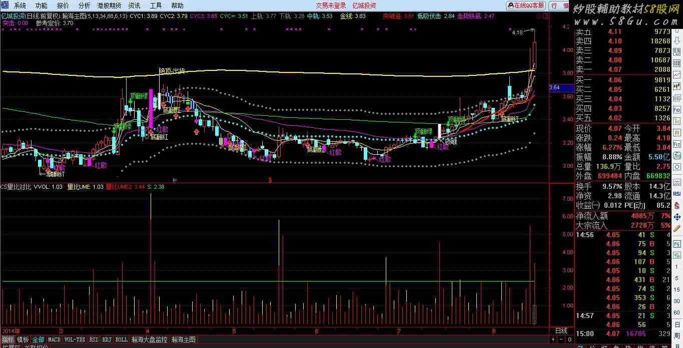 TOTAL:=IF(PERIOD=1,5,IF(PERIOD=2,15,IF(PERIOD=3,30,IF(PERIOD=4,60,IF(PERIOD=5,240,1))))); MTIME:=MOD(FROMOPEN,TOTAL); CTIME:=IF(MTIME<0.5,TOTAL,MTIME); VVOL:IF(CURRBARSCOUNT=1,V/REF(V,1)*TOTAL/CTIME,DRAWNULL),NODRAW; STICKLINE(CURRBARSCOUNT=1 && (SETCODE=0 || SETCODE=1),VVOL,0,-1,-1),COLOR00C0C0; 量比:=V/REF(V,1),COLORYELLOW; 量比UME:量比,STICK,COLORYELLOW; 量比2:=V/REF(V,2),COLORRED; 量比UME2:量比2,STICK,COLORRED; S:2.38,COLORGREEN; |