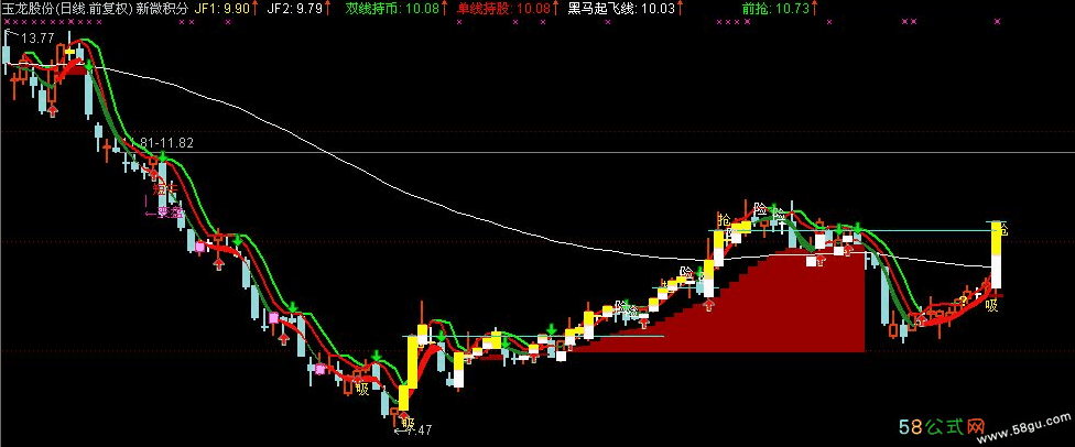 ED1:=(-2*REF(C,2)+REF(C,1)+2*C); ED2:=(-0.4*REF(C,4)-0.4*REF(C,3)-1.1*REF(C,2)+0.9*REF(C,1)+2*C); ED3:=(-0.8*REF(C,4)-0.8*REF(C,3)-0.2*REF(C,2)+0.8*REF(C,1)+2*C); JF1:SMA(SMA(ED1,3,1),3,1),COLORYELLOW; JF2:SMA(SMA(ED2,4,1),3,1),COLORWHITE; BC:=MA(CLOSE,17)+MA(CLOSE,17)-REF(MA(CLOSE,17),1); 突破:=REF(EMA(C,14),1); A1X:=(EMA(C,10)-突破)/突破*100; 基准:=IF(A1X>=0,REF(EMA(C,10),BARSLAST(CROSS(A1X,0))+1),REF(EMA(C,10),BARSLAST(CROSS(0,A1X))+1)); STICKLINE(A1X>=0,基准,突破,5,0),COLOR000099; 分水岭:=IF(MA(CLOSE,17)<BC,BC,MA(CLOSE,17)),COLORFF00FF,LINETHICK2; 操作线:=分水岭-(EMA(C,3)-分水岭),COLOR00FFFF,LINETHICK2; 双线持币:HHV(MA(HIGH,(3)),2),LINETHICK2,COLOR00FF00; 单线持股:LLV(MA(HIGH,(3)),1),LINETHICK2,COLOR0000FF; 黑码起飞线:EXPMA(CLOSE,89),COLORWHITE,LINETHICK1; DRAWBAND(JF1,RGB(255,10,10),JF2,RGB(35,135,30)); DRAWICON(CROSS(ED2,JF2),L/1.001,1); DRAWICON(CROSS(JF2,ED2),H*1.001,2); ①价:=EMA(CLOSE,16)-EMA(CLOSE,26); ②价:=EMA(①价,9); MAV:=(C*2+H+L)/4; SK := EMA(MAV,1) - EMA(MAV,40); SD := EMA(SK,5); B:=(SK-SD)*100; 猛牛拉升:=IF(B<-20,-20,IF(B>100,100,B)),COLORRED,LINETHICK2; STICKLINE(猛牛拉升>=10 AND ①价>②价 AND ①价>REF(①价,1),O,C,3,0),COLORYELLOW; VL:=REF(LOW,1); VAR12:=(SMA(ABS(LOW-VL),13,1))/(SMA(MAX(LOW-VL,0),13,1))*100; VAR14:=MA(VAR12,13); VAR15:=LLV(LOW,34); VAR18:=EMA(IF(LOW<=VAR15,VAR14,0),3); VAR110:=SMA(SMA((CLOSE-LLV(LOW,54))/(HHV(HIGH,54)-LLV(LOW,54))*100,7,1),5,1); VAR111:=SMA((CLOSE-LLV(LOW,54))/(HHV(HIGH,54)-LLV(LOW,54))*100,7,1)*16.18-VAR110*10.9; T:=FILTER(IF(VAR111<=VAR110 AND VAR18>REF(VAR18,1),VAR18*8,0),20); DRAWTEXT(T,LOW-0.4,'←变盘'),COLORFF00FF; DRAWTEXT(T,LOW-0.2,'|'),COLORFF00FF; VAR1:=C-REF(C,1); VAR2:=100*EMA(EMA(VAR1,6),6)/EMA(EMA(ABS(VAR1),6),6); BT:=(LLV(VAR2,2)=LLV(VAR2,7) AND COUNT(VAR2<0,2) AND CROSS(VAR2,MA(VAR2,2))); DRAWTEXT(BT AND CROSS(VAR111,20),L*0.99,'短牛'),COLOR0000FF; DIF:=EMA(DCLOSE,12)-EMA(DCLOSE,26); DEA:=EMA(DIF,9); AAA:=(DIF-DEA)*2*60; BBB:=AAA-REF(AAA,1); 起爆:=CROSS(BBB,15),COLORWHITE,LINETHICK2; DRAWTEXT(起爆,L*0.98,'暴'),COLORYELLOW,LINETHICK2; VAR3:=(2*CLOSE+HIGH+LOW)/4; VAR4:=LLV(LOW,34); VAR5:=HHV(HIGH,34); 趋势:= EMA((VAR3-VAR4)/(VAR5-VAR4)*100,13),LINETHICK2,COLORRED; 人气:=EMA(0.667*REF(趋势,1)+0.333*趋势,2),LINETHICK2,COLORYELLOW; DRAWTEXT(CROSS(趋势,人气) AND 趋势<15 AND BT AND VAR111>=20,L*0.98,'牛吸'),COLORYELLOW; 发:=(CLOSE*2+HIGH+LOW)/4*10; 孙:=EMA(发,13)-EMA(发,34); 金1:=EMA(孙,5); 顺:=2*(孙-金1)*5.5; 主力拉:=IF(CLOSE<0,0,IF(顺>=0,顺,0)),LINETHICK2,COLOR0000FF; 底部1:=7.0,COLOR70DB93; 前抢:REF(C,BARSLAST(CROSS(主力拉,底部1))),COLOR00FF00,POINTDOT; DRAWTEXT(CROSS(主力拉,底部1),H,'抢'),COLORYELLOW; STICKLINE(C,前抢,前抢,8,0)LINETHICK2,COLORCYAN; B1:=(HHV(H,35)-C)/(HHV(H,35)-LLV(LOW,35))*100-35; B2:=SMA(B1,35,1)+100; B3:=(C-LLV(L,35))/(HHV(H,35)-LLV(L,35))*100; B4:=SMA(B3,3,1); B5:=SMA(B4,3,1)+100; B6:=B5-B2; 控盘程度:=(IF(B6>1,B6-1,0))*2.5,COLORRED,LINETHICK2; 控盘上:=IF(控盘程度>REF(控盘程度,1), 控盘程度,DRAWNULL), STICK,COLORYELLOW,LINETHICK1; 控盘下:=IF(控盘程度<REF(控盘程度,1), 控盘程度,DRAWNULL), STICK,COLORFF9900,LINETHICK1; DRAWTEXT(猛牛拉升>=10 AND 控盘下>0,H*1.01,'?'),COLORYELLOW; DRAWTEXT(控盘上>REF(控盘上,1) AND 控盘程度>100 AND C<REF(C,1)AND C<O,H*1.01,'险'),COLORWHITE; DIFF:=EMA(CLOSE,3)-EMA(CLOSE,8); A1:=EMA(DIFF,5)*100; A2:=((EMA(CLOSE,3)-EMA(CLOSE,8)))*100; DRAWTEXT(CROSS(趋势,人气) AND 趋势<40 AND 猛牛拉升>=10 AND A2>A1 ,L,'吸'),COLORYELLOW; 止跌:=(REF(EVERY(C<O,2),1) AND C>O); VAR1N:=MA(CLOSE,5),; VAR2N:=MA(CLOSE,10); VAR3N:=(VAR1N-CLOSE)/CLOSE>3/100; VAR4N:=(VAR2N-VAR1N)/VAR1N>0.03; VAR5N:=LLV(CLOSE,30)=LLV(CLOSE,120); 底部:=VAR3N AND VAR4N AND VAR5N; 包赚不赔:=BARSLAST(底部)<=2 AND 止跌; STICKLINE(包赚不赔,O,C,3,0),COLORMAGENTA; CCI:=CCI(84),COLORWHITE; DRAWTEXT(包赚不赔 AND CCI>REF(CCI,1),L,'包'),COLORWHITE; 快枪手:=(CLOSE-MA(CLOSE,24))/MA(CLOSE,24)*100,LINETHICK2,COLORRED;STICKLINE(快枪手>0 AND 快枪手>REF(快枪手,1),OPEN,(OPEN+CLOSE)/2,3,0),COLORWHITE;