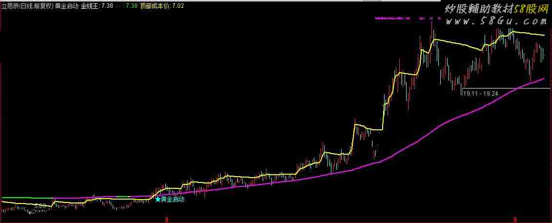 前期发了一个金K线指标深受大家喜爱,这次在其基础上稍加修改,结合筹码,发一黄金启动指标,抓主升浪,喜欢就多关注A1:=ABS(((3.48*CLOSE+HIGH+LOW)/4-EMA(CLOSE,20))/EMA(CLOSE,20)); A2:=DMA(((2.15*CLOSE+LOW+HIGH)/4),A1); 金线王:EMA(A2,200)*1.118 ,LINETHICK2,COLORWHITE;IF((金线王>=REF(金线王,1)),金线王,DRAWNULL),LINETHICK2,COLORMAGENTA;IF((金线王<=REF(金线王,1)),金线王,DRAWNULL),LINETHICK2,COLORGREEN;底部:=(COST(95)-COST(5))/(COST(95)+COST(5))*100;顶部:=100-底部;均值:=(底部+顶部)/2;顶部成本价:COST(顶部),COLORYELLOW,DOTLINE,LINETHICK2;WW:=CROSS(顶部成本价,金线王) AND REF(金线王,1)<金线王;DRAWTEXT(WW,L*0.98,'★黄金启动')COLORCYAN;