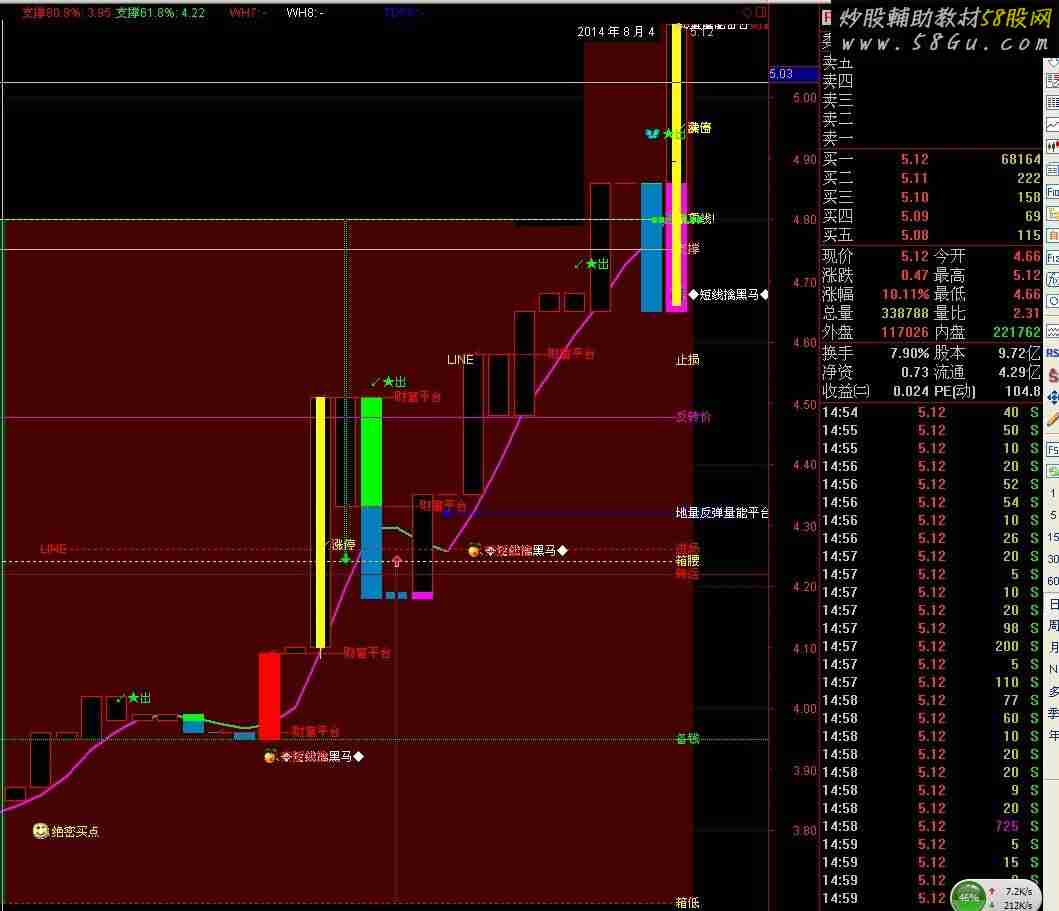 {布林+宝塔+蓝灰操盘主图帅男版}NA:=STRCAT(CON2STR(YEAR,0),' 年 '); YA:=STRCAT(CON2STR(MONTH,0),' 月 '); RA:=STRCAT(CON2STR(DAY,0),' 日 '); SJ:=STRCAT(STRCAT(NA,YA), RA); DRAWTEXT_FIX(C>0,0.88,0,0,SJ);{布林+宝塔+蓝灰操盘}{蓝灰底}买线:=EMA(C,2); 卖线:=EMA(SLOPE(C,21)*20+C,42); STICKLINE(买线>=卖线,HHV(H,60),LLV(L,60),5,0),COLOR000045;STICKLINE(买线<卖线,HHV(H,60),LLV(L,60),5,0),COLOR004500;{红轨道}红轨道:=MA(MA(CLOSE,3),1),LINETHICK1,COLORYELLOW;轨道:MA(MA(CLOSE,3),3),COLOR32CD32,LINETHICK2;SHENG:=IF(红轨道>=轨道,轨道,DRAWNULL);升:SHENG,COLORMAGENTA,LINETHICK2;{变色K线}N1:=14;M:=6;TR1:=EXPMEMA(MAX(MAX(HIGH-LOW,ABS(HIGH-REF(CLOSE,1))),ABS(REF(CLOSE,1)-LOW)),N1);HD :=HIGH-REF(HIGH,1);LD :=REF(LOW,1)-LOW;DMP:=EXPMEMA(IF(HD>0&&HD>LD,HD,0),N1);DMM:=EXPMEMA(IF(LD>0&&LD>HD,LD,0),N1);PDI:=DMP*100/TR1,LINETHICK2;MDI:=DMM*100/TR1;ADX:=EXPMEMA(ABS(MDI-PDI)/(MDI+PDI)*100,M);ADXR:=EXPMEMA(ADX,M);VAR1:=CLOSE>REF(CLOSE,1) AND CLOSE>REF(CLOSE,2);VAR2:=REF(VAR1,1) AND CLOSE<=REF(CLOSE,1) AND CLOSE>=REF(CLOSE,2);VAR3:=REF(VAR2,1) AND CLOSE>=REF(CLOSE,1) AND CLOSE<=REF(CLOSE,2);VAR4:=REF(VAR3,1) AND CLOSE<=REF(CLOSE,1) AND CLOSE>=REF(CLOSE,2);VAR5:=REF(VAR4,1) AND CLOSE>=REF(CLOSE,1) AND CLOSE<=REF(CLOSE,2);VAR6:=REF(VAR5,1) AND CLOSE<=REF(CLOSE,1) AND CLOSE>=REF(CLOSE,2);VAR7:=REF(VAR6,1) AND CLOSE>=REF(CLOSE,1) AND CLOSE<=REF(CLOSE,2);VAR8:=REF(VAR7,1) AND CLOSE<=REF(CLOSE,1) AND CLOSE>=REF(CLOSE,2);VAR9:=REF(VAR8,1) AND CLOSE>=REF(CLOSE,1) AND CLOSE<=REF(CLOSE,2);VARA:=REF(VAR9,1) AND CLOSE<=REF(CLOSE,1) AND CLOSE>=REF(CLOSE,2);VARB:=REF(VARA,1) AND CLOSE>=REF(CLOSE,1) AND CLOSE<=REF(CLOSE,2);VARC:=REF(VARB,1) AND CLOSE<=REF(CLOSE,1) AND CLOSE>=REF(CLOSE,2);STICKLINE(VAR1 OR VAR2 OR VAR3 OR VAR4 OR VAR5 OR VAR6 OR VAR7 OR VAR8 OR VAR9 OR VARA OR VARB OR VARC,CLOSE,REF(CLOSE,1),3,1),COLOR0000FF; VARD:=CLOSE<REF(CLOSE,1) AND CLOSE<REF(CLOSE,2);VARE:=REF(VARD,1) AND CLOSE>=REF(CLOSE,1) AND CLOSE<=REF(CLOSE,2);VARF:=REF(VARE,1) AND CLOSE<=REF(CLOSE,1) AND CLOSE>=REF(CLOSE,2);VAR10:=REF(VARF,1) AND CLOSE>=REF(CLOSE,1) AND CLOSE<=REF(CLOSE,2);VAR11:=REF(VAR10,1) AND CLOSE<=REF(CLOSE,1) AND CLOSE>=REF(CLOSE,2);VAR12:=REF(VAR11,1) AND CLOSE>=REF(CLOSE,1) AND CLOSE<=REF(CLOSE,2);VAR13:=REF(VAR12,1) AND CLOSE<=REF(CLOSE,1) AND CLOSE>=REF(CLOSE,2);VAR14:=REF(VAR13,1) AND CLOSE>=REF(CLOSE,1) AND CLOSE<=REF(CLOSE,2);VAR15:=REF(VAR14,1) AND CLOSE<=REF(CLOSE,1) AND CLOSE>=REF(CLOSE,2);VAR16:=REF(VAR15,1) AND CLOSE>=REF(CLOSE,1) AND CLOSE<=REF(CLOSE,2);VAR17:=REF(VAR16,1) AND CLOSE<=REF(CLOSE,1) AND CLOSE>=REF(CLOSE,2);VAR18:=REF(VAR17,1) AND CLOSE>=REF(CLOSE,1) AND CLOSE<=REF(CLOSE,2);STICKLINE(VARD OR VARE OR VARF OR VAR10 OR VAR11 OR VAR12 OR VAR13 OR VAR14 OR VAR15 OR VAR16 OR VAR17 OR VAR18,CLOSE,REF(CLOSE,1),3,0),COLORC08000; VAR19:=REF(VARD OR VARE OR VARF OR VAR10 OR VAR11 OR VAR12 OR VAR13 OR VAR14 OR VAR15 OR VAR16 OR VAR17 OR VAR18,1) AND VAR1;STICKLINE(VAR19,REF(CLOSE,1),REF(CLOSE,2),3,0),COLORMAGENTA ; VAR1A:=REF(VAR1 OR VAR2 OR VAR3 OR VAR4 OR VAR5 OR VAR6 OR VAR7 OR VAR8 OR VAR9 OR VARA OR VARB OR VARC,1) AND VARD;STICKLINE(VAR1A,REF(CLOSE,1),REF(CLOSE,2),3,0) ,COLOR00FF00; }{箱体线}N:=7;T1:=CONST(LLVBARS(LOW,N));T1HIGH:=CONST(REF(HIGH,T1));CC:=CONST(CURRBARSCOUNT);T2:=CONST(BARSLAST((CURRBARSCOUNT >(CC+T1)) AND (HIGH>T1HIGH)));T2HIGH:=CONST(REF(HIGH,T2));T3:=CONST(BARSLAST((CURRBARSCOUNT >(CC+T2)) AND (HIGH>T2HIGH)));T3HIGH:=CONST(REF(HIGH,T3));突破杀入线:DRAWLINE(CURRBARSCOUNT=T3+1, T3HIGH, ISLASTBAR, T3HIGH, 1),LINETHICK1,COLORYELLOW;DRAWTEXT(ISLASTBAR, T3HIGH, '杀入线!'),LINETHICK1,COLORYELLOW;AB:=EMA(((2*C+H+L)/4-LLV(LOW,30))/(HHV(HIGH,30)-LLV(LOW,30))*100,8); BA:=EMA(AB,5); A1{高}:=REFDATE(REF(HHV(H,96),5),DATE); B1{低}:=REFDATE(REF(LLV(L,96),5),DATE); DY{中}:=((A1)+(B1))/2; 箱顶:IF(AB>0 AND AB-BA<=0,A1,A1),COLORGREEN,DOTLINE; 箱腰:IF(AB>0 AND AB-BA<=0,DY,DY),COLORYELLOW,DOTLINE; 箱低:IF(AB>0 AND AB-BA<=0,B1,B1),COLORRED,DOTLINE; DRAWTEXT(ISLASTBAR,箱顶,'箱顶'),COLORYELLOW;DRAWTEXT(ISLASTBAR,箱腰,'箱腰'),COLORYELLOW;DRAWTEXT(ISLASTBAR,箱低,'箱低'),COLORYELLOW;VARAA:=IF(CLOSE>150,91.3,0.913);{突破:INTPART(CLOSE/VARAA )*VARAA,POINTDOT,LINETHICK4,COLORRED; 再突破:突破+VARAA,POINTDOT,LINETHICK4,COLOR00FF00 ;回踩:(突破+再突破)/2,POINTDOT,COLORWHITE,LINETHICK4;}STICKLINE(CROSS(ZIG(3,5),REF(ZIG(3,5),1)),箱低,箱腰,0.1,-1),COLORRED;STICKLINE(CROSS(REF(ZIG(3,5),1),ZIG(3,5)),箱顶,箱腰,0.1,-1),COLORGREEN;DRAWICON(CROSS(ZIG(3,5),REF(ZIG(3,5),1)),箱腰,1);DRAWICON(CROSS(REF(ZIG(3,5),1),ZIG(3,5)),箱腰,2);DRAWTEXT_FIX(CURRBARSCOUNT=1,0.02,0.01,0,'K线底部出红色或粉色,可低吸建仓!'),COLORRED;DRAWTEXT_FIX(CURRBARSCOUNT=1,0.02,0.05,0,'绿点表示长期的压力点!'),COLORGREEN;DRAWTEXT_FIX(CURRBARSCOUNT=1,0.02,0.10,0,'白点表示中短期的压力和支撑点,'),COLORGREEN;DRAWTEXT_FIX(CURRBARSCOUNT=1,0.02,0.16,0,'红点表示有效支撑或突破长中短期压力点!股价向下跌破,原则清仓!'),COLORGREEN;EE:=(H+L+O+2*C)/5; CRTP:=EE+(H-L); CRZL:=2*EE-L; CRZC:=2*EE-H; CRFZ:=EE-(H-L); 高:CONST(CRTP),COLORRED;阻:CONST(CRZL),COLORC7C9FF;支:CONST(CRZC),COLOR7C9CFF;反:CONST(CRFZ),COLORDD00DD;DRAWTEXT(ISLASTBAR, 反, '反转价'),LINETHICK1,COLORDD00DD;DRAWTEXT(ISLASTBAR, 支, '支撑'),LINETHICK1,COLOR7C9CFF;DRAWTEXT(ISLASTBAR, 阻, '阻力'),LINETHICK1,COLORC7C9FF;DRAWTEXT(ISLASTBAR, 高, ' 高破线'),LINETHICK1,COLORGREEN;均线:=EXPMA(C,12),COLORGRAY,LINETHICK2;日:=50;昨前:=3; 高2:=REF(HHV(H,日),昨前); 低2:=REF(LLV(L,日),昨前); H4:=高2-(高2-低2)*0.618; H5:=高2-(高2-低2)*0.809; 支撑80.9%:REFDATE(H5,DATE),COLORRED; 支撑61.8%:REFDATE(H4,DATE),COLORGREEN,; STICKLINE(CURRBARSCOUNT=1,支撑80.9%,支撑80.9%,300,-1),COLORGREEN; STICKLINE(CURRBARSCOUNT=1,支撑61.8%,支撑61.8%,300,-1),COLORRED; DRAWTEXT(CURRBARSCOUNT=1 AND 支撑80.9%,支撑80.9%,'备钱'),COLORGREEN;DRAWTEXT(CURRBARSCOUNT=1 AND 支撑61.8%,支撑61.8%,'转运'),COLORRED;WH1:=IF(L=LLV(L,9),L,0);WH2:=CO