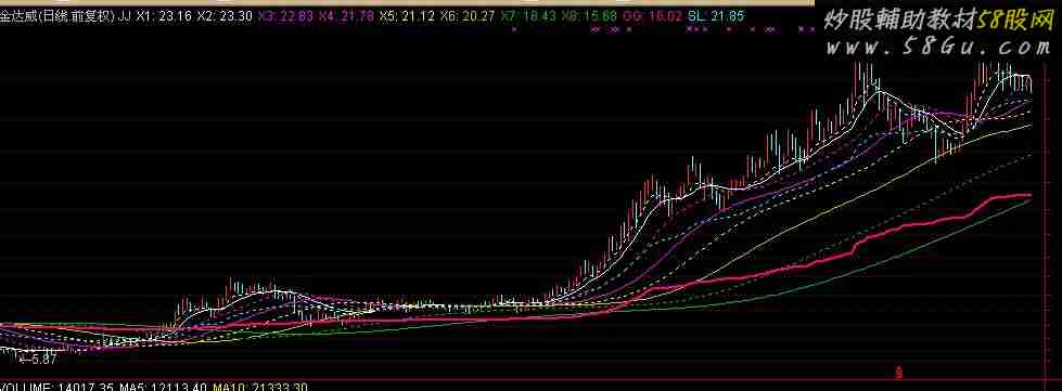 本指标为通达信,下面贴图二张,一张为通达信,另一张为飞狐。通达信里可能会出现的问题在此作一说明,本人解决不了,如果有高手能解决更好。在通达信里的问题有二点,一是用来分析大盘的话,近期的均线会变形,而在飞狐不存在此问题;二是有的个股GG线会出现移动,你用较长时间看时就能发现,有的个股不存在此问题,飞狐也不存在此问题。用法说明,一是观察均线的粘合;二是关注均线的网格,可从网格中发现平行四边形战法;三是注意GG线和SL线的作用。另外说明,飞狐版本的贴图与本指标有差别,主要是多其它均线和成本均线。市均价:=((H+L)/2*0.382+(C+O)/2*0.618);均价:=AMOUNT/(VOL*100);重心:=IF(INDEXC,市均价,(市均价+均价)/2);相对高:=(重心*0.191+H*0.809);相对低:=(重心*0.191+L*0.809);折价:=(重心*0.191+C*0.809);DLB:=(((SUM(VOL,3)/REF(SUM(VOL,18),1))+(SUM(VOL,12)/REF(SUM(VOL,72),1)))/2+(SUM(VOL,6)/REF(SUM(VOL,36),1)))/2;X1:DMA(折价,DLB),COLORWHITE,DOTLINE;X2:EMA(X1,6)*(1+2/700),COLORWHITE,LINETHICK1;X3:EMA(X2,12)*(1+2/1300),COLORMAGENTA,DOTLINE;X4:EMA(X3,18)*(1+2/1900),COLORMAGENTA,LINETHICK1;X5:EMA(X4,18)*(1+2/1900),COLORYELLOW,DOTLINE;X6:EMA(X5,30)*(1+2/3100),COLOR00CCCC,LINETHICK1;X7:EMA(X6,42)*(1+2/4300),COLOR00BB00,DOTLINE;X8:EMA(X7,54)*(1+2/5500),COLOR00BB00,LINETHICK1;JJ:=ABS(X1/REF(X1,1)-1);GG:DMA(X1,JJ),COLOR7F00FF,LINETHICK2;大:=MAX(X1,MAX(X2,MAX(X3,MAX(X4,MAX(X5,MAX(X6,MAX(X7,X8)))))));小:=MIN(X1,MIN(X2,MIN(X3,MIN(X4,MIN(X5,MIN(X6,MIN(X7,X8)))))));ZZX:=(((((X1+X8)/2+(X2+X7)/2)/2+(X3+X6)/2)/2+(X4+X5)/2)/2+(大+小)/2)/2;多空线:=(ZZX+(X1+X2+X3+X4+X5+X6+X7+X8)/8)/2;SL:多空线+(X1-X2+X3-X4+X5-X6+X7-X8+(大-小)/4)/5,COLORCYAN,DOTLINE; |