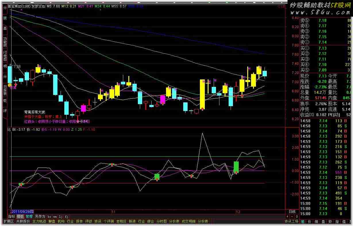 BI:EMA((C-REF(C,1))/C*100-(INDEXC-REF(INDEXC,1))/INDEXC*100,5); 价:EMA(MA((((C-REF(C,1))+(H-REF(H,1))+(L-REF(L,1)))/3)/C,5),1)*50; 价5:MA(价,5);W:0,COLORFF00FF; Z:1.25,COLORGREEN; F:-1.1,COLORRED; STICKLINE(CROSS(BI,价) ,BI,价,3,0),COLOR32CD32 ; DRAWICON(CROSS(BI,价),价,1);选股: BI:=EMA((C-REF(C,1))/C*100-(INDEXC-REF(INDEXC,1))/INDEXC*100,5); 价:=EMA(MA((((C-REF(C,1))+(H-REF(H,1))+(L-REF(L,1)))/3)/C,5),1)*50; 价5:=MA(价,5); CROSS(BI,价5) AND CROSS(价,价5) ;