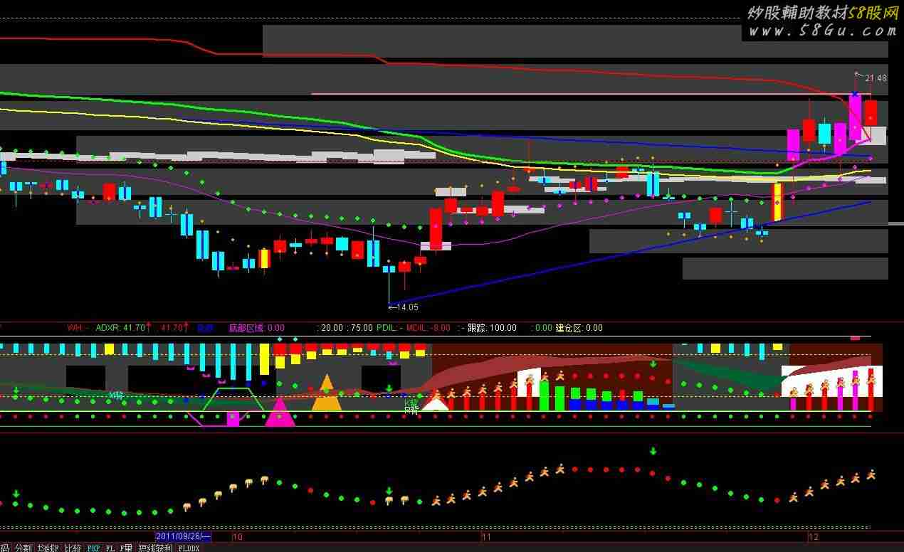 MTR:=EXPMEMA(MAX(MAX(HIGH-LOW,ABS(HIGH-REF(CLOSE,1))),ABS(REF(CLOSE,1)-LOW)),14); HD :=HIGH-REF(HIGH,1); LD :=REF(LOW,1)-LOW; DMP:=EXPMEMA(IF(HD>0&&HD>LD,HD,0),14); DMM:=EXPMEMA(IF(LD>0&&LD>HD,LD,0),14); PDI:= DMP*100/MTR; MDI:= DMM*100/MTR; DM:=PDI-MDI,NODRAW; TRR1:=EMA(MAX(MAX(H-L,ABS(H-REF(C,1))),ABS(REF(C,1)-L)),14); DMP1:=EMA(IF(HD>0 && HD>LD,HD,0),14); DMM1:=EMA(IF(LD>0 && LD>HD,LD,0),14); ADX0:=EMA((DMP1-DMM1)/(DMP1+DMM1)*100,6); ADXR0:=EMA(ADX0,6); PDI1:=DMP1/TRR1*100; MDI1:=DMM1/TRR1*100; DM1:=PDI1-MDI1; AAJ:=(3*ADX0-2*ADXR0); MAAD:=(ADX0-ADXR0),NODRAW; ADX:=EXPMEMA(ABS(MDI-PDI)/(MDI+PDI)*100,6),COLORFF00FF; ADXR:EXPMEMA(ADX,6),POINTDOT,LINETHICK7,COLORGREEN; IF(DM>0,ADXR,DRAWNULL),POINTDOT,LINETHICK7,COLORRED; 助涨:DRAWICON(DM>0 AND ADX>ADXR AND ADX>20,ADXR,15); 助跌:DRAWICON(DM<0 AND ADX>ADXR AND ADX>20,ADXR,12); DRAWICON(CROSS(ADXR0,ADX0) AND ADXR0>60 ,ADXR*1.2,8); DRAWICON(CROSS(ADXR0,ADX0) AND ADXR0<60 ,ADXR*1.4,2); 20,COLORYELLOW,DOTLINE; 60,COLORGREEN,DOTLINE;