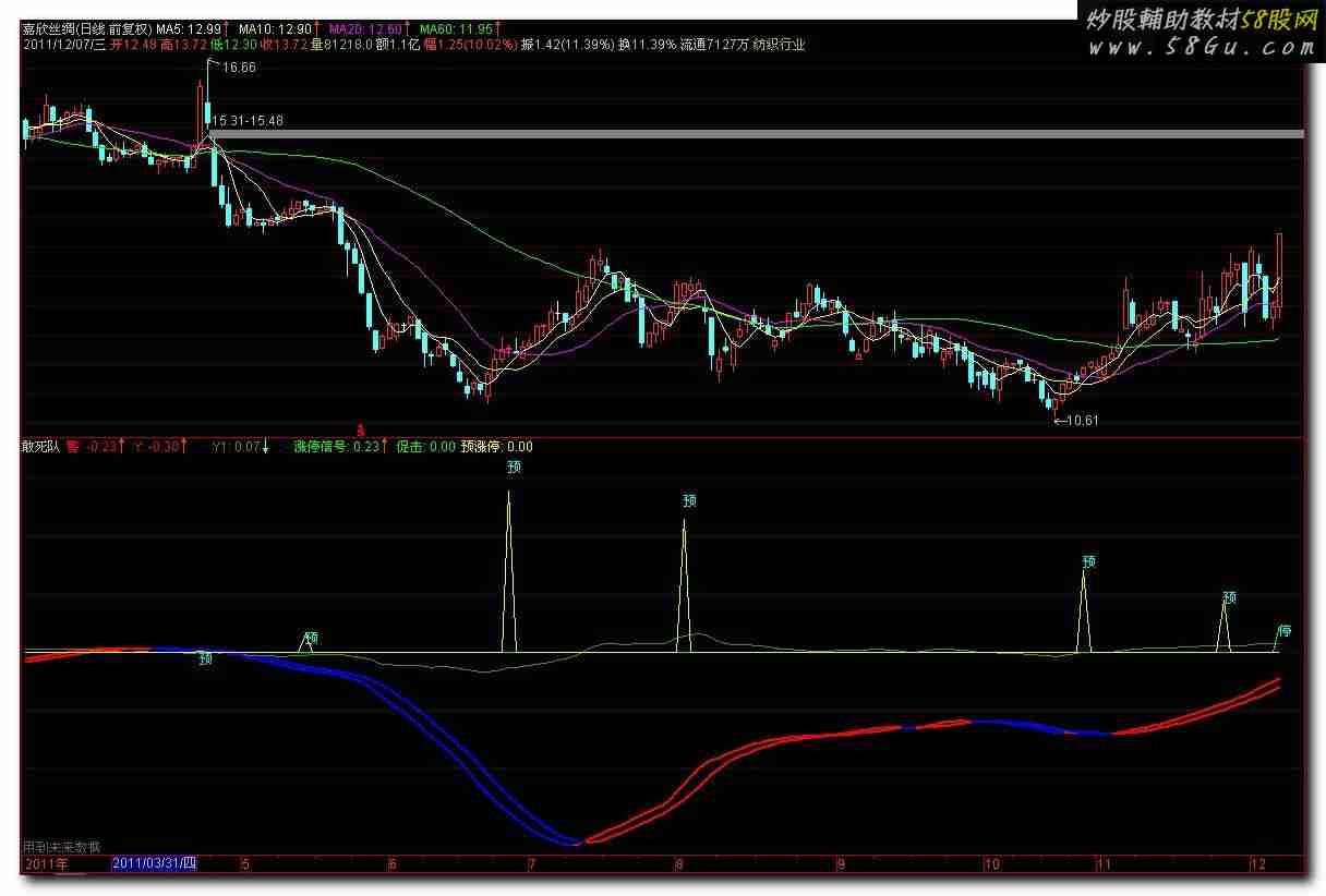 R1:=150*WINNER(CLOSE*0.95); VAR3:=EMA(100*(CLOSE-LLV(LOW,100))/(HHV(HIGH,100)-LLV(LOW,100)),5); VAR4:=(CLOSE-LLV(CLOSE,126))/(HHV(CLOSE,126)-LLV(CLOSE,126))*100; VAR5:=EMA(CLOSE,2)-EMA(CLOSE,120); VAR6:=EMA(VAR5,68); VAR7:=(VAR5+VAR6); 敢死:=POW(VAR7,3)*0.1+POW(VAR7,1); 核心:=MA(敢死,30),COLORRED,; 涨停:=1;{DYNAINFO(14)>0.096;} 警:涨停*核心/5,COLORRED,LINETHICK2; Y:MA(警,6),COLORRED,LINETHICK2; IF(Y<REF(Y,1),Y,DRAWNULL),COLORBLUE,LINETHICK2; Y1:警-Y,COLORBROWN; IF(警<REF(警,1),警,DRAWNULL),COLORBLUE,LINETHICK2; {STICKLINE(CROSS(MA(警,1),MA(警,2)),0,警,1,0),COLORYELLOW;} G:=C>=INTPART(REF(C ,1 )*1.08*100+0.5)/100; G1:=G*核心/5; RSV:=(CLOSE-LLV(LOW,9))/(HHV(HIGH,9)-LLV(LOW,9))*100; K:=(SMA(RSV,3,1)); D:=(SMA(K,3,1)); KK:=INTPART(SMA(RSV,3,1)); DD:=INTPART(SMA(K,3,1)); N:=KK+DD; 涨停信号:ABS((10000*(C-REF(C,1))/REF(C,1)>995)*G1),COLORGREEN; 促击:FILTER(BACKSET(涨停信号,2),2)*G1,COLORGREEN; 预涨停:IF(CROSS(N,100),ABS(警),0),COLORYELLOW; DRAWTEXT(CROSS(N,100),预涨停*1.2,'预'),COLORCYAN; DRAWTEXT(涨停信号>0,涨停信号*1.1,'停'),COLORCYAN;