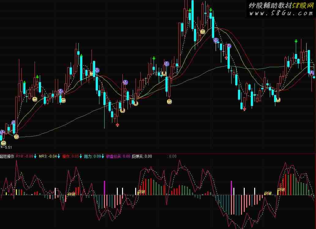 {超短线操作} A1:=(C-LLV(L,18))/(HHV(H,18)-LLV(L,18)); R18:A1-0.5,COLORLIMAGENTA; MR3:MA(R18,3),COLORYELLOW,DOTLINE; 操作:EMA(A1,5)-0.5,COLORRED,NODRAW; 阻力:EMA(A1,21)-0.5,COLORCYAN,NODRAW; 棒:=(操作-阻力),COLORSTICK; 收盘价买:C<REF(C,1) AND A1>REF(A1,1),COLORMAGENTA,NODRAW; 反弹买:REF(棒<0,1) AND REF(COUNT(CROSS(R18,MR3),6)=1,1)AND CROSS(R18,MR3)AND 棒>REF(棒,1),COLORWHITE,NODRAW; STICKLINE(棒>0,0,棒,0.1,0),COLORRED; STICKLINE(棒<0,0,棒,0.1,1),COLORLICYAN; STICKLINE(棒>0 AND 棒<REF(棒,1),0,棒,0.1,1),COLORLIGREEN; STICKLINE(棒<0 AND 棒>REF(棒,1),0,棒,0.1,0),COLORLIRED; STICKLINE(CROSS(操作,阻力),0,棒,0.1,0),COLORYELLOW; DRAWTEXT(CROSS(操作,阻力) AND 阻力<0.1,棒,'突破'),COLORYELLOW; DRAWTEXT(CROSS(阻力,操作) AND 阻力>0.25,棒,'破位'),COLORGREEN; STICKLINE(收盘价买=1,0,0.2,0.1,0),COLORMAGENTA; STICKLINE(反弹买=1,0,0.1,0.1,0),COLORWHITE; 0,COLORGRAY,DOTLINE;