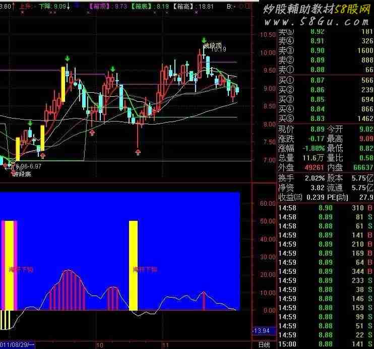 STICKLINE(18,66,0,5,0),COLORBLUE;VAR1:="DMI.PDI"(12,6); VAR2:="DMI.MDI"(12,6); VAR3:=VAR1>65 AND VAR1>REF(VAR1,1); VAR4:=LLV(VAR1,0); VAR5:=BARSLAST(VAR4=VAR1); VAR6:=(0-REF(VAR2,4))/(VAR4-REF(VAR2,VAR5))>2; VAR7:=VAR1>REF(VAR1,1); VAR8:=VOL>2*MA(VOL,30); VAR9:="DMI.ADX"(12,6); VARA:="DMI.ADXR"(12,6); VARB:=CLOSE>MA(CLOSE,30) AND CLOSE<MA(CLOSE,30)*1.04; VARC:=MA(CLOSE,30)>REF(MA(CLOSE,30),1); VARD:=BARSLAST(CROSS(MA(CLOSE,5),MA(CLOSE,10)))<BARSLAST(CROSS(MA(CLOSE,10),MA(CLOSE,5))); VARE:=0-"MACD.DIF"(7,21,3); VARF:=TROUGHBARS(3,15,1)<4; VAR10:=EMA(CLOSE,30)>REF(EMA(CLOSE,30),2); VAR11:=IF(VARF=1,50,0); VAR12:=CROSS(VAR2,VAR1) AND CROSS(VARA,VAR9); VAR13:=CROSS(VAR2,VAR1) AND CROSS(VAR9,VARA); VAR14:=VARB AND VARC AND VARD AND VAR10 AND VAR6 AND VAR7 AND VAR8*50; VAR15:=BARSLAST(CROSS(VAR2,VAR1)=1); VAR16:=BARSLAST(CROSS(VAR1,VAR2)=1); VAR17:=HHV(VAR1,VAR16); VAR18:=BARSLAST(VAR1=VAR17); 多空:EMA((CLOSE-MA((2*CLOSE+HIGH+LOW)/4,30))/MA((2*CLOSE+HIGH+LOW)/4,30)*100,3),COLORWHITE; 0,COLORRED; STICKLINE(FILTER(VARF=1,5) AND 多空<-10,50,0,15,0),COLORF00FF0; STICKLINE(FILTER(VARF=1,5),50,0,8,0),COLORYELLOW; VAR19:=VAR3 OR VAR12 OR VAR13*100; VAR1A:=VAR13*100; DRAWTEXT(FILTER(VARF=1,3),25,'海杆下钩'),COLORRED; STICKLINE(多空<-10,0,多空,0.85,0),COLORYELLOW; STICKLINE(多空>10,0,多空,0.95,0),COLORRED;