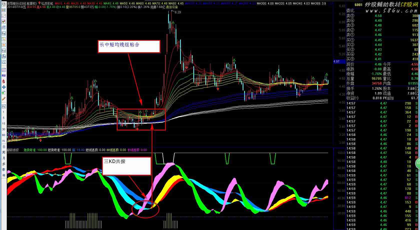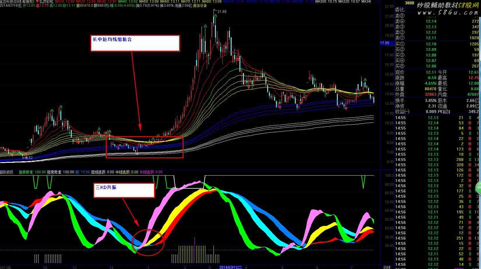 超级波段指标 本指标由21KD,35KD,55KD组成,体现长中短趋势!利用三KD共振买入!如果再,结合均线粘合买入更隹!抓到大、中黑马不再是梦! 上下卖出符号结合,提示长中短頂部;{超级波段指标} {55KD} VAR55:=(CLOSE-LLV(LOW,55))/(HHV(HIGH,55)-LLV(LOW,55))*100; K55:=SMA(VAR55,13,1); D55:=SMA(K55,5,1); DRAWBAND(K55,RGB(255,0,0),D55,RGB(0,128,255)); {35KD} VAR35:=(CLOSE-LLV(LOW,35))/(HHV(HIGH,35)-LLV(LOW,35))*100; K35:=SMA(VAR35,13,1); D35:=SMA(K35,5,1); DRAWBAND(K35,RGB(255,255,0),D35,RGB(0,255,255)); {21KD} DL:=(CLOSE-LLV(LOW,21))/(HHV(HIGH,21)-LLV(LOW,21))*100; K:=SMA(DL,6,1),COLORWHITE; D:=SMA(K,4,1),COLORYELLOW,; DRAWBAND(K,RGB(255,128,255),D,RGB(0,255,0)); {新买卖奇准} 你:=MA(CLOSE,1); 老:=(((LOW + HIGH) + CLOSE) / 3); 板:=MA(老,5); 好:=HHV(板,10); 急卖奇准:IF(HHV((你 < 好),5),100,85),COLOR00FF00,LINETHICK2; 短卖奇准:IF(HHV((你 < 好),10),100,85),COLORFFFFFF,LINETHICK2; 底:15,COLORFF8000,DOTLINE; {短中长逃顶} VAR01:=WINNER(CLOSE*95/100)*100; VAR02:=EMA(VAR01,10); 短线逃顶: IF(VAR02>50,10,0),STICK,COLORFFFFFF; 中线逃顶: IF(VAR02>65,20,0),STICK,COLOR00FFFF; 长线逃顶: IF(VAR02>85,30,0),STICK,COLORFF00FF;