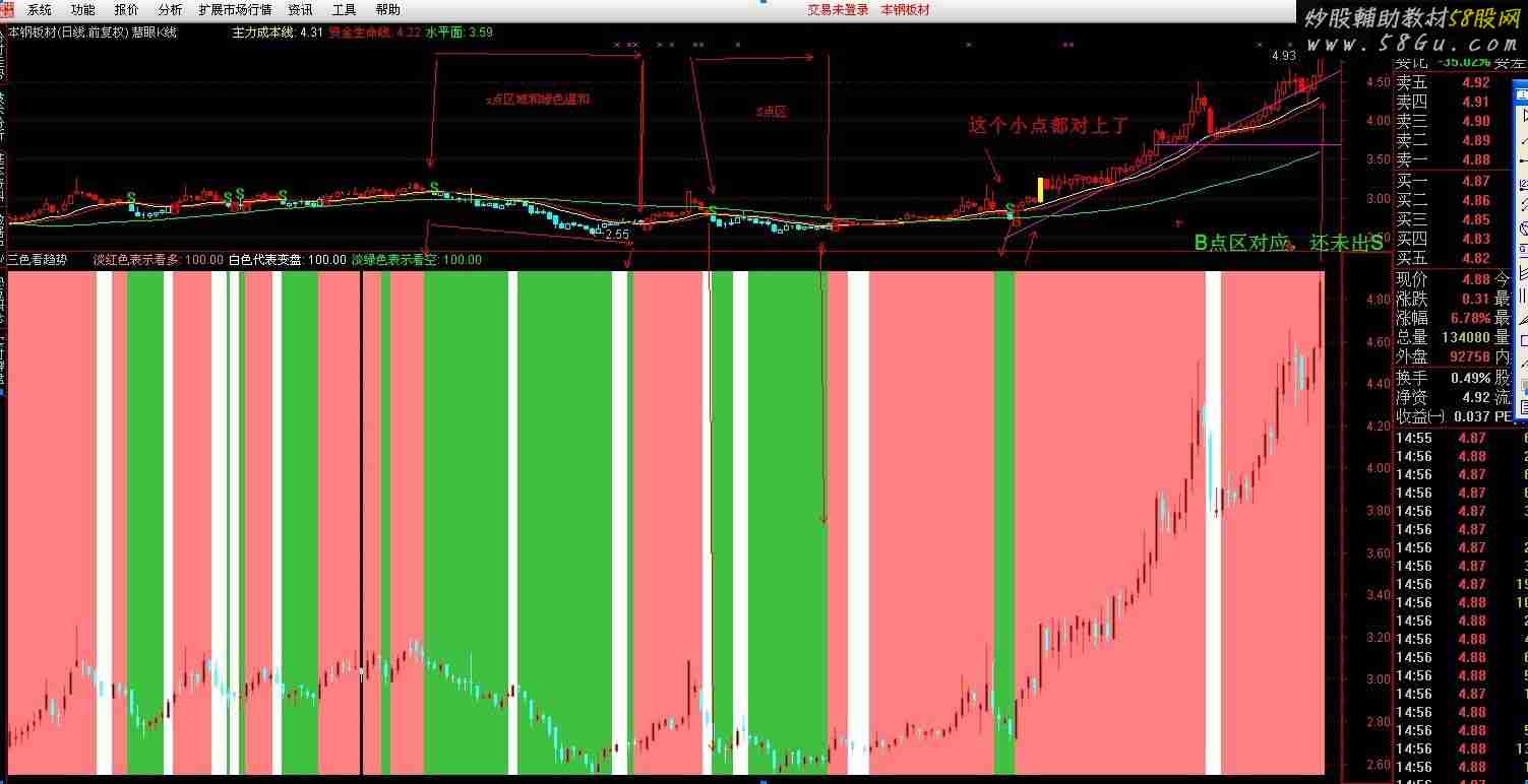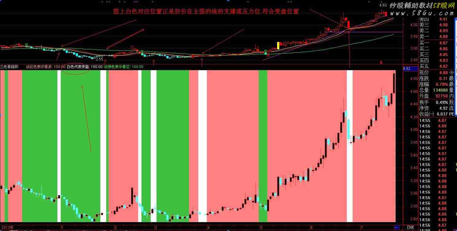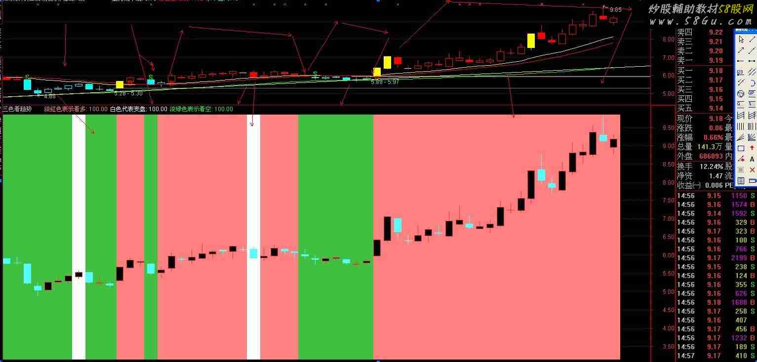 偶尔得到一个辨别趋势的副图公式,和我的主图公式对照了一下,一点也不亚于我的BS点的主图公式。现分享给大家。 副图叫三色辨趋势,粉红色是上升持股趋势,相当于我主图的B点段,绿色代表下降趋势,相当于主图的S点段。而它多了个白色,我看了下,白色出现的位置在我的主图上,不是顶在压力线,就是回到支撑线的位置,如果继续向上或向下,就会打破主图 的B S点了,应该是非常高明的。提示我们要看好走势。 红色持股,白色小心,绿色不玩效果还行把,不得不说高手就是多 兔:=1080201;龙:=1150628;CYC:=IF((DATE>兔 AND DATE<龙),1,DRAWNULL);龙年:=(MA(CLOSE,3)+MA(CLOSE,6)+MA(CLOSE,12)+MA(CLOSE,24))/4;发财:=MA(C,18)*CYC;STICKLINE(C>龙年 AND C>发财,REFDATE(HHV(H,130),DATE),REFDATE(LLV(L,130),DATE),5,0),COLORLIRED;STICKLINE(C<龙年 AND C<发财,REFDATE(HHV(H,130),DATE),REFDATE(LLV(L,130),DATE),5,0),COLORLIGREEN;STICKLINE((C<龙年 AND C>发财) OR (C>龙年 AND C<发财),REFDATE(HHV(H,130),DATE),REFDATE(LLV(L,130),DATE),5,0),COLORWHITE;DRAWKLINE(H,O,L,C);淡红色表示看多:100,COLORLIRED,NODRAW;白色代表变盘:100,COLORWHITE,NODRAW;淡绿色表示看空:100,COLORGREEN,NODRAW;   |