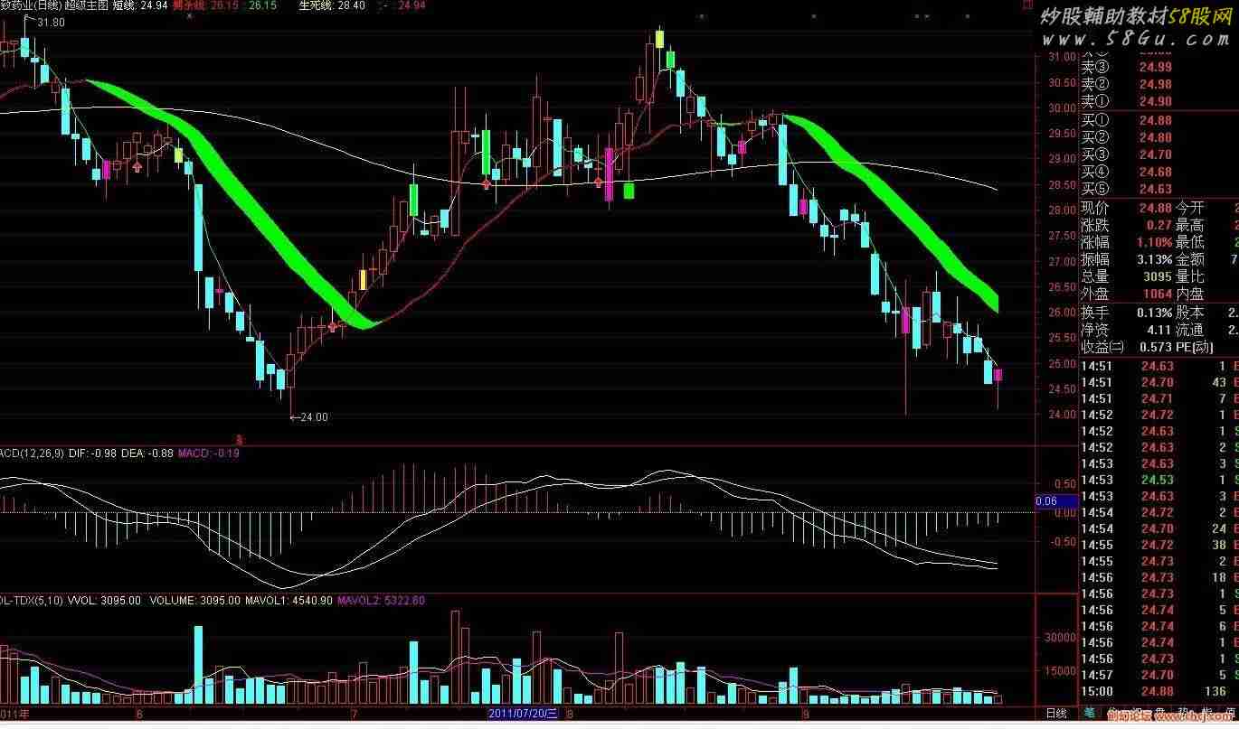 DX:=(C+H+L+O)/4; 短线:(MA(DX,1)+MA(DX,3)+MA(DX,5))/3,COLORFFFFFF; MTM:=C-REF(C,1); ZLGJ:=100*EMA(EMA(MTM,6),6)/EMA(EMA(ABS(MTM),6),6); FB:=MA(DX,17)+ABS(MA(DX,17)-REF(MA(DX,17),1)); FS:=MA(DX,17)+MA(DX,17)-REF(MA(DX,17),1); 搏杀线:IF(MA(DX,17)<FS,FS,MA(DX,17)),LINETHICK2,COLOR000FFF; IF(FB>FS,搏杀线,DRAWNULL),COLOR00FF00; DRAWBAND(FS,FB>FS,FB,RGB(0,250,0)); UPPER:= 搏杀线 + 2*STD(CLOSE,20); 买1:=IF(LLV(ZLGJ,2)=LLV(ZLGJ,7) AND COUNT(ZLGJ<0,2) AND CROSS(ZLGJ,MA(ZLGJ,2)),1,0); 卖1:=IF(HHV(ZLGJ,2)=HHV(ZLGJ,7) AND COUNT(ZLGJ>50,2) AND CROSS(MA(ZLGJ,2),ZLGJ),1,0); STICKLINE(FILTER(买1=1,5),C,O,1,0),COLORFF00FF; STICKLINE(FILTER(卖1=1,1),C,O,1,0),COLOR00FF00; RSV:=(C-LLV(L,9))/(HHV(H,9)-LLV(L,9))*100; K:=SMA(RSV,3,1); D:=SMA(K,3,1); J:=3*K-2*D; BDGD:=HHV(J,2)=HHV(J,8) AND J>80; 注意:=IF(CROSS(REF(J-0.01,1),J) AND REF(BDGD,1),1,0); STICKLINE(注意 AND 卖1<1,O,CLOSE,1,0),COLORYELLOW,LINETHICK2; A:=(3*C+L+O+H)/6; BB:=(20*A+19*REF(A,1)+18*REF(A,2)+17*REF(A,3)+16*REF(A,4)+15*REF(A,5)+14*REF(A,6) +13*REF(A,7)+12*REF(A,8)+11*REF(A,9)+10*REF(A,10)+9*REF(A,11)+8*REF(A,12) +7*REF(A,13)+6*REF(A,14)+5*REF(A,15)+4*REF(A,16)+3*REF(A,17)+2*REF(A,18)+ REF(A,20))/210; 生死线:EMA(BB,90),LINETHICK1,COLORYELLOW; 价涨量缩:DRAWICON(FILTER(REF(V,3)>REF(V,2)*1.1 AND REF(V,2)>=REF(V,1)*1.1 AND REF(V,1)<=V AND L>REF(L,3) AND REF(C,3)>REF(O,3) AND REF(L,1)>REF(LOW,3),5),L,1); STICKLINE(搏杀线>生死线 AND CROSS(短线,搏杀线),L,L*0.99,3,0),COLOR00FF00; VAR1:=MA((VOL-REF(VOL,1))/REF(VOL,1),5); VAR2:=(CLOSE-MA(CLOSE,24))/MA(CLOSE,24)*100; MY:=VAR2*(1+VAR1); SHT:= MY; SHTMA:= MA(SHT,5); IF(SHTMA>=MY,短线,DRAWNULL),COLOR00FF00; IF(SHTMA<=MY,短线,DRAWNULL),COLORAA00FF;