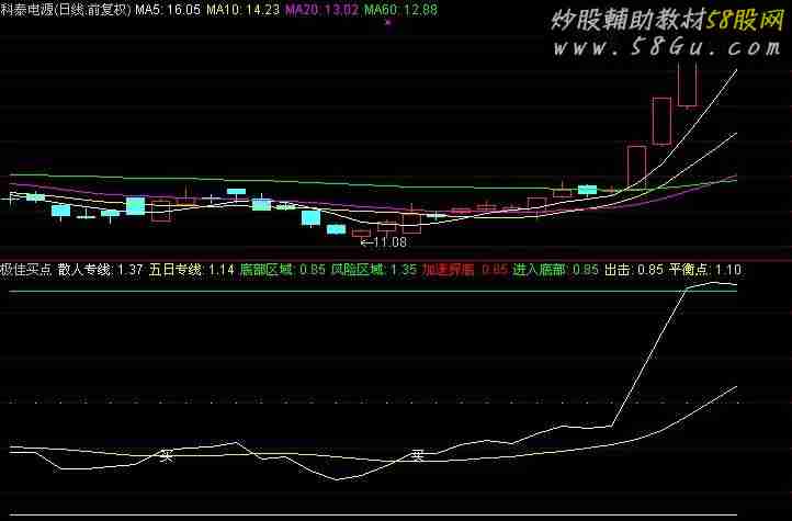 散人专线:C/COST(8); 五日专线:EMA(EMA(散人专线,5),10),COLORYELLOW ; 底部区域:0.85,COLOR00FF00,LINETHICK1; 风险区域:1.35,COLORGREEN,LINETHICK1; 加速探底:IF((MA(C,5)-C)/C>0.04 AND (MA(C,10)-MA(C,5))/MA(C,5)>0.04,1,0.85),COLORRED; 进入底部:IF(散人专线<=0.80,1,0.85),COLORGREEN; VAR1:=散人专线-REF(散人专线,1); 出击:IF(散人专线<0.9 AND 五日专线<0.85 AND CROSS(散人专线,五日专线),1.2,0.85),COLORYELLOW; 平衡点:0.85+(1.35-0.85)/2,POINTDOT,LINETHICK0,COLORYELLOW; DRAWTEXT(CROSS(散人专线,五日专线) AND C>REF(C,1)*1.020,1.0,'买');
