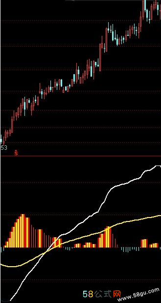 {趋势先机} DIFF := EMA(CLOSE,12) - EMA(CLOSE,26); DEA := EMA(DIFF,9); 牛股攻击 : 2*(DIFF-DEA), COLORSTICK; STICKLINE(牛股攻击>REF(牛股攻击,1) AND DIFF>DEA,牛股攻击,0,10,0),COLORRED;STICKLINE(牛股攻击>REF(牛股攻击,1) AND DIFF>DEA,牛股攻击,0,1,0),COLORYELLOW; A : EMA(CLOSE,25) - EMA(CLOSE,65),LINETHICK2; B: EMA(DIFF,45),LINETHICK2; IF(A<REF(A,5),A,DRAWNULL)LINETHICK2,COLORBLUE; |