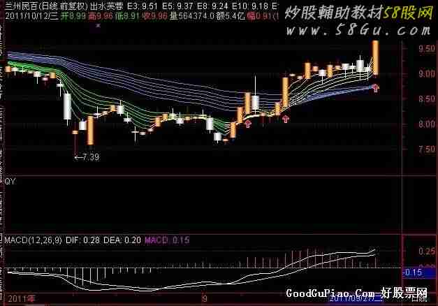 E3:EMA(C,3),COLORYELLOW; E5:EMA(C,5),COLORYELLOW; E8:EMA(C,8),COLORYELLOW; E10:EMA(C,10),COLORYELLOW; E12:EMA(C,12),COLORYELLOW; E15:EMA(C,15),COLORYELLOW; E30:EMA(C,30),COLORD1875A; E35:EMA(C,35),COLORD1875A; E40:EMA(C,40),COLORD1875A; E45:EMA(C,45),COLORD1875A; E50:EMA(C,50),COLORD1875A; E60:EMA(C,60),COLORD1875A; IF(E3<=REF(E3,1),E3,DRAWNULL),COLORGREEN; IF(E5<=REF(E5,1),E5,DRAWNULL),COLORGREEN; IF(E8<=REF(E8,1),E8,DRAWNULL),COLORGREEN; IF(E10<=REF(E10,1),E10,DRAWNULL),COLORGREEN; IF(E12<=REF(E12,1),E12,DRAWNULL),COLORGREEN; IF(E15<=REF(E15,1),E15,DRAWNULL),COLORGREEN; STICKLINE(C>=O,H,C,0,0),COLOR000088; STICKLINE(C>=O,H,C,0,0),COLOR0000AA; STICKLINE(C>=O,O,L,0,0),COLOR0000BB; STICKLINE(C>=O,O,L,0,0),COLOR0000CC; STICKLINE(C>O,C,O,3.1,0),COLOR0000DD; STICKLINE(C>O,C,O,2.1,0),COLOR0000EE; STICKLINE(C>O,C,O,2,0),COLOR3377AA; STICKLINE(C>O,C,O,1.6,0),COLOR3388BB; STICKLINE(C>O,C,O,1.2,0),COLOR4499CC; STICKLINE(C>O,C,O,0.8,0),COLOR44AADD; STICKLINE(C>O,C,O,0.4,0),COLOR55BBEE; STICKLINE(C>O,C,O,0.1,0),COLOR66CCFF; STICKLINE(C<=O,H,C,0,0),COLOR888888; STICKLINE(C<=O,H,C,0,0),COLORFFFFFF; STICKLINE(C<=O,O,L,0,0),COLOR888888; STICKLINE(C<=O,O,L,0,0),COLORFFFFFF; STICKLINE(C<=O,C,O,3.4,0),COLOR888888; STICKLINE(C<=O,C,O,3.0,0),COLOR999999; STICKLINE(C<=O,C,O,2.4,0),COLORAAAAAA; STICKLINE(C<=O,C,O,2.0,0),COLORBBBBBB; STICKLINE(C<=O,C,O,1.6,0),COLORCCCCCC; STICKLINE(C<=O,C,O,1.2,0),COLORDDDDDD; STICKLINE(C<=O,C,O,0.6,0),COLOREEEEEE; STICKLINE(C<=O,C,O,0.1,0),COLORFFFFFF;DRAWICON(EMA(C,8)>EMA(C,15) AND EMA(C,40)>REF(EMA(C,40),1) AND CROSS(EMA(C,3),EMA(C,35)),L-0.20,1); DRAWICON(EMA(C,15)>EMA(C,40) AND EMA(C,35)>REF(EMA(C,35),1) AND CROSS(EMA(C,3),EMA(C,5)),L-0.20,1); DRAWICON(ABS(EMA(C,15)-EMA(C,60))/C<0.01 AND EMA(C,15)>EMA(C,30) AND O<EMA(C,3) AND C>EMA(C,3) AND O<EMA(C,15) AND C>EMA(C,15) AND O<EMA(C,30) AND C>EMA(C,30) AND O<EMA(C,60) AND C>EMA(C,60),L-0.20,1); DRAWICON(ABS(EMA(C,45)-EMA(C,30))/C<0.011 AND EMA(C,3)>EMA(C,15) AND EMA(C,15)>EMA(C,40) AND CROSS(EMA(C,5),EMA(C,60)),L-0.20,1); A1:=OPEN<EMA(C,20) OR OPEN<EMA(C,40) OR OPEN<EMA(C,60); A2:=C>MAX(EMA(C,20),MAX(EMA(C,40),EMA(C,60))); A3:=V/MA(V,10)>1.2; A4:=C/REF(C,1)>1.049; 出水芙蓉:=A1 AND A2 AND A3 AND A4 AND O<EMA(C,60) AND C>EMA(C,60); DRAWICON(出水芙蓉,L-0.20,1);