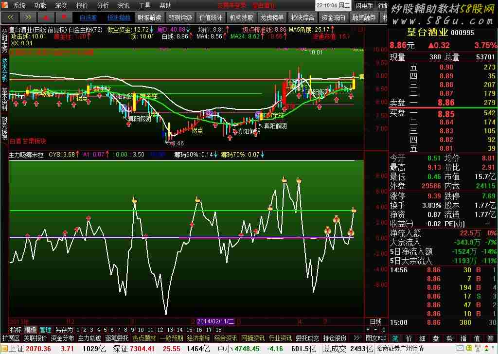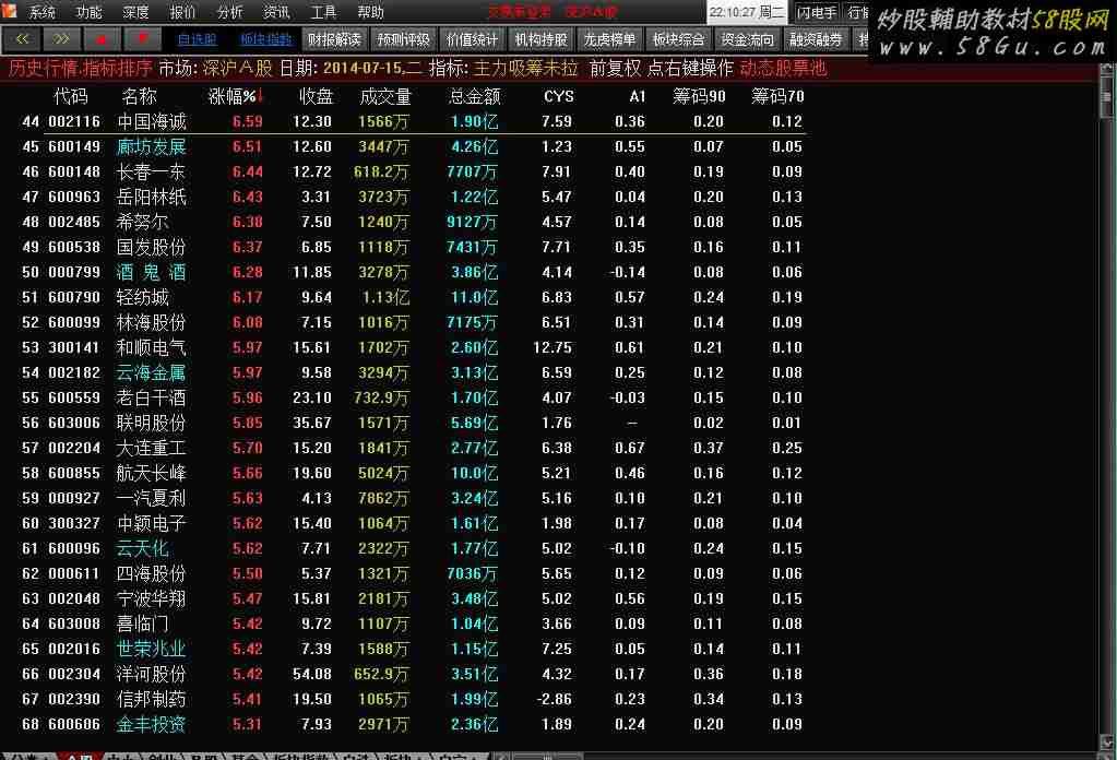 通达信指标排序方法使用方法: 进入主页面-->点"报价"-->点"历史行情报表"-->一般系统默认指标(如正在计算"KDJ"中k、d、j数值)排序计算-->在页面的上面"指标"用右键-->更换排序指标(出现所有指标公式)-->就任选其中一个指标做为排序指标-->OK!计算中-->点排序的项目可以数值从“大”至“小”或从“小”至“大”排序。 在排序状态下,点下面的版块(例如分类/A股/中小/B股等,也可以定义地域\行业等),任何一版块,包括自定义版块,均可利用自定义及软件自带的指标排序!! 建立自定义的排序指标,方法如下: 主页面-->公式管理器-->新建-->公式名(任意)-->将所需要的公式贴粘进公式编辑器-->点"测试"-->点"确定"--->自定义的排序指标OK!例如: 在"CYS"指标基础上增加"靠近年线"和"70�%筹码集中度"指标 {鬼系CYS指标} CYC13:=0.01*EXPMA(AMOUNT,13)/EXPMA(VOL,13); CYS:(CLOSE-CYC13)/CYC13*100; {靠近年线指标} a1:(c-ma(c,250))/ma(c,250); 0;{70%、90%筹码集中度指标} F:=COST(5 ); J:=COST(95 ); M:=COST(15 ); N:=COST(85 ); 筹码90%:(J-F)/(F+J); 筹码70%:(N-M)/(N+M); 公式用法: 1、CYS的用法说明:是对成本超跌度的数字化表达. 2、用靠近年线用法说明:A1来排序,数值越小,越是未经大幅炒作的,是跌幅较大的。反弹可能更强烈。压力越小,支撑越强} 3、70%90%的筹码集中度越低,说明筹码越集中,如果股价在低位说明主力正在吸筹,未经过拉升,跟踪这一类股票,结合如四线粘合\量能突破等突破指标,大黑马无一漏网. 主力吸筹未拉升 条件选股公式 CYC13:=0.01*EXPMA(AMOUNT,13)/EXPMA(VOL,13); CYS:=(CLOSE-CYC13)/CYC13*100,LINETHICK2; {靠近年线指标} A1:=(C-MA(C,250))/MA(C,250),LINETHICK2; 零:=0,LINETHICK2; 三:=3.5,LINETHICK2; 十:=10,LINETHICK2; {70%、90%筹码集中度指标} F:=COST(5 ); J:=COST(95 ); M:=COST(15 ); N:=COST(85 ); 筹码90%:=(J-F)/(F+J); 筹码70%:=(N-M)/(N+M); {去掉不需要的板块} 板块1:=INBLOCK('房地产')-1; 板块2:=INBLOCK('金融行业')-1; 板块3:=INBLOCK('酒店旅游')-1; 板块4:=INBLOCK('玻璃行业')-1; BKGL:= 板块1 AND 板块2 AND 板块3 AND 板块4;{板块过滤} 内外盘:=(DYNAINFO(23)<>DYNAINFO(22)) AND (DYNAINFO(7)>DYNAINFO(3)); 盘:=CAPITAL/100; 换:=V/盘; 换手率1:=BETWEEN(换,2.59,40); 量比1 :=DYNAINFO(17)>1.48; 流通盘:=CAPITAL/1000000<=7.59; 股价:=C>=5.60 AND C<11.69; 去创业板:=IF(CODELIKE('300'),0,1); 去停牌:=DYNAINFO(17)>0; D22:=IF(NAMELIKE('S'),0,1); D33:=IF(NAMELIKE('*'),0,1); 去ST:=D22 AND D33 AND 流通盘 AND 股价 AND 内外盘 AND 去停牌 AND 量比1 AND 换手率1 AND 去创业板 AND BKGL; CROSS(CYS,A1) OR CROSS(CYS,零) ORCROSS(CYS,三) AND 筹码70%<0.25 AND CYS>A1 AND CYS<十 AND 去ST;   |