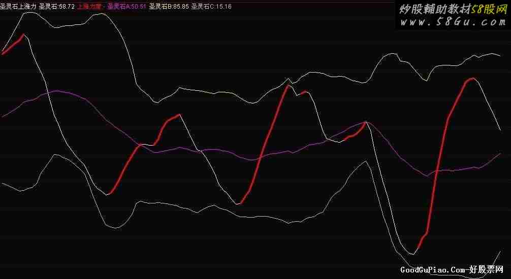 圣灵石:FORCAST(FORCAST(SMA(MAX(CLOSE-REF(CLOSE,1),0),9,1)/SMA(ABS(CLOSE-REF(CLOSE,1)),9,1)*100,3),18); 上涨力度:IF(圣灵石>REF(圣灵石,1),圣灵石,DRAWNULL),COLORRED,LINETHICK3; 圣灵石A:MA(SMA(MAX(CLOSE-REF(CLOSE,1),0),9,1)/SMA(ABS(CLOSE-REF(CLOSE,1)),9,1)*100,26); {上涨力度上穿圣灵石A时,股价走强;当回踩圣灵石A后,必有反弹,反弹力度有大有小; 当上涨力度越靠近圣灵石B时,或接近圣灵石B时,股价回踩后反弹力度,就越大!!!} 圣灵石B:圣灵石A+2*STD(SMA(MAX(CLOSE-REF(CLOSE,1),0),9,1)/SMA(ABS(CLOSE-REF(CLOSE,1)),9,1)*100,26),COLORYELLOW; 圣灵石C:圣灵石A-2*STD(SMA(MAX(CLOSE-REF(CLOSE,1),0),9,1)/SMA(ABS(CLOSE-REF(CLOSE,1)),9,1)*100,26);