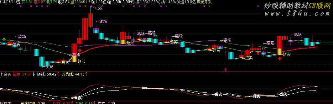 VAR1:=(CLOSE-LLV(LOW,80))/(HHV(HIGH,80)-LLV(LOW,80))*200; VAR2:=SMA(VAR1,3,1); VAR3:=SMA(VAR2,3,1); VAR4:=3*VAR2-2*VAR3; VAR5:=LLV(LOW,5); VAR6:=HHV(HIGH,5); VAR7:=EMA((CLOSE-VAR5)/(VAR6-VAR5)*100,4)*2; VAR8:=EMA(0.667*REF(VAR7,1)+0.333*VAR7,2); VAR9:=3*VAR7-2*VAR8; VARA:=POW(MA(CLOSE,5),2)+MA(CLOSE,5); VARB:=POW(MA(LOW,5),2)+MA(LOW,5); VARC:=POW(MA(HIGH,5),2)+MA(HIGH,5); VARD:=(VARA-LLV(VARB,64))/(HHV(VARC,64)-LLV(VARB,64))*150+65-10; VARE:=SMA(VARD,3,1)*1.5-100; VARF:=SMA(VARE,3,1); VAR10:=3*VARE-2*VARF; VAR11:=(HIGH+LOW+CLOSE*2)/4; VAR12:=EMA(VAR11,13); VAR13:=STD(VAR11,13); VAR14:=(VAR11-VAR12)*100/VAR13; VAR15:=EMA(VAR14,5); VAR17:=EMA(VAR15,13)+200-100; VAR18:=EMA(VAR17,10); VAR19:=3*VAR17-2*VAR18; VAR1A:=VAR2+VAR7+VARE+VAR17; VAR1B:=VAR3+VAR8+VARF+VAR18; VAR1C:=VAR4+VAR9+VAR10+VAR19; VAR1D:=(HIGH+LOW+CLOSE)/3; VAR20:=(VAR1D-MA(VAR1D,34))/(0.015*AVEDEV(VAR1D,34)); VAR22:=(HIGH+LOW+CLOSE+VAR1D)/4; VAR23:=EMA(VAR22,24); VAR24:=STD(VAR22,24); VAR25:=(VAR22-VAR23)/VAR24*100; VAR26:=(VAR1D-MA(VAR1D,24))/(0.015*AVEDEV(VAR1D,24)); VAR27:=EMA(VAR25,5); VAR2A:=((VAR27+VAR26+VAR20)/3+165)/4; VAR2B:=(EMA(EMA(EMA(VAR2A,15),10),5)-25)*2; VAR2C:=(VAR1A+VAR1B+VAR1C*30)/32/5-15; VAR2D:=EMA(VAR2C,7); VAR2E:=(VAR2A+VAR2C)/2/1.1; 超短:EMA(VAR2E,3),COLORRED ; 短线:EMA(超短,5),COLORWHITE; 趋势线:EMA((VAR2B+VAR2D)/2,2) ,COLORYELLOW; DRAWICON(CROSS(趋势线,0),0,1); DRAWICON(CROSS(100,超短),100,2); DRAWTEXT(趋势线>REF(趋势线,1)AND REF(趋势线,1)<REF(趋势线,2)AND COUNT(CROSS(超短,短线),3)=1 AND 短线<30,短线,'看底'); |