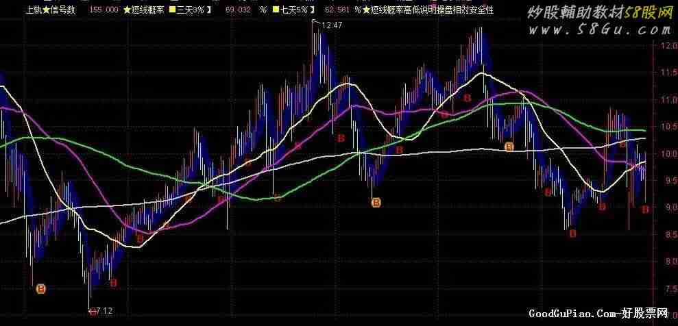 {N:1,100,5 CT:0,1,0} TON:=TOTALBARSCOUNT; NN:=IF(BARSCOUNT(C)<N,BARSCOUNT(C),N); 上轨:REF(MA(H,NN),1),NODRAW; 下轨:REF(MA(L,NN),1),NODRAW; 带宽:100*(上轨/下轨-1),NODRAW; STICKLINE(C,上轨,下轨,4,0),COLOR660000; PA:=IF(CT=0,上轨,下轨); BS:=FILTER(CROSS(C,PA),9); 信号:IF(BS,PA,0),NODRAW; DRAWKLINE(HIGH,OPEN,LOW,CLOSE),COLOR00FFFF;BN:=BARSLAST(BS>0); 信号数:SUM(BS>0,0),NODRAW; BJJ:=REF(PA,BN); DRAWICON(信号>0 AND (BJJ/REF(BJJ,1)-1)*100<-N*2,LLV(L,7)*0.99,3); DRAWICON(信号>0,LLV(L,7)*0.99,7);P1:=HHV(H>BJJ*1.03 AND BN>0 AND BN<=3,BN+1); 短线机会%3:100*SUM(P1=1 AND REF(P1,1)=0,0)/信号数,NODRAW; P2:=HHV(H>BJJ*1.05 AND BN>0 AND BN<=7,BN+1); %7:100*SUM(P2=1 AND REF(P2,1)=0,0)/信号数,NODRAW;M3:MA(C,30),LINETHICK2; M6:MA(C,60),LINETHICK2; M12:MA(C,125),LINETHICK2; M25:MA(C,250),LINETHICK2;N1:=300;{注:锁定显示区为310条K线时正常显示} N2:=IF(TON<N1,TON,N1); AH:=CONST(HHV(H,N2)); AL:=CONST(LLV(L,N2)); AHL:=AH-AL; DRAWTEXT(CURRBARSCOUNT=N2,AH+AHL*0.05,IF(CT=0,'上轨★信号数','下轨★信号数')),COLOR00FFFF; DRAWTEXT(CURRBARSCOUNT=INTPART(N2*0.85),AH+AHL*0.05,' ★短线概率 ■三天3%】'),COLOR00FFFF; DRAWTEXT(CURRBARSCOUNT=INTPART(N2*0.63),AH+AHL*0.05,' % ■七天5%】 %★短线概率高低说明操盘相对安全性'),COLOR00FFFF;DRAWNUMBER(CURRBARSCOUNT=INTPART(N2*0.9),AH+AHL*0.05, CONST(信号数)),COLOR0088FF; DRAWNUMBER(CURRBARSCOUNT=INTPART(N2*0.68),AH+AHL*0.05,CONST(短线机会%3)),COLOR0088FF; DRAWNUMBER(CURRBARSCOUNT=INTPART(N2*0.52),AH+AHL*0.05,CONST(%7)),COLOR0088FF;