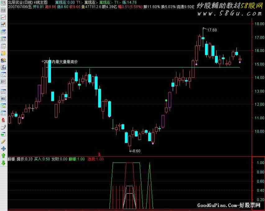 {翻番选股} VAR1:=SMA(MAX(MAX((HIGH - LOW),ABS((HIGH - REF(CLOSE,1)))),ABS((LOW - REF(CLOSE,1)))),14,1); VAR2:=(HIGH - REF(HIGH,1)); VAR3:=(REF(LOW,1) - LOW); VAR4:=SMA(IF(((VAR2 > 0) AND (VAR2 > VAR3)),VAR2,0),12,1); VAR5:=SMA(IF(((VAR3 > 0) AND (VAR3 > VAR2)),VAR3,0),12,1); VAR6:=((VAR4 * 100) / VAR1); VAR7:=((VAR5 * 100) / VAR1); VAR8:=SMA(((ABS((VAR7 - VAR6)) / (VAR7 + VAR6)) * 100),12,1); VAR9:=((VAR8 + REF(VAR8,5)) / 2); VARA:=((SUM((HIGH - OPEN),12) / SUM((OPEN - LOW),12)) * 100); VARB:=((SUM(MAX(0,(HIGH - REF(CLOSE,1))),12) / SUM(MAX(0,(REF(CLOSE,1) - LOW)),12)) * 100); VARC:=((AMOUNT / VOL) / 100); VARD:=(((((3 * HIGH) + LOW) + OPEN) + (2 * CLOSE)) / 7); VARE:=((SUM(AMOUNT,5) / VARC) / 100); VARF:=((SUM(AMOUNT,13) / VARC) / 100); VAR10:=((SUM(AMOUNT,34) / VARC) / 100); VAR11:=((SUM(AMOUNT,209) / VARC) / 100); VAR12:=(((REF(VOL,1) + REF(VOL,2)) + REF(VOL,3)) + REF(VOL,4)); VAR13:=(VAR12 / CAPITAL); VAR14:=(((VOL / CAPITAL) * VARD) + (VAR13 * REF(VARC,1))); VAR15:=DMA(VARD,(VOL / VARE)); VAR16:=DMA(VARD,(VOL / VARF)); VAR17:=DMA(VARD,(VOL / VAR10)); VAR18:=DMA(VARD,(VOL / CAPITAL)); VAR19:=MA(HHV(HIGH,488),18); VAR1A:=MA(HHV(HIGH,220),18); VAR1B:=MA(HHV(HIGH,98),18); VAR1C:=MA(LLV(LOW,488),18); VAR1D:=MA(LLV(LOW,220),18); VAR1E:=MA(LLV(LOW,98),18); VAR1F:=MA((((((((VAR1C * 0.96) + (VAR1D * 0.96)) + (VAR1E * 0.96)) + (VAR19 * 0.558)) + (VAR1A * 0.558)) + (VAR1B * 0.558)) / 6),18); VAR20:=MA((((((((VAR1C * 1.25) + (VAR1D * 1.23)) + (VAR1E * 1.2)) + (VAR19 * 0.55)) + (VAR1A * 0.55)) + (VAR1B * 0.65)) / 6),18); VAR21:=MA((((((((VAR1C * 1.3) + (VAR1D * 1.3)) + (VAR1E * 1.3)) + (VAR19 * 0.68)) + (VAR1A * 0.68)) + (VAR1B * 0.68)) / 6),18); VAR22:=MA((((((VAR1F * 3) + (VAR20 * 2)) + VAR21) / 6) * 1.738),18); VAR23:=IF((DATE <= 1031231),VAR22,(VAR22 * DAY)); VAR24:=LOW; VAR25:=REF(LOW,1); VAR26:=((SMA(ABS((VAR24 - VAR25)),3,1) / SMA(MAX((VAR24 - VAR25),0),3,1)) * 100); VAR27:=MA(IF(((CLOSE * 1.35) <= VAR23),(VAR26 * 10),(VAR26 / 10)),3); VAR28:=LLV(LOW,30); VAR29:=HHV(VAR27,30); VAR2A:=IF((LOW <= VAR28),((VAR27 + (VAR29 * 2)) / 2),0); VAR31:=MA(HHV(HIGH,488),18); VAR32:=MA(HHV(HIGH,220),18); VAR33:=MA(HHV(HIGH,98),18); VAR34:=MA(LLV(LOW,488),18); VAR35:=MA(LLV(LOW,220),18); VAR36:=MA(LLV(LOW,98),18); VAR37:=MA((((((((VAR34 * 0.96) + (VAR35 * 0.96)) + (VAR36 * 0.96)) + (VAR31 * 0.558)) + (VAR32 * 0.558)) + (VAR33 * 0.558)) / 6),18); VAR38:=MA((((((((VAR34 * 1.25) + (VAR35 * 1.23)) + (VAR36 * 1.2)) + (VAR31 * 0.55)) + (VAR32 * 0.55)) + (VAR33 * 0.65)) / 6),18); VAR39:=MA((((((((VAR34 * 1.3) + (VAR35 * 1.3)) + (VAR36 * 1.3)) + (VAR31 * 0.68)) + (VAR32 * 0.68)) + (VAR33 * 0.68)) / 6),18); VAR40:=MA((((((VAR37 * 3) + (VAR38 * 2)) + VAR39) / 6) * 1.738),18); VAR41:=VAR40; VAR42:=LOW; VAR43:=REF(LOW,1); VAR44:=((SMA(ABS((VAR42 - VAR43)),3,1) / SMA(MAX((VAR42 - VAR43),0),3,1)) * 100); VAR45:=MA(IF(((CLOSE * 1.35) <= VAR41),(VAR44 * 10),(VAR44 / 10)),3); VAR46:=LLV(LOW,30); VAR47:=HHV(VAR45,30); VAR49:=IF((LOW <= VAR46),((VAR45 + (VAR47 * 2)) / 2),0); 提示:=MA((VAR49 AND (CLOSE < COST(1))),3),,COLORFFFFFF; 买入:=(MA(VAR2A AND (CLOSE < COST(1)),3) AND ((((CLOSE - VAR16) / VAR16) * 100) < (2 - 13)))*0.5,,COLORFFFA00; 趋势:=(EMA(((3 * SMA((((CLOSE - LLV(LOW,27)) / (HHV(HIGH,27) - LLV(LOW,27))) * 100),5,1)) - (2 * SMA(SMA((((CLOSE - LLV(LOW,27)) / (HHV(HIGH,27) - LLV(LOW,27))) * 100),5,1),3,1))),5) / 100); 欢喜:=IF((((((((REF(CLOSE,13) - CLOSE) / REF(CLOSE,13)) * 100) > 15) AND ((SUM((VOL / CAPITAL),13) * 100) < 18)) AND (((VOL / CAPITAL) * 100) < 2.5)) AND ((((REF(CLOSE,1) - CLOSE) / REF(CLOSE,1)) * 100) < 8)),0.7,0),,COLORFFCC66; V2:=(((CLOSE - REF(CLOSE,1)) / REF(CLOSE,1)) * 100); V3:=(MA(VOL,2) / MA(VOL,10)); V4:=(VOL / CAPITAL); A1:=((((0.0068 * V2) - (0.0072 * V3)) - (0.5676 * V4)) - 0.0105); A2:=((((0.0015 * V2) - (0.0124 * V3)) + (1.7461 * V4)) - 0.0074); A3:=((((0 - (0.0003 * V2)) + (0.047 * V3)) - (0.5734 * V4)) - 0.0549); 发财:=((((0 - (12.2401 * A1)) - (1 * A2)) + 0.321) < 0),,COLOR99CC66; 翻番:=(((CLOSE - MA(CLOSE,27)) / MA(CLOSE,27)) < (0 - 0.16)); 选股:提示 AND 买入 AND 翻番;