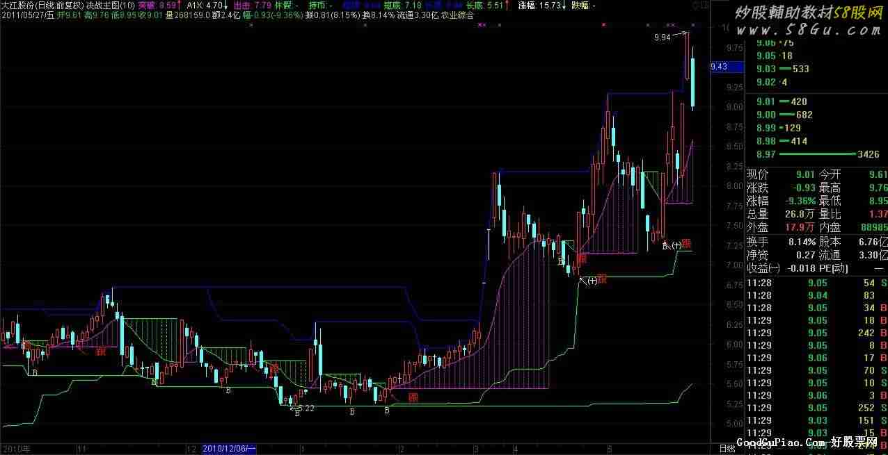 N:=10; 突破:REF(EMA(C,N),1),COLORMAGENTA,LINETHICK1; A1X:(EMA(C,5)-突破)/突破*100,NODRAW; 距离:=(C-突破)/突破*100,NODRAW; 出击:IF(A1X>=0,REF(EMA(C,N),BARSLAST(CROSS(A1X,0))+1),DRAWNULL)COLORMAGENTA,LINETHICK1; 休假:IF(A1X<0,REF(EMA(C,N),BARSLAST(CROSS(0,A1X))+1),DRAWNULL)COLORGREEN,LINETHICK1; STICKLINE(A1X>=0,出击,突破,0,-1)COLORMAGENTA; STICKLINE(A1X<0,休假,突破,0,-1)COLORGREEN; 持币:IF(A1X<0,突破,DRAWNULL)COLORGREEN,LINETHICK1; DRAWTEXT(ISLASTBAR AND 出击,出击,' 出击'),COLORMAGENTA; DRAWTEXT(ISLASTBAR AND 休假,休假,' 休假'),COLORGREEN; 短顶:HHV(H,20),COLORFF0000; 短底:LLV(L,20),COLOR00FF00; 长顶:HHV(H,60),COLORFF0000; 长底:LLV(L,60),COLOR00FF00; DRAWKLINE(H,O,L,C); 涨幅:IF(A1X>=0,(C-出击)/出击*100,DRAWNULL)NODRAW; 跌幅:IF(A1X<0,(C-休假)/休假*100,DRAWNULL)NODRAW;MA5:=MA(C,5);MA18:=MA(CLOSE,18);MA13:=MA(C,13); A:=(3*C+L+O+H)/6; VAR1:=(20*A+19*REF(A,1)+18*REF(A,2)+17*REF(A,3)+16*REF(A,4)+15*REF(A,5)+ 14*REF(A,6)+13*REF(A,7)+12*REF(A,8)+11*REF(A,9)+10*REF(A,10)+9*REF(A,11)+8*REF(A,12) +7*REF(A,13)+6*REF(A,14)+5*REF(A,15)+4*REF(A,16)+3*REF(A,17)+2*REF(A,18)+REF(A,20))/210; MTM:=C-REF(C,1);CB:=EMA(VAR1,13); DX:=100*EMA(EMA(MTM,6),6)/EMA(EMA(ABS(MTM),6),6); 卖:=HHV(DX,2)=HHV(DX,7) AND COUNT(DX>50,2) AND CROSS(MA(DX,2),DX); DRAWTEXT(FILTER(卖=1,1),HIGH*1.01,'S'),COLORDD0000; 买:=LLV(DX,2)=LLV(DX,7) AND COUNT(DX<0,2) AND CROSS(DX,MA(DX,2)); DRAWTEXT(FILTER(买=1,5),LOW-0.03,'B'),COLOR00DDDD; 加仓:=SMA(EMA((C-REF(C,1))/REF(C,1),5)*100,3,1)*10; DRAWTEXT(FILTER((CROSS(加仓,0) OR CROSS(CLOSE,CB)) AND 买=1,3),LOW-0.03,'↖㈩'),COLORWHITE; 跟:=MA18>=REF(MA18,3) AND CROSS(CLOSE,MA18); DRAWTEXT(跟,LOW*0.999,'↖ 跟'),COLORRED;