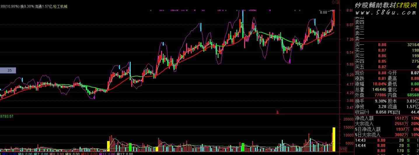 {立体K线} STICKLINE(CLOSE>OPEN,H,LOW,0.3,0 ),COLOR9933FF; STICKLINE(OPEN>=CLOSE,L,HIGH,0.3,0 ),COLOR66CC33; STICKLINE(OPEN>=CLOSE ,CLOSE ,OPEN,3,0),COLOR009900; STICKLINE(OPEN>=CLOSE ,CLOSE ,OPEN,2,0),COLOR00CC00; STICKLINE(OPEN>=CLOSE ,CLOSE ,OPEN,1.5,0),COLOR33FF00; STICKLINE(OPEN>=CLOSE ,CLOSE ,OPEN,1,0),COLOR66FF00; STICKLINE(CLOSE>OPEN,CLOSE,OPEN,3,0),COLOR000099; STICKLINE(CLOSE>OPEN,CLOSE,OPEN,2,0 ),COLOR0000CC; STICKLINE(CLOSE>OPEN,CLOSE,OPEN,1.5,0 ),COLOR0000FF; STICKLINE(CLOSE>OPEN,CLOSE,OPEN,1,0 ),COLOR0033FF; {修正价格} 重心:(C+0.618*REF(C,1)+0.382*REF(C,2)+0.236*REF(C,3)+0.146*REF(C,4))/2.382COLORRED,LINETHICK1; GAO:=HHV(C,60)-LLV(C,60); RSI:=SMA(MAX(重心-REF(重心,1),0),5,1)/SMA(ABS(重心-REF(重心,1)),5,1); 指导线:重心+GAO*(RSI-0.5),COLORMAGENTA,LINETHICK1; STICKLINE(CROSS(RSI,0.1),指导线,REF(指导线,1),1,0),COLORMAGENTA; STICKLINE(CROSS(0.9,RSI),指导线,REF(指导线,1),1,0),COLORCYAN; {趋势} 平衡:=EMA(((SLOPE(CLOSE,22) * 20) + CLOSE),55); 红升:IF(重心>=平衡,平衡,DRAWNULL),COLORRED,LINETHICK2; 蓝降:IF(重心<平衡,平衡,DRAWNULL),COLORGREEN,LINETHICK2;