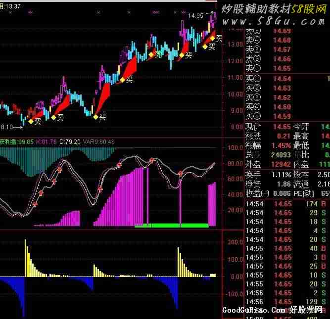 VAR1:=REF((L+O+C+H)/4,1); VAR2:=SMA(ABS(VAR1-H),13,1)/SMA(MAX(VAR1-H,0),10,1); VAR3:=EMA(VAR2,10); VAR4:=HHV(H,33); VAR5:=EMA(IF(H>=VAR4,VAR3,0),3)*-1; VAR6:=SMA(ABS(VAR1-L),10,1)/SMA(MIN(VAR1-L,0),5,1); VAR7:=EMA(VAR6,5); VAR8:=LLV(L,3); VAR9:=EMA(IF(L>=VAR8,VAR7,0),3)*-1; 挖坑:-(IF(VAR9>REF(VAR9,1),VAR9,0)),COLORWHITE{COLORFF9933},LINETHICK0; 进场:IF(VAR9<REF(VAR9,1),VAR9,0),COLORRED,LINETHICK0; 0; STICKLINE(挖坑<=0,挖坑,0,0.0001,0),COLORBLUE; STICKLINE(进场>=0,进场,0,0.0001,0),COLORYELLOW;DRAWICON(CROSS(挖坑,-001),0,9);天下无敌:CROSS(挖坑,-001),COLORLIMAGENTA;