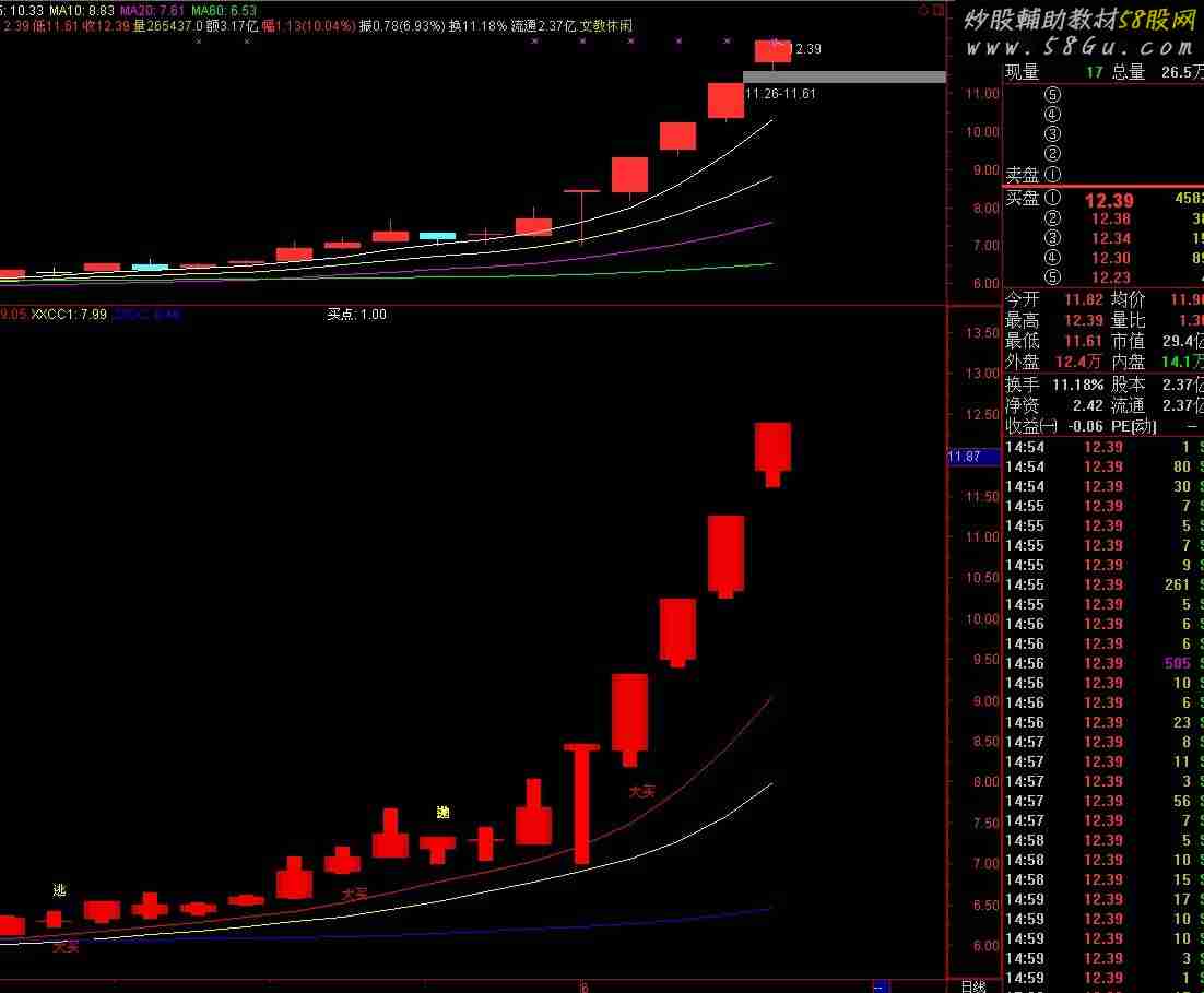 不多说,喜欢的下载,来自网络,非原创,如侵权请告知,谢谢!XXCC: EMA(EMA(EMA(EMA(CLOSE,3),3),3),3),LINETHICK1,COLOR0000FF;XXCC1: EMA(REF(XXCC,1),3),LINETHICK1,COLOR00FFFF;ZZCC: EMA(EMA(EMA(EMA(EMA(CLOSE,65),3),3),3),3),LINETHICK1,COLORFF0000;AA:= MA(WINNER(CLOSE*0.95)*100,3);VAR83:= 1/WINNER(CLOSE);VAR84:= (CLOSE-MA(CLOSE,13))/MA(CLOSE,13)*100;VAR85:= 100-ABS(VAR84);VAR86:= 3*SMA((CLOSE-LLV(LOW,75))/(HHV(HIGH,75)-LLV(LOW,75))*100,20,1)-2*SMA(SMA((CLOSE-LLV(LOW,75))/(HHV(HIGH,75)-LLV(LOW,75))*100,20,1),15,1);VAR87:= 3*SMA((OPEN-LLV(LOW,75))/(HHV(HIGH,75)-LLV(LOW,75))*100,20,1)-2*SMA(SMA((OPEN-LLV(LOW,75))/(HHV(HIGH,75)-LLV(LOW,75))*100,20,1),15,1);VAR88:= 100-VAR87;VAR89:= 100-VAR86;VAR90:= MA(WINNER(CLOSE*0.95)*100,3);VAR91:= IF(VAR83>5,IF(VAR83<100,VAR83,VAR85-10),0);VAR92:= MA(100*(CLOSE-LLV(CLOSE,34))/(HHV(HIGH,34)-LLV(LOW,34)),5)-20;VAR93:= 100-3*SMA((CLOSE-LLV(LOW,75))/(HHV(HIGH,75)-LLV(LOW,75))*100,20,1)+2*SMA(SMA((CLOSE-LLV(LOW,75))/(HHV(HIGH,75)-LLV(LOW,75))*100,20,1),15,1);VAR94:= 100-3*SMA((OPEN-LLV(LOW,75))/(HHV(HIGH,75)-LLV(LOW,75))*100,20,1)+2*SMA(SMA((OPEN-LLV(LOW,75))/(HHV(HIGH,75)-LLV(LOW,75))*100,20,1),15,1);VAR95:= VAR93<REF(VAR94,1) AND VOL>REF(VOL,1) AND CLOSE>REF(CLOSE,1);AAE:= WINNER(CLOSE+CLOSE*15/100)*100;BBE:= WINNER(CLOSE+CLOSE*0/100)*100;CCE:= AAE-BBE;DDE:= (WINNER(CLOSE-CLOSE*0.1/100)-WINNER(CLOSE-CLOSE*15/100))*100;EEE:= CCE<3 AND DDE<0.5 AND OPEN<LOW;AE1:= DYNAINFO(6);AE2:= IF(LOW>AE1,0,IF(HIGH<AE1,1,(AE1-LOW+0.01)/(HIGH-LOW+0.01)));AE3:= VOL/WINNER(LOW);AE4:= REF(HHV(CLOSE,120),1);AE5:= REF(LLV(CLOSE,120),1);AE6:= 100*(CLOSE-AE5)/(AE4-AE5);AE7:= AE2>0 OR AE2=1;AE8:= AE7 AND AE3/REF(AE3,3)>=3 AND AE6<80;AE9:= REF(AE8,1) OR REF(AE8,2) OR REF(AE8,3) OR REF(AE8,4);AE10:= AE8 AND AE9;AE11:= IF(FILTER(AE8,3),5,0);AE12:= FILTER(IF(FILTER(AE10,3) OR EEE,10,0),3);VARA:= (CLOSE-LLV(LOW,9))/(HHV(HIGH,9)-LLV(LOW,9))*100;VARB:= SMA(VARA,3,1);VARC:= SMA(VARB,3,1);探索:= EMA(3*VARB-2*VARC,3);主力:= (-1)*(EMA(VAR89,1)-50)+50;Z1:= MA(主力,9);VARD:= (-1)*(EMA(VAR89,1)-50)+50;VARE:= (-1)*(EMA(VAR89,12)-50)+50;LCC:= REF(CLOSE,1);RSI1:= SMA(MAX(CLOSE-LCC,0),6,1)/SMA(ABS(CLOSE-LCC),6,1)*100;天涯:= IF(RSI1>93 OR AA>90 AND RSI1>80,80,100);苦海:= EMA(100*(HHV(HIGH,14)-CLOSE)/(HHV(HIGH,14)-LLV(LOW,14)),6);ZS:= MA(探索,3);ZM:= MA(MA(探索,3),3);A11:= 3*SMA((CLOSE-LLV(LOW,55))/(HHV(HIGH,55)-LLV(LOW,55))*100,5,1)-2*SMA((CLOSE-LLV(LOW,55))/(HHV(HIGH,55)-LLV(LOW,55))*100,5,1);黑马线:= EMA(A11,5);A12:= (黑马线-REF(黑马线,1))/REF(黑马线,1)*100;A4:= (CLOSE-LLV(LOW,21))/(HHV(HIGH,21)-LLV(LOW,21))*100;趋势线3:= MA(3*SMA(A4,6,1)-2*SMA(SMA(A4,5,1),5,1),2);A5:= (HHV(HIGH,60)-CLOSE)/(HHV(HIGH,60)-LLV(LOW,60))*100;N:= 3;VAR1:= REF((LOW+OPEN+CLOSE+HIGH)/4,1);VAR2:= SMA(ABS(LOW-VAR1),13,1)/SMA(MAX(LOW-VAR1,0),10,1);VAR3:= EMA(VAR2,10);VAR4:= LLV(LOW,33);VAR5:= EMA(IF(LOW<=VAR4,VAR3,0),5);VAR6:= REF(CLOSE,1);VAR7:= SMA(MAX(CLOSE-VAR6,0),6,1)/SMA(ABS(CLOSE-VAR6),6,1)*100;VAR8:= LLV(LOW,5)=LLV(LOW,45) AND CLOSE>=OPEN*1.04;VAR9:= CLOSE>(REF(HIGH,1)+REF(LOW,1))/2;VAR10:= VAR8 AND VAR9;VAR11:= (2*CLOSE+HIGH+LOW)/4;VAR12:= LLV(LOW,13);VAR13:= HHV(HIGH,13);VAR14:= LLV(LOW,1)=LLV(LOW,35) AND CLOSE>=OPEN*1.04;VAR15:= CLOSE>(REF(HIGH,1)+REF(LOW,1))/2;VAR16:= EMA((VAR11-VAR12)/(VAR13-VAR12)*100,13);VAR17:= ((CLOSE-MA(CLOSE,6))/MA(CLOSE,6)*100+(CLOSE-MA(CLOSE,24))/MA(CLOSE,24)*100+(CLOSE-MA(CLOSE,32))/MA(CLOSE,32)*100)/3;VAR18:= 1/WINNER(CLOSE);VAR19:= MA(CLOSE,13);VAR20:= 100-ABS((CLOSE-VAR19)/VAR19*100);VAR21:= LLV(LOW,75);VAR22:= HHV(HIGH,75);VAR23:= (VAR22-VAR21)/100;VAR24:= SMA((CLOSE-VAR21)/VAR23,20,1);VAR25:= SMA((OPEN-VAR21)/VAR23,20,1);VAR26:= 3*VAR24-2*SMA(VAR24,15,1);VAR27:= MA(HHV(HIGH,485),17);VAR28:= MA(HHV(HIGH,222),17);VAR29:= MA(HHV(HIGH,96),17);VAR30:= MA(LLV(LOW,485),17);VAR31:= MA(LLV(LOW,222),17);VAR32:= MA(LLV(LOW,96),17);VAR33:= MA((VAR30*0.96+VAR31*0.96+VAR32*0.96+VAR27*0.558+VAR28*0.558+VAR29*0.558)/6,17);VAR34:= MA((VAR30*1.25+VAR31*1.23+VAR32*1.2+VAR27*0.55+VAR28*0.55+VAR29*0.65)/6,17);VAR35:= MA((VAR30*1.3+VAR31*1.3+VAR32*1.3+VAR27*0.68+VAR28*0.68+VAR29*0.68)/6,17);VAR36:= LLV(LOW,30);VAR37:= MA((VAR33*3+VAR34*2+VAR35)/6*1.738,17);VAR38:= IF(DATE<=1050531,VAR37,VAR37*DAY);VAR39:= LOW;VAR40:= REF(LOW,1);VAR41:= SMA(ABS(VAR39-VAR40),3,1)/SMA(MAX(VAR39-VAR40,0),N,1)*100;VAR42:= MA(IF(CLOSE*1.35<=VAR38,VAR41*10,VAR41/10),N);VAR43:= HHV(VAR42,30);VAR44:= 1080531;VAR45:= 3*VAR25-2*SMA(VAR25,15,1);VAR46:= 100-VAR45;VAR47:= IF(900101<DATE AND DATE<99991232,1,0);VAR49:= REF(LOW,1)*0.9;VAR50:= LOW*0.9;VAR51:= (VAR50*VOL+VAR49*(CAPITAL-VOL))/CAPITAL;VAR52:= EMA(VAR51,30);VAR53:= CLOSE-REF(CLOSE,1);VAR54:= MAX(VAR53,0);VAR55:= ABS(VAR53);VAR56:= SMA(VAR54,7,1)/SMA(VAR55,7,1)*100;VAR57:= SMA(VAR54,13,1)/SMA(VAR55,13,1)*100;VAR58:= BARSCOUNT(CLOSE);VAR59:= SMA(MAX(VAR53,0),6,1)/SMA(ABS(VAR53),6,1)*100;VAR60:= (-200)*(HHV(HIGH,60)-CLOSE)/(HHV(HIGH,60)-LLV(LOW,60))+100;VAR61:= (CLOSE-LLV(LOW,15))/(HHV(HIGH,15)-LLV(LOW,15))*100;VAR62:= SMA((SMA(VAR61,4,1)-50)*2,3,1);VAR63:= (INDEXC-LLV(INDEXL,14))/(HHV(INDEXH,14)-LLV(INDEXL,14))*100;VAR64:= SMA(VAR63,4,1);VAR65:= SMA(VAR64,3,1);VAR66:= (HHV(HIGH,30)-CLOSE)/CLOSE*100;VAR67:= VAR59<=25 AND VAR60<(-95) AND VAR66>20 AND VAR62<(-30) AND VAR65<30 AND VAR52-CLOSE>=(-0.25) AND VAR56<22 AND VAR57<28 AND VAR58>50;VAR68:= (HIGH+LOW+CLOSE)/3;VAR69:= (VAR68-MA(VAR68,14))/(0.015*AVEDEV(VAR68,14));VAR70:= (VAR68-MA(VAR68,70))/(0.015*AVEDEV(VAR68,70));VAR71:= IF(VAR69>=150 AND VAR69<200 AND VAR70>=150 AND VAR70<200,10,0);VAR72:= IF(VAR69<=(-150) AND VAR69>(-200) AND VAR70<=(-150) AND VAR70>(-200),-10,VAR71);VAR73:= (CLOSE-LLV(LOW,27))/(HHV(HIGH,27)-LLV(LOW,27))*100;VAR74:= REVERSE(VAR73);VAR75:= SMA(VAR73,3,1);绝佳买点:= IF(DATE<=VAR44,MA(IF(LOW<=VAR36,(VAR42+VAR43*2)/2,0),N),100000000);跑:= FILTER(REF(黑马线,1)>90 AND A12<0 ,7);买线:= EMA(CLOSE,2);卖线:= EMA(SLOPE(CLOSE,21)*20+CLOSE,42);指數位置:= 3*SMA((CLOSE-LLV(LOW,27))/(HHV(HIGH,27)-LLV(LOW,27))*100,5,1)-2*SMA(SMA((CLOSE-LLV(LOW,27))/(HHV(HIGH,27)-LLV(L