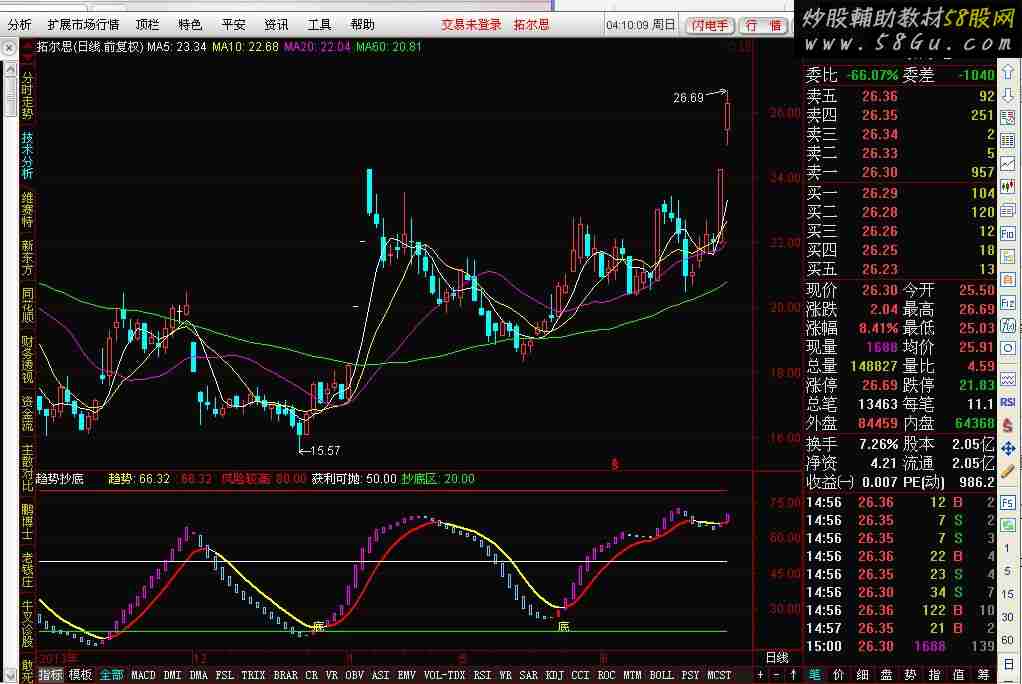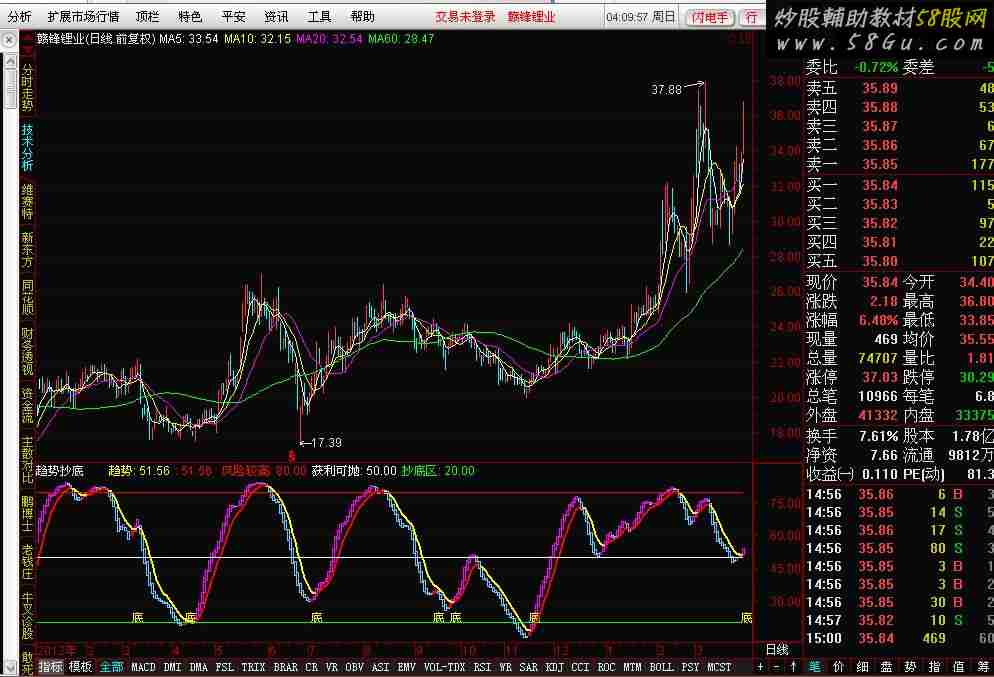 VAR2:=(CLOSE-LLV(LOW,20))/(HHV(HIGH,20)-LLV(LOW,20))*100; VAR3:=SMA(SMA(VAR2,3,1),3,1)/30; VAR4:=EMA(VAR3,5); VAR5:=3*VAR3-2*VAR4; AA:=CROSS(VAR5,VAR3) AND VAR3<2.1 AND C>O; VAR6:=(2*CLOSE+HIGH+LOW)/4; VAR7:=LLV(LOW,22); VAR8:=HHV(HIGH,22); VAR9:=EMA((VAR6-VAR7)/(VAR8-VAR7)*100,13); VARA:=EMA(0.667*REF(VAR9,1)+0.333*VAR9,2); STICKLINE(VAR9>VARA,VAR9,VARA,1,1), COLORMAGENTA; STICKLINE(VAR9<=VARA,VAR9,VARA,1,1), COLORFFCC66; STICKLINE(CROSS(VAR5,VAR3) AND VAR3<2.1 AND C>O,VAR9,VARA,1,0),COLORRED; DRAWTEXT(CROSS(VAR5,VAR3) AND VAR3<2.1 AND C>O,22,'底'),COLORYELLOW; 趋势: EMA(0.382*REF(VAR9,2)+0.618*VAR9,6); IF(趋势>REF(趋势,1),趋势,DRAWNULL),COLORRED,LINETHICK2; IF(趋势<REF(趋势,1),趋势,DRAWNULL),COLORYELLOW,LINETHICK2; 风险较高:80,COLORRED; 获利可抛:50,COLORWHITE; 抄底区:20,COLORGREEN; 以下为条件选股公式:VAR2:=(CLOSE-LLV(LOW,20))/(HHV(HIGH,20)-LLV(LOW,20))*100; VAR3:=SMA(SMA(VAR2,3,1),3,1)/28.57; VAR4:=EMA(VAR3,5); VAR5:=3*VAR3-2*VAR4; 选股:CROSS(VAR5,VAR3) AND VAR3<2.1 AND C>O;