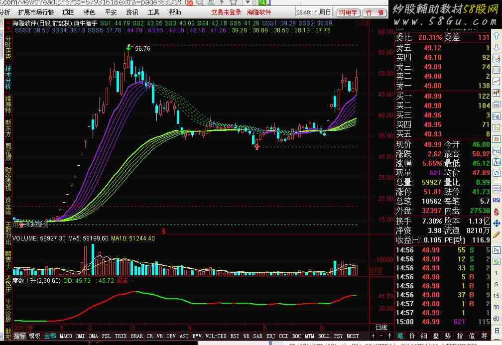 【带买点的神奇均线主图(源码) 】这个指标很一般。如果你真的需要指标的话,我个人感觉下面的指标还是不错的。显示的未来函数是线段,不影响指标的正常使用。疯牛猎手(主图)通达信SS1:EMA(C,10),COLOR61DC16 DOTLINE; SS2:EMA(SS1,3),COLOR61DC16 DOTLINE; SS3:EMA(SS2,3),COLOR61DC16 DOTLINE; SS4:EMA(SS3,3),COLOR61DC16 DOTLINE; SS5:EMA(SS4,3),COLOR61DC16 DOTLINE; SSS1:EMA(C,45),COLORD1875A DOTLINE; SSS2:EMA(SSS1,3),COLORD1875A DOTLINE; SSS3:EMA(SSS2,3),COLORD1875A DOTLINE; SSS4:EMA(SSS3,3),COLORD1875A DOTLINE; SSS5:EMA(SSS4,3),COLORD1875A DOTLINE; IF(SS1>REF(SS1,1),SS1,DRAWNULL),COLORFF1CAE LINETHICK2; IF(SS2>REF(SS2,1),SS2,DRAWNULL),COLORFF1CAE; IF(SS3>REF(SS3,1),SS3,DRAWNULL),COLORFF1CAE; IF(SS4>REF(SS4,1),SS4,DRAWNULL),COLORFF1CAE; IF(SS5>REF(SS5,1),SS5,DRAWNULL),COLORFF1CAE;IF(SSS1>REF(SSS1,1),SSS1,DRAWNULL),COLOR00FF7F LINETHICK2; IF(SSS2>REF(SSS2,1),SSS2,DRAWNULL),COLOR00FF7F; IF(SSS3>REF(SSS3,1),SSS3,DRAWNULL),COLOR00FF7F; IF(SSS4>REF(SSS4,1),SSS4,DRAWNULL),COLOR00FF7F; IF(SSS5>REF(SSS5,1),SSS5,DRAWNULL),COLOR00FF7F;NN:=21; AA:=REF(H,NN)=HHV(H,2*NN+1); AA1:=REF(L,NN)=LLV(L,2*NN+1); QY:=BACKSET(AA,NN+1); QY1:=BACKSET(AA1,NN+1); CC:=FILTER(QY,NN) AND H=HHV(H,NN+1);CC1:=FILTER(QY1,NN) AND L=LLV(L,NN+1); DRAWICON(CC1,L,1); DRAWICON(CC,H,2); DDD:=BARSLAST(CC); DD1:=BARSLAST(CC1); GDTS:=IF(CC,CURRBARSCOUNT,0); DDTS:=IF(CC1,CURRBARSCOUNT,0); DINGBUTS:=IF(DDD,REF(GDTS,DDD),GDTS); DDTS1:=IF(DD1,REF(DDTS,DD1),DDTS); GDCS1:=CONST(DINGBUTS); DDCS1:=CONST(DDTS1); GDCS13:=CONST(REF(HIGH,GDCS1-1)); DDCS13:=CONST(REF(L,DDCS1-1)); DINGBUTS1:=REF(DINGBUTS,DDD+1); DDTS2:=REF(DDTS1,DD1+1); GDCS2:=CONST(DINGBUTS1); DDCS2:=CONST(DDTS2); GDCS23:=CONST(REF(HIGH,DINGBUTS1-1)); DDCS23:=CONST(REF(L,DDTS2-1)); XG1:=BACKSET(ISLASTBAR,GDCS1); XD1:=BACKSET(ISLASTBAR,DDCS1); XG2:=BACKSET(ISLASTBAR,DINGBUTS1); XD2:=BACKSET(ISLASTBAR,DDTS2);STICKLINE(XG2,GDCS23,GDCS23,1,1),COLORRED; STICKLINE(XG1,GDCS13,GDCS13,1,1),COLORRED; DDDDDDD:STICKLINE(XD2,DDCS23,DDCS23,1,1),COLORGREEN; EEEEEEE:STICKLINE(XD1,DDCS13,DDCS13,1,1),COLORGREEN;   |