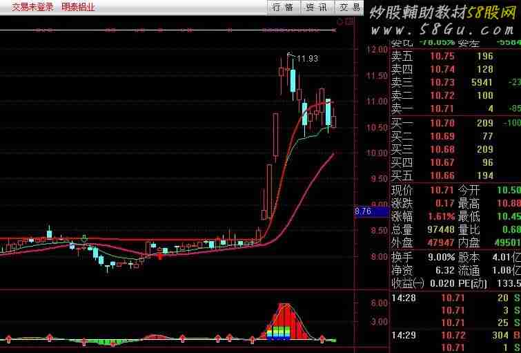非原创,采用的是本论坛几位原创老师的,经过自己的组合而成,不含未来。 用法: 1、短期买点:股价站上BBI线或次趋势上。 2、加仓点:股价站上飞天线上。 3、卖点:股价下飞天线。 4、离场:股价下次趋势线。R1:=(C+L+H)/3;R2:=EMA(R1,6);R3:=EMA(R2,5);次趋势:EMA(R3,13)COLORLIMAGENTA,LINETHICK2;BBI线:(MA(CLOSE,3)+MA(CLOSE,6)+MA(CLOSE,12)+MA(CLOSE,24))/4,COLORGREEN,LINETHICK1;V5:=EMA(CLOSE,1);主线:=EMA(V5,5) ; 本:=EMA(HHV(主线,5),1);急进:=EMA(HHV(本,13),1);稳健:=EMA(HHV(急进,13),2);飞天:EMA(HHV(稳健,17),3),LINETHICK2, COLORRED;V6:=EMA(CLOSE,1);基线:=EMA(V6,17) ; 高:=EMA(HHV(基线,17),1);进:=EMA(HHV(高,169),1);稳:=EMA(HHV(进,169),2);牛起跑:EMA(HHV(稳,169),3),LINETHICK2, COLORYELLOW;  |