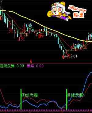 个股:EMA(100*(C-LLV(LOW,34))/(HHV(H,34)-LLV(LOW,34)),3),COLOR1010FF; 大盘:EMA(100*(INDEXC-LLV(INDEXL,34))/(HHV(INDEXH,34)-LLV(INDEXL,34)),3),COLORE67010,LINETHICK2; 短线反弹:IF(CROSS(个股,9),50,0),STICK,LINETHICK3,COLOR00FF00; DRAWTEXT(CROSS(个股,9),40,'短线反弹!'),COLOR00FF00; VAR1:=EMA(CLOSE,3); VAR2:=EMA(CLOSE,21); VAR3:=BARSLAST(CROSS(VAR2,VAR1))>15; VAR4:=VOL>MA(VOL,5)*2 AND VOL<MA(VOL,5)*5; VAR5:=CROSS(VAR1,VAR2) AND VAR4 AND VAR3; 黑马:IF(VAR5,80,0),STICK,LINETHICK4,COLORF00FF0; DRAWTEXT(VAR5,70,'黑马!'),COLORF00FF0;