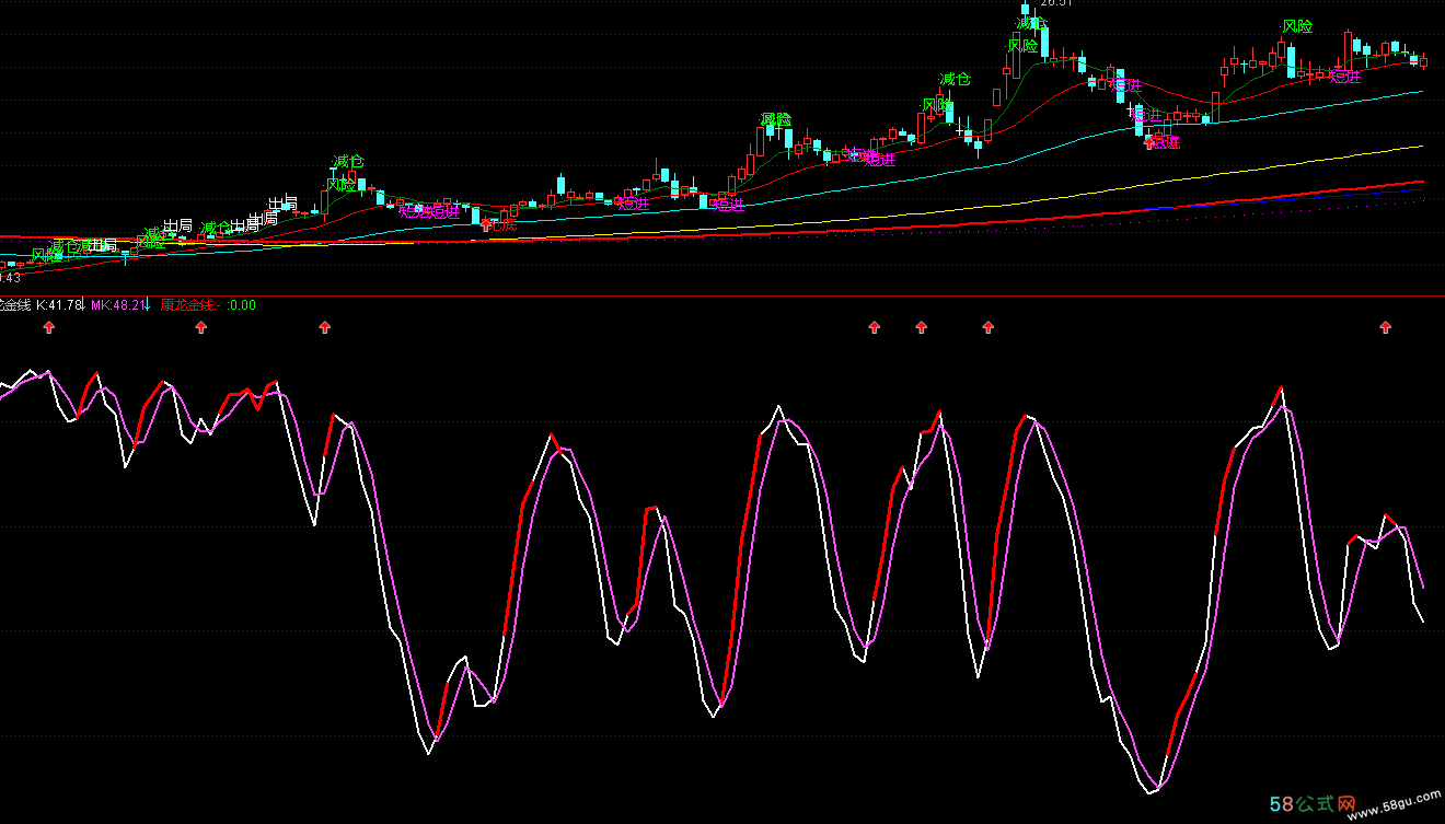 TYP := (HIGH + LOW + CLOSE)/3; CC1:=(TYP-MA(TYP,14))/(0.015*AVEDEV(TYP,14)); MC1:=MA(CC1,3); LC :=REF(CLOSE,1); RSI1:=SMA(MAX(CLOSE-LC,0),7,1)/SMA(ABS(CLOSE-LC),7,1)*100; MR1:=MA(RSI1,3); RSV:=(CLOSE-LLV(LOW,9))/(HHV(HIGH,9)-LLV(LOW,9))*100; K:SMA(RSV,3,1),LINETHICK2,COLORWHITE; MK:MA(K,3),LINETHICK2,COLORFF50FF; A:=CROSS(CC1,MC1) AND CROSS(RSI1,MR1) AND CROSS(K,MK); B:=(CROSS(CC1,MC1) OR CC1>MC1) AND (CROSS(RSI1,MR1) OR RSI1>MR1); AA:=(CROSS(RSI1,MR1)OR RSI1>MR1) AND (CROSS(K,MK) OR K>MK); BB:=(CROSS(CC1,MC1) OR CC1>MC1) AND (CROSS(K,MK) OR K>MK); GG:=B OR AA OR BB; DIF:=EMA(CLOSE,12)-EMA(CLOSE,26); DEA:=EMA(DIF,9); MACD:=(DIF-DEA)*2; MQS:=DEA>REF(DEA,1) OR (DEA>=0 AND MACD>REF(MACD,1)); DRAWICON(A,100,1),COLORGREEN; 康龙金线:IF(GG AND MQS,K,DRAWNULL),COLORRED,LINETHICK3;