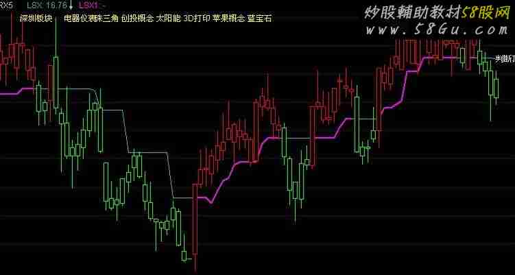 TR1:=MAX(MAX((HIGH-LOW),ABS(REF(CLOSE,1)-HIGH)),ABS(REF(CLOSE,1)-LOW));ATR:=MA(TR1,13);VAR1:=REF(CLOSE,1)-REF(ATR,1);LSX:HHV(VAR1,13),LINETHICK1,COLORLIBLUE;LSX1:IF(C>=LSX,LSX,DRAWNULL),COLORMAGENTA,LINETHICK2;{划K线}STICKLINE(C>=LSX,O,C,2.5,1),COLORRED;STICKLINE(C>=LSX AND C>=O,C,H,0,1),COLORRED;STICKLINE(C>=LSX AND C>=O,O,L,0,1),COLORRED;STICKLINE(C>=LSX AND C<O,O,H,0,1),COLORRED;STICKLINE(C>=LSX AND C<O,C,L,0,1),COLORRED;STICKLINE(C<LSX,O,C,2.5,1),COLORGREEN;STICKLINE(C<LSX AND C>O,C,H,0,1),COLORGREEN;STICKLINE(C<LSX AND C>O,O,L,0,1),COLORGREEN;STICKLINE(C<LSX AND C<O,O,H,0,1),COLORGREEN;STICKLINE(C<LSX AND C<O,C,L,0,1),COLORGREEN; |