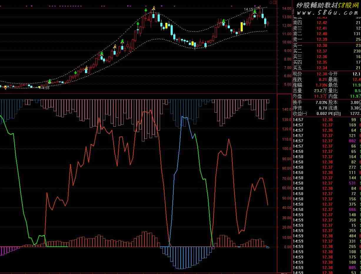 用得不错,不能独享。。分享给大家,希望大家都吃上肉!!A1:=CAPITAL; A2:=(((H + L) + O) + C) / 4; A3:=(((INDEXH + INDEXL) + INDEXO) + INDEXC) / 4; A4:=(A2 - (REF(A2,1))) / (REF(A2,1)); A5:=(A3 - (REF(A3,1))) / (REF(A3,1)); A6:=(((SUM(A4,10)) + (SUM(A5,10))) / 10) * 1000; A7:=IF(((A6 > 0) AND (A6 < 75)),A6,(IF((A6 > 75),75,0))); A8:=IF(((A6 < 0) AND (A6 > -75)),REVERSE(A6),(IF((A6 < -75),75,0))); STICKLINE(A8,150,(150 - A8),3,1),COLOR825200; STICKLINE(A7,150,(150 - A7),3,1),COLOR7A67CF; {A9:=(VOL * (((A2 * 2) - HIGH) - LOW)) / (HIGH - LOW); A10:=IF(((HIGH = LOW) AND (A2 < (REF(A2,1)))),(-1 * VOL),VOL); A11:=IF((HIGH = LOW),A10,A9); A12:=SUM(A11,11); A13:=(A12 / (A1 * 11)) * 10000; A14:=IF(((A13 < 150) AND (A13 > -150)),A13,150); A15:=IF((A14 > 0),A14,0); A16:=IF((A14 < 0),REVERSE(A14),0); STICKLINE((A14 > 0),0,A15,3,1),COLORYELLOW; STICKLINE((A14 < 0),0,A16,3,0),COLOR2E9F15;} A17:=(SUM((A2 * VOL),16)) / (SUM(VOL,16)); A18:=(SUM((A2 * VOL),11)) / (SUM(VOL,11)); A19:=(SUM((A2 * VOL),6)) / (SUM(VOL,6)); A20:=((SUM((A2 * VOL),7)) - (A2 * VOL)) / ((SUM(VOL,7)) - VOL); A21:=((A18 - A17) / A2) * 1000; A22:=IF((A21 > 50),50,(IF((A21 < -50),-50,A21))); A23:=((A19 - A18) / A2) * 1000; A24:=IF((A23 > 50),50,(IF((A23 < -50),-50,A23))); A25:=((((A19 - A20) / A20) * 5) / 4) * 1000; A26:=IF((A25 > 50),50,(IF((A25 < -50),-50,A25))); A27:=(A22 + A24) + A26;红柱线:IF((A27 > 0),A27,0),COLOR003ADB,LINETHICK2;兰柱线:IF((A27 < 0),REVERSE(A27),0),COLORE99A2C,LINETHICK2; {A28:=IF((兰柱线 < 150),兰柱线,(IF((兰柱线 = 150),65,0))); A29:=IF((兰柱线 = 150),60,0); A30:=IF((红柱线 < 150),红柱线,(IF((红柱线 = 150),65,0))); A31:=IF((红柱线 = 150),60,0); A32:=(((红柱线 > (REF(红柱线,1))) AND (红柱线 > 49)) AND (CLOSE < (REF(CLOSE,1)))) AND ((OPEN < (REF(CLOSE,1))) OR ((OPEN = (REF(CLOSE,1))) AND ((HIGH / (REF(CLOSE,1))) < 1.02))); DRAWICON(A32,90,9),COLORGREEN;} {超跌短线买点:(兰柱线 = 150) AND ((CLOSE < OPEN) OR (CLOSE > OPEN)),COLORRED; A33:=SUMBARS(VOL,(A1 * 0.8)); A34:=IF((A33 < 9),9,A33); A35:=HHV(A2,A34); A36:=LLV(A2,A34); A37:=IF((A35 = A36),0,((100 * (A2 - A36)) / (A35 - A36)));} {中趋势线:(1.5 * (SUM(A37,6))) / 6,LINETHICK2,COLORRED;长趋势线:(SUM(中趋势线,6)) / 6,LINETHICK2,COLORGREEN;} {A38:=((HIGH - A2) > (A2 - LOW)) OR ((HIGH = LOW) AND (LOW < (REF(CLOSE,1)))); A39:=FILTER(A38,5);} A40:=EMA((((CLOSE - (LLV(LOW,25))) / ((HHV(HIGH,25)) - (LLV(LOW,25)))) * 4),4); {DRAWTEXT((FILTER((A40 > 3.6),10)),155,'考虑出货'),COLORGREEN;} {DRAWTEXT((FILTER((A40 < 0.25),5)),30,'考虑买入'),COLORRED; A42:=(EMA((((CLOSE - (LLV(LOW,33))) / ((HHV(HIGH,21)) - (LLV(LOW,33)))) * 100),20)) * 0.998; A43:=EMA(((0.667 * (REF(A42,1))) + (0.333 * A42)),1); STICKLINE((A43 < 20),20,(20 + 20),4,0),COLORMAGENTA; DRAWTEXT((超跌短线买点 = 1),60,'超跌短线买点'),COLORWHITE; DRAWTEXT((A32 = 1),60,'超强短线买点'),COLORYELLOW;买方能量:(A15),COLORYELLOW,LINETHICK1;}; {新加}MACD:="MACD.MACD"(12,26,9)*25; STICKLINE((MACD>0),MACD,0,3,1),COLOR003ADB,LINETHICK2; STICKLINE((MACD < 0),MACD,0,3,1),COLORE99A2C,LINETHICK2; STICKLINE(( "MACD.MACD"(12,26,9)>"MACD.DIF"(12,26,9) AND MACD < 0 ),MACD,0,3,1),COLORFF00FF,LINETHICK2; DIF负:IF("MACD.DIF"(12,26,9)<0,兰柱线,DRAWNULL),COLORGREEN,LINETHICK2; |