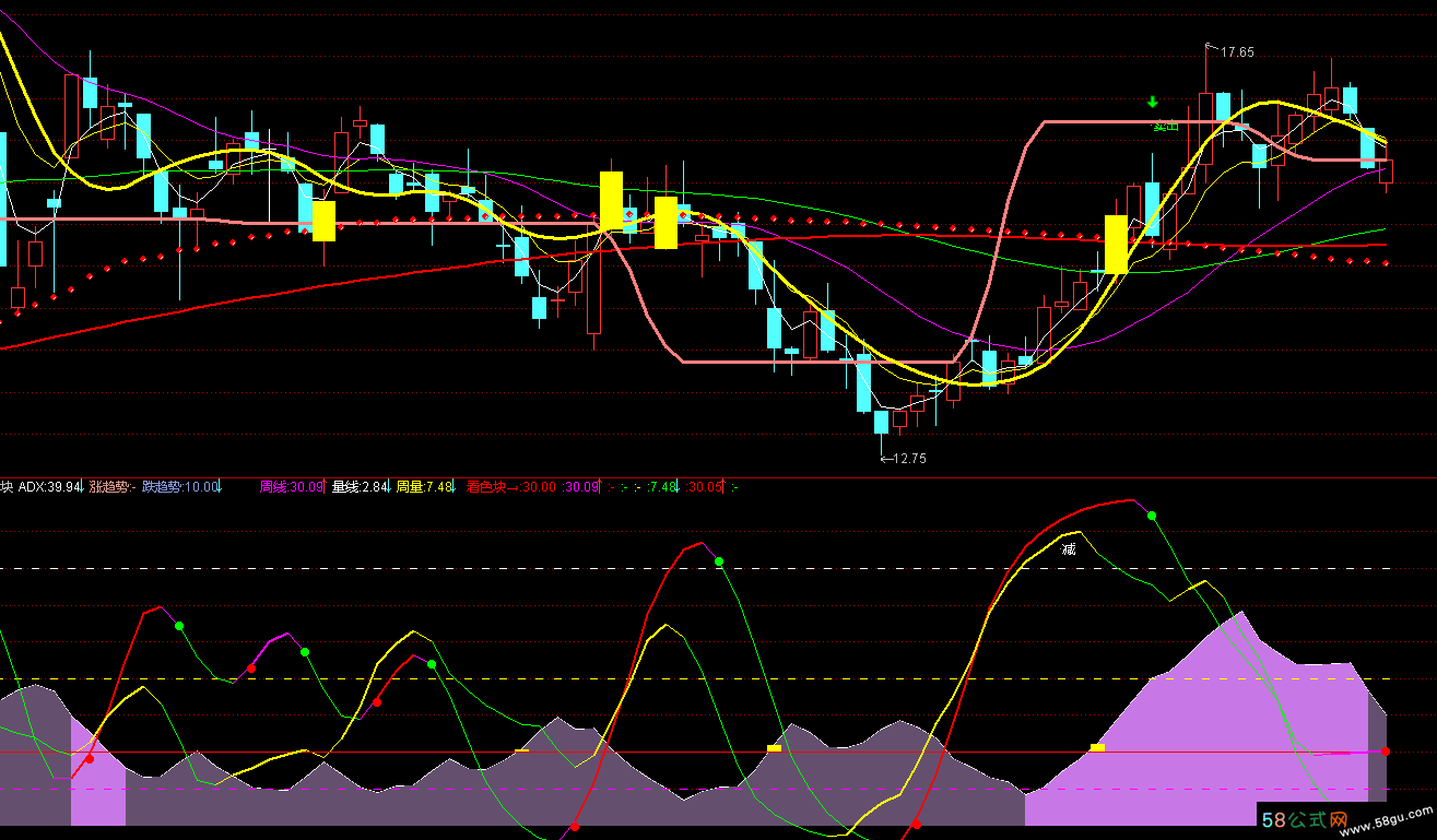 {DMIA} ATRA := SMA(MAX(MAX(HIGH-LOW,ABS(HIGH-REF(CLOSE,1))),ABS(LOW-REF(CLOSE,1))),6,1); HD := HIGH-REF(HIGH,1); LD := REF(LOW,1)-LOW; DMP:= SMA(IF(HD>0 AND HD>LD,HD,0),6,1); DMM:= SMA(IF(LD>0 AND LD>HD,LD,0),6,1); PDI:= DMP*100/ATRA; MDI:= DMM*100/ATRA; ADX: SMA(ABS(MDI-PDI)/(MDI+PDI)*100,6,1),LINETHICK2; 涨趋势:IF((MDI-PDI)/(MDI+PDI)<0,10,DRAWNULL),COLOR8899DD,NODRAW; 跌趋势:IF((MDI-PDI)/(MDI+PDI)>=0,10,ADX),COLORDD9988,NODRAW;DRAWBAND(ADX,RGB(100,80,110),10,0); DRAWBAND(跌趋势,RGB(200,120,230),涨趋势,RGB(180,124,204)); 对比线:=(ADX+REF(ADX,6))/2; STICKLINE(CROSS(ADX,30),ADX,30,3,0),COLOR00FFFF,LINETHICK5; STICKLINE(C>0,80,80,1.5,0),COLORFFFFFF; STICKLINE(C>0,50,50,1.5,0),COLOR00FFFF; STICKLINE(C>0,20,20,1.5,0),COLORFF00FF; WW1:=SMA(((CLOSE-LLV(CLOSE,10))/(HHV(HIGH,10)-LLV(LOW,10))),3,1); WW2:=SMA(((WW1-LLV(WW1,3))/(HHV(WW1,3)-LLV(WW1,3))),3,1)*100; ZZ:=SMA(((VOL-LLV(VOL,10))/(HHV(VOL,10)-LLV(VOL,10))),3,1); ZZ1:=SMA(((ZZ-LLV(ZZ,3))/(HHV(ZZ,3)-LLV(ZZ,3))),3,1)*100; 快线:=EMA(WW2,1),COLORBLUE,LINETHICK2; 慢线:=EMA(快线,2),COLORGREEN,LINETHICK2; 量快:=EMA(ZZ1,1)COLORWHITE,LINETHICK2; 量慢:=EMA(量快,2),COLORWHITE,LINETHICK2; AA1:=SMA(((CLOSE-LLV(CLOSE,13))/(HHV(HIGH,13)-LLV(LOW,13))),3,1); 价线:=SMA(((AA1-LLV(AA1,4))/(HHV(AA1,4)-LLV(AA1,4))),3,1)*100; 周线:MA(价线,5),COLORMAGENTA,LINETHICK1; BB1:=SMA(((VOL-LLV(VOL,13))/(HHV(VOL,13)-LLV(VOL,13))),3,1); 量线:SMA(((BB1-LLV(BB1,4))/(HHV(BB1,4)-LLV(BB1,4))),3,1)*100,NODRAW; 周量:MA(量线,5),COLORYELLOW,LINETHICK1; 月线:=MA(价线,22),COLORRED,LINETHICK0; 月量:=MA(量线,22),COLORYELLOW,LINETHICK0;快线2:=EMA(周线,1),COLORBLUE,LINETHICK2; 慢线2:=EMA(快线2,2),COLORGREEN,LINETHICK2; 量快2:=EMA(周量,1); 量慢2:=EMA(量快2,2),COLORWHITE,LINETHICK2; DRAWTEXT(FILTER(快线>=95 AND 慢线>=95 AND 周线>=90 OR 周量>=90,5),85,'减'); 看色块→:30,COLORRED; IF(周线>=REF(周线,1),周线,DRAWNULL),COLORMAGENTA,LINETHICK2; IF(周线>=REF(周线,1) AND 月线>=REF(月线,1),周线,DRAWNULL),COLORRED,LINETHICK2; IF(周线<REF(周线,1),周线,DRAWNULL),COLORGREEN,LINETHICK1; IF(周量>=REF(周量,1),周量,DRAWNULL),COLORYELLOW,LINETHICK2; IF(周量<REF(周量,1),周量,DRAWNULL),COLORGREEN,LINETHICK1;IF(CROSS(快线2,慢线2),慢线2,DRAWNULL),COLORRED,LINETHICK3,CIRCLEDOT; IF(CROSS(慢线2,快线2),快线2,DRAWNULL),COLORGREEN,LINETHICK3,CIRCLEDOT; IF(CROSS(量快2,量慢2),量慢2,DRAWNULL),COLORRED,LINETHICK2,CIRCLEDOT; IF(CROSS(量慢2,量快2),量快2,DRAWNULL),COLORLIGREEN,LINETHICK3,CIRCLEDOT;