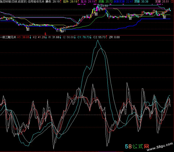 KK:=(CLOSE-LLV(LOW,9)-(HHV(HIGH,9)-LLV(LOW,9))/2)/((HHV(HIGH,9)-LLV(LOW,9))/2)*100; K1:SMA(KK,3,1),COLOR0000FF; K2:SMA(K1,3,1),COLORA8A8FF; II:=(HIGH +LOW + CLOSE)/3; I1:(II-MA(II,14))/(0.03*AVEDEV(II,14)),COLOREEEEEE; I2:MA(I1,3),COLOR999999; C1:(EMA(CLOSE,12)-EMA(CLOSE,26))*100,COLORFFFF00; C2:EMA(C1,9),COLOREEEEAA;