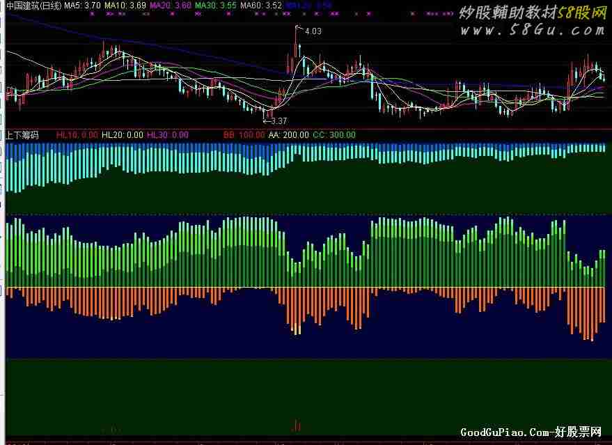 STICKLINE(C>0,300,400,100,0),COLOR002300; STICKLINE(C>0,200,300,100,0),COLOR320000; STICKLINE(C>0,100,200,100,0),COLOR320000; STICKLINE(C>0,-5,100,100,0),COLOR002300; HL10:WINNER(C/1.1)*100,STICK,COLOR0000FF; HL20:WINNER(C/1.2)*100,STICK,COLOR00FFFF; HL30:WINNER(C/1.3)*100,STICK,COLORFF00FF; TL10:=(1-WINNER(C/0.9))*100; TL20:=(1-WINNER(C/0.8))*100; TL30:=(1-WINNER(C/0.7))*100; STICKLINE(TL10>-10,400,400-TL10,1,0),COLORFFFF33; STICKLINE(TL20>-10,400,400-TL20,1,0),COLORFF6600; STICKLINE(TL30>-10,400,400-TL30,1,0),COLORCC0000; CXH10:=(WINNER(C)-WINNER(C/1.1))*100; CXH20:=(WINNER(C)-WINNER(C/1.2))*100; CXH30:=(WINNER(C)-WINNER(C/1.3))*100; STICKLINE(CXH30>-10,200,200-CXH30,1,0),COLOR99FFFF; STICKLINE(CXH20>-10,200,200-CXH20,1,0),COLOR33CCFF; STICKLINE(CXH10>-10,200,200-CXH10,1,0),COLOR0066FF; CST10:=(WINNER(C/0.9)-WINNER(C))*100; CST20:=(WINNER(C/0.8)-WINNER(C))*100; CST30:=(WINNER(C/0.7)-WINNER(C))*100; STICKLINE(CST30>-10,200,200+CST30,1,0),COLOR99FF66; STICKLINE(CST20>-10,200,200+CST20,1,0),COLOR00FF33; STICKLINE(CST10>-10,200,200+CST10,1,0),COLOR009900; BB:100,POINTDOT,LINETHICK2,COLORRED; AA:200,COLORYELLOW; CC:300,POINTDOT,LINETHICK2,COLORGREEN;