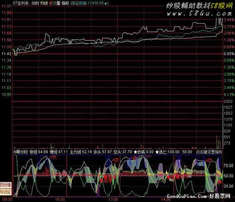 VAR1:=REF(CLOSE,3.5); VAR2:=REF(CLOSE,1); VAR3:=SMA(MAX(CLOSE-VAR2,0),7,1)/SMA(ABS(CLOSE-VAR2),7,1)*100; Q2:=(CLOSE-LLV(LOW, 21))/(HHV(HIGH, 21)-LLV(LOW, 21))*100; Q3:=SMA(Q2, 9, 1); Q4:=SMA(Q3, 3, 1); Q8:=HHVBARS(HIGH, 50); Q10:=(CLOSE-REF(OPEN, Q8))/REF(OPEN, Q8)*100; 快线: SMA(MAX(CLOSE-VAR1,0),7,1)/SMA(ABS(CLOSE-VAR1),7,1)*100,COLORFFAA66; 慢线:EMA(Q3, 3),COLORRED; DRAWBAND(快线,RGB(115,95,120),慢线,RGB(95,120,115)); A:=VOL*CLOSE; B:=SUM(A,3.52)/SUM(VOL,3.82); B1:=EMA(B,13); 主力线:(B-B1)*191/B+50,COLORMAGENTA; 多头:3*Q3-2*Q4,COLORYELLOW; VAR12:=(HHV(HIGH,36)-CLOSE)/(HHV(HIGH,36)-LLV(LOW,36))*100; 空头: SMA(VAR12,3,1),COLORGREEN; DRAWTEXT(CROSS(慢线, 多头) AND REF(多头,1)>80, REF(多头,3), '*顶'),COLORRED,LINETHICK5; ●关注: DRAWTEXT(REF(CROSS(空头,慢线),25) AND 空头>1.005*慢线,慢线,'●关注'),COLORBLUE,LINETHICK1; ★关注: DRAWTEXT(REF(CROSS(慢线,多头),82) AND 慢线>1.3*多头,多头,'★关注'),LINETHICK1; ★追涨: DRAWTEXT(REF(CROSS(多头,慢线),1) AND 多头>1.3*慢线,慢线,'★追涨'),COLORRED,LINETHICK1; ★抄底:IF(CROSS(多头,慢线) AND 快线>=REF(快线,1) AND 多头>=REF(多头,1) AND 慢线<38.2 AND 慢线>=REF(慢线,1) AND COUNT(REF(快线,1)<REF(快线,2) OR REF(慢线,1)<REF(慢线,2) OR REF(多头,1)<REF(多头,2),3)>=2,30,0),COLORMAGENTA; DRAWTEXT(CROSS(多头, 8) AND Q10<-13,20,'*大底'),COLORYELLOW,LINETHICK5; ★逃亡:IF(快线< REF(快线,1) AND 快线>61.8,70,100),COLORBLUE; 50,POINTDOT,COLORWHITE; AZ1:=AMOUNT/VOL/100; AZ2:=(3*HIGH+LOW+OPEN+2*CLOSE)/7; AZ3:=SUM(AMOUNT,40)/AZ1/100; AZ4:=SUM(AMOUNT,80)/AZ1/100; BZ1:=DMA(AZ2,VOL/AZ3); BZ2:=DMA(AZ2,VOL/AZ4); BZ3:=(CLOSE-BZ1)/BZ1*100; BZ4:=(CLOSE-BZ2)/BZ2*100; DRAWTEXT(ISLASTBAR AND C,93,' 冷眼分时专用指标'),COLOR00AAFF; DRAWTEXT(ISLASTBAR AND C,80,' 55上红柱谨慎看多'),COLOR00BBBB; DRAWTEXT(ISLASTBAR AND C,68,' 50下绿柱保持警惕'),COLOR00BBBB; DRAWTEXT(ISLASTBAR AND C,56,' 结合多(黄)空(绿)线'),COLOR00BBBB; DRAWTEXT(ISLASTBAR AND C,44,' 选择正确操作时段'),COLOR00BBBB; DRAWTEXT(ISLASTBAR AND C,32,' 按照图中提示关注'),COLOR00BBBB; DRAWTEXT(ISLASTBAR AND C,20,' 严格遵守操作纪律'),COLOR00BBBB; DRAWTEXT(ISLASTBAR AND C,8,' 心态平衡投资顺利'),COLOR00BBBB; STICKLINE(FILTER(C,60)>0,100,-0,0,0),COLORRED; STICKLINE(BZ4>0,50,50+13.82*BZ4,0,0),COLORYELLOW; STICKLINE(BZ3>0,50,50+13.82*BZ3,0,0),COLORRED; STICKLINE(BZ3<=0,50,50+13.82*BZ3,0,0),COLORGREEN;