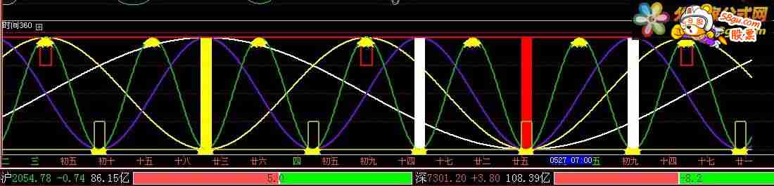AX:=BARSCOUNT(c); 超周期:100-COS(AX/360*(N/12))*100,LINETHICK2,COLORWHITE; 大周期:100-COS(AX/360*(N/6))*100,LINETHICK2,COLORYELLOW; 小周期:100-COS(AX/360*(N/4))*100,LINETHICK2,COLOR7F00FF; 短周期:100-COS(AX/360*(N/2))*100,LINETHICK2,COLOR00bb00; STICKLINE(短周期<5 AND 小周期>195,小周期,短周期,5,0),COLORWHITE; STICKLINE(短周期<5 AND 大周期<5 AND 超周期>195 AND 小周期>195,小周期,短周期,5,0),COLORYELLOW; STICKLINE(短周期<5 AND 大周期<5 AND 超周期<5 AND 小周期<5 ,200,短周期,5,0),COLORRED; STICKLINE(短周期>195 AND 大周期>195 AND 超周期>195 AND 小周期>195,2,短周期,5,0),COLORRED; if(短周期>195 AND 大周期>195 ,150,200),COLORRED,LINETHICK2; if(短周期<5 AND 小周期<5 ,50,0),COLORAAAA00,LINETHICK2; DRAWTEXT(短周期<5 or 短周期>195,短周期,'★'),COLORYELLOW; |