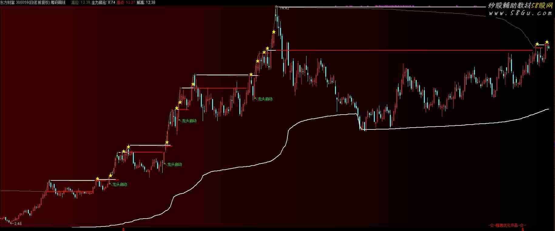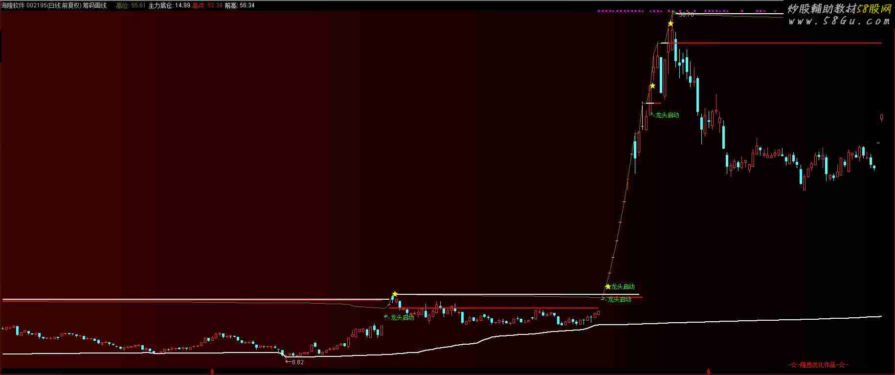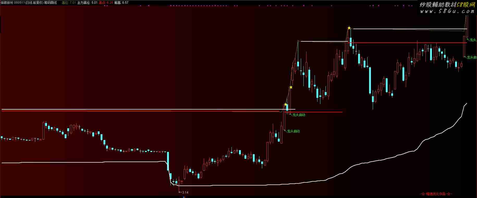 此图根据筹码原理,做了一个筹码画线指标,突破筹码时会出五角星★,此时更加多留意,当然出现龙头启动时突破更强势。 有人害怕里面有未来函数,不懂得函数公式用途的人不要信口开河,此未来函数只是用来画水平直线,不影响判断,害怕就不要下载了DRAWGBK(C>O,RGB(60,0,0),RGB(0,0,0),1,2,1);DRAWTEXT_FIX(1,0.88,5,0,'~☆~隆逸优化作品~☆~'),COLORRED;DRAWKLINE(H,O,L,C);ZT:=REF(C,1)*1.1-C<0.01 AND H=C;{涨停}高位:COST(99.9),COLORBROWN;主力底仓:COST(1),COLORWHITE,LINETHICK2;上突破:=高位>REF(高位,1) AND REF(高位,1)<=REF(高位,2);下突破:=高位<=REF(高位,1) AND REF(高位,1)>REF(高位,2);高点:DRAWLINE(上突破,REF(高位,1),REF(上突破,1),REF(REF(高位,1),1),1)COLORRED, LINETHICK2;前高:DRAWLINE(下突破,高位,REF(下突破,1),REF(高位,1),1)COLORWHITE, LINETHICK2;龙头启动:=CROSS(C,高点) OR CROSS(C,前高) AND ZT;突破:=CROSS(C,前高);DRAWTEXT(龙头启动,L,'↖龙头启动'),COLORGREEN;DRAWTEXT(突破,H,'★'),COLORYELLOW;   |