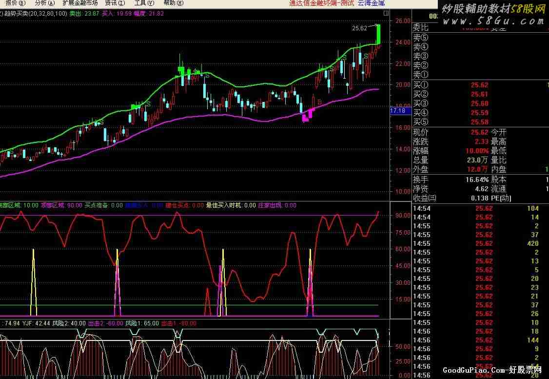 趋势线: 3*SMA((CLOSE-LLV(LOW,27))/(HHV(HIGH,27)-LLV(LOW,27))*100,5,1)-2*SMA(SMA((CLOSE-LLV(LOW,27))/(HHV(HIGH,27)-LLV(LOW,27))*100,5,1),3,1),LINETHICK2,COLORRED; 底部区域:10,COLORGREEN; 顶部区域:90,COLORMAGENTA; 买点准备:IF(趋势线<=10,40,0),COLORLIGREEN; 底部买入:IF(CROSS(趋势线,底部区域),55,0),LINETHICK2,COLORBLUE; {最佳买入时机} LC:=REF(CLOSE,1); RSI5:=((SMA(MAX((CLOSE - LC),0),5,1) / SMA(ABS((CLOSE - LC)),5,1)) * 100); TR1:=SUM(MAX(MAX((HIGH - LOW),ABS((HIGH - REF(CLOSE,1)))),ABS((LOW - REF(CLOSE,1)))),10); HD:=(HIGH - REF(HIGH,1)); LD:=(REF(LOW,1) - LOW); DMP:=SUM(IF(((HD > 0) AND (HD > LD)),HD,0),10); DMM:=SUM(IF(((LD > 0) AND (LD > HD)),LD,0),10); PDI:=((DMP * 100) / TR1); MDI:=((DMM * 100) / TR1); ADX:=MA(((ABS((MDI - PDI)) / (MDI + PDI)) * 100),5); AV:=(RSI5 + ADX); DXR:=(((ADX + REF(ADX,5)) / 2) + RSI5); WR10:=((100 * (HHV(HIGH,10) - CLOSE)) / (HHV(HIGH,10) - LLV(LOW,10))); NEWVOL:=(RSI5 - WR10); 最佳买入:=(AV + NEWVOL); 最佳买入选股:=IF(CROSS(最佳买入,0),1,0),STICK,COLORRED; VAR1:=SMA(最佳买入选股,3,1); VAR2:=SMA(VAR1,3,1); VAR3:=SMA(VAR2,3,1); 建仓买点:IF(CROSS(VAR2,VAR3) AND (VAR2<40),25,0),LINETHICK2,COLOR0000FF; RSV:=(((CLOSE - LLV(LOW,9)) / (HHV(HIGH,9) - LLV(LOW,9))) * 50); K:=SMA(RSV,3,1); D:=SMA(K,3,1); J:=3*K-2*D; X:=LLV(J,2)=LLV(J,8); 最佳买入时机: IF(CROSS(J,3),60,0),LINETHICK2,COLORYELLOW; RSV19:=(CLOSE-LLV(LOW,9))/(HHV(HIGH,9)-LLV(LOW,9))*100; K12:=SMA(RSV19,3,1); D12:=SMA(K12,3,1); J12:=3*K12-2*D12; J31:=REVERSE(J12); AA:=REF(MA(C,1),10)>REF(MA(C,60),10); 庄家出现:IF(CROSS(J12,J31) AND AA,45,0),LINETHICK2,COLORMAGENTA;