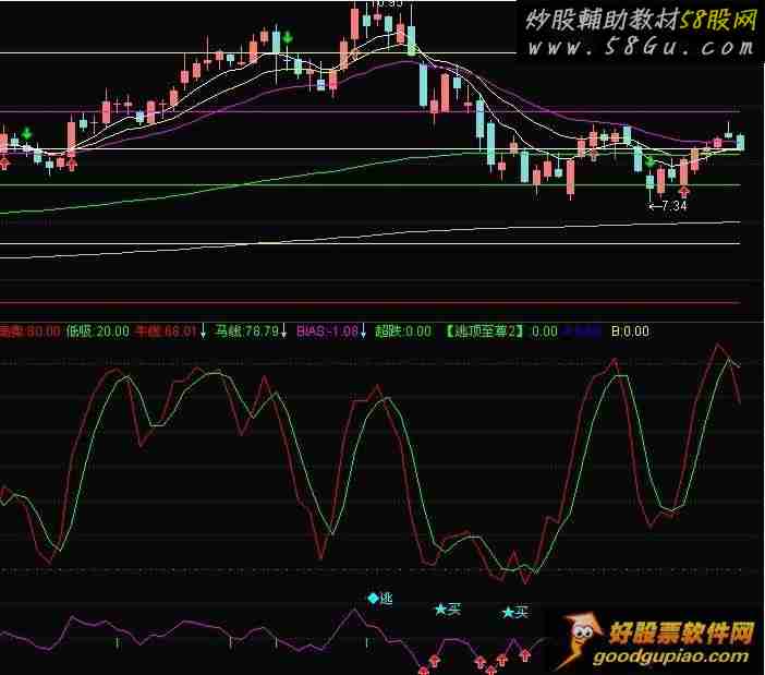 高卖:80, POINTDOT,COLORRED; 低吸:20, POINTDOT,COLORGREEN; VAR1:=LLV(LOW,P1); VAR2:=HHV(HIGH,P1); 牛线: EMA((CLOSE-VAR1)/(VAR2-VAR1)*100,P2),COLORRED,LINETHICK1; 马线: EMA(0.667*REF(牛线,1)+0.333*牛线,2),COLORGREEN,LINETHICK1; BIAS:(C-MA(C,5))/MA(C,5)*100; 超跌:BIAS<-5,LINETHICK0; DRAWICON(超跌,BIAS-0.15,1);