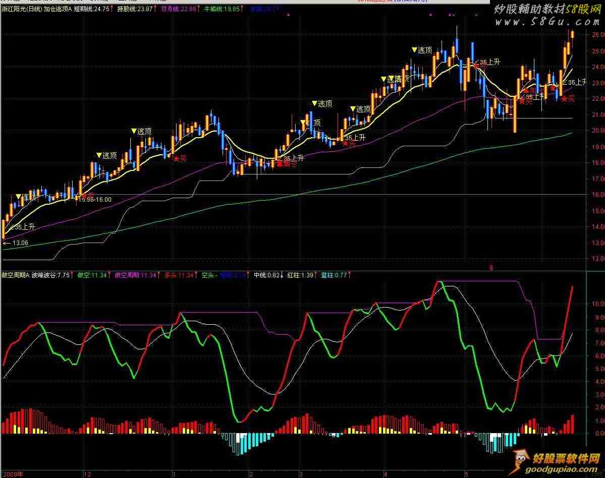 拉升力:=(CLOSE-LLV(LOW,28))/(HHV(HIGH,30)-LLV(LOW,36))*0.6*CLOSE; 拉升力A:=SMA(拉升力,6.3,1); 波峰波谷:SMA(拉升力A,3,1),COLORFFFFFF; 拉升力B:=3*拉升力A-2.1*波峰波谷; 空方:=3*波峰波谷-1* 拉升力A; 做空:IF(空方>拉升力B,拉升力B,空方),LINETHICK2,COLOR00FF00; 做空周期:HHV(做空,21); 多头:IF(做空>=REF(做空,1),做空,DRAWNULL),COLORRED,LINETHICK3; 空头:IF(做空<REF(做空,1),做空,DRAWNULL),COLORGREEN,LINETHICK3; 短线:(CLOSE-MA(CLOSE,13))/MA(CLOSE,13)*20,LINETHICK0,COLORYELLOW; 中线:(CLOSE-MA(CLOSE,4))/MA(CLOSE,4)*20,LINETHICK0,COLORWHITE; 红柱:SMA(短线,3,1),LINETHICK0,COLOR0000FF; 蓝柱:SMA(中线,3,1),COLORSTICK,COLORFFFF00; {红柱} STICKLINE(红柱<REF(红柱,1)AND 红柱>0,0,红柱,2,1),COLORRED; STICKLINE(红柱>REF(红柱,1)AND 红柱>0,0,红柱,2,0),COLORRED; STICKLINE(蓝柱<REF(蓝柱,1) AND 蓝柱>0,0,蓝柱,2,0),COLOR00FFFF; {蓝柱} STICKLINE(红柱>REF(红柱,1)AND 红柱<0,0,红柱,2,0),COLORCYAN; STICKLINE(红柱<REF(红柱,1)AND 红柱<0,0,红柱,2,1),COLORCYAN; STICKLINE(蓝柱>REF(蓝柱,1)AND 蓝柱<0,0,蓝柱,3,0),COLORWHITE;
