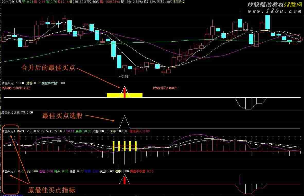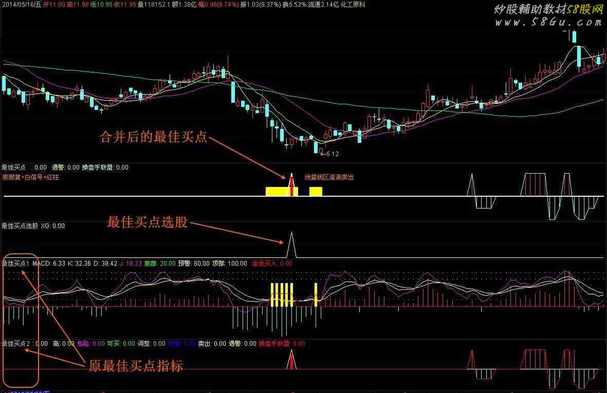 觉得没必要非两个指标占用2个窗口 自己做了合并并做了选股随意抓两张图对比一下合并后的《最佳买点》与原指标《最佳买点1》,《最佳买点2》{最佳买点1_底部黄}V1:=(CLOSE-LLV(LOW,9))/(HHV(HIGH,9)-LLV(LOW,9))*100; V2:=(CLOSE-MA(CLOSE,6))/MA(CLOSE,6)*100; V3:=(CLOSE-MA(CLOSE,12))/MA(CLOSE,12)*100; V4:=(CLOSE-MA(CLOSE,24))/MA(CLOSE,24)*100; V5:=(V2+2*V3+3*V4)/7; V6:=MA(V5,1);底部:STICKLINE(V6<=-8,0.40,0,10,0),COLORYELLOW;{买入:IF(V6<-8,0.30,0),LINETHICK2,COLORRED;}{最佳买点2_白加红}A1:=REF(CLOSE,1);A2:=SMA(MAX(CLOSE-A1,0),7,1)/SMA(ABS(CLOSE-A1),7,1)*100;FILTER(REF(A2,1)<20 AND A2>REF(A2,1),5),LINETHICK2,COLORWHITE;BIAS1:=(C-MA(C,6))/MA(C,6)*100;BIAS2:=(C-MA(C,12))/MA(C,12)*100;BIAS3:=(C-MA(C,24))/MA(C,24)*100;BIAS:=(BIAS1+2*BIAS2+3*BIAS3)/6;乖离:=MA(BIAS,3);STICKLINE(CROSS(BIAS,乖离) AND 乖离<-9.5,0.85,0,1,0),COLORRED;VF1:=EMA((CLOSE-LLV(LOW,10))/(HHV(HIGH,25)-LLV(LOW,10))*4,4)/10;高:="DMI.PDI"(14,6)>33 AND "DMI.MDI"(14,6)<10 AND "DMI.ADX"(14,6)>40 AND "DMI.ADXR"(14,6)>45,STICK;危险:=HHV(VF1,4)>0.38 OR VF1>0.25 AND 高,STICK;可买:=IF(高=1 AND HIGH-CLOSE>CLOSE-LOW AND VOL>HHV(VOL,13)*0.4 AND (CLOSE-REF(CLOSE,1))/REF(CLOSE,1)<-0.03,-0.50,0),STICK;调整:=IF(高=0 AND HHV(高,5)>0,-0.5,0),STICK;可卖:=IF(危险=1 AND HIGH-CLOSE>CLOSE-LOW AND VOL>HHV(VOL,20)/2 AND CLOSE<OPEN*1.01,-0.75,0),STICK;卖出:=IF(危险=0 AND HHV(危险,3)>0,-1,0),STICK;遇警:IF(可卖=-0.75,-0.75,IF(卖出<0,-1,IF(危险>0,1,IF(调整<0,-0.5,高)))),COLORSTICK;操盘手联盟:IF(可卖=-0.75,-0.75,IF(卖出<0,-1,IF(危险>0,1,IF(调整<0,-0.5,高)))),LINETHICK1,COLORFFFF80;DRAWTEXT_FIX(1,0.0,0.001,0,'底部黄+白信号+红柱'),COLOR0078FF;DRAWTEXT_FIX(1,0.5,0.001,0,'浅蓝线区逢高卖出'),COLOR0078FF;{选股}{A1:=(CLOSE-LLV(LOW,9))/(HHV(HIGH,9)-LLV(LOW,9))*100; A2:=(CLOSE-MA(CLOSE,6))/MA(CLOSE,6)*100; A3:=(CLOSE-MA(CLOSE,12))/MA(CLOSE,12)*100; A4:=(CLOSE-MA(CLOSE,24))/MA(CLOSE,24)*100; A5:=(A2+2*A3+3*A4)/7; A6:=MA(A5,1);AA:=A6<=-8;{买点1黄柱}V1:=REF(CLOSE,1);V2:=SMA(MAX(CLOSE-V1,0),7,1)/SMA(ABS(CLOSE-V1),7,1)*100;VV:=FILTER(REF(V2,1)<20 AND V2>REF(V2,1),5);{买点2白信号}BIAS1:=(C-MA(C,6))/MA(C,6)*100;BIAS2:=(C-MA(C,12))/MA(C,12)*100;BIAS3:=(C-MA(C,24))/MA(C,24)*100;BIASA:=(BIAS1+2*BIAS2+3*BIAS3)/6;BIASB:=MA(BIASA,3);BIASAB:=CROSS(BIASA,BIASB) AND BIASB<-9.5;{买点2红柱}BIASVAB:=VV AND BIASAB;XG:AA AND BIASAB AND VV;}  |