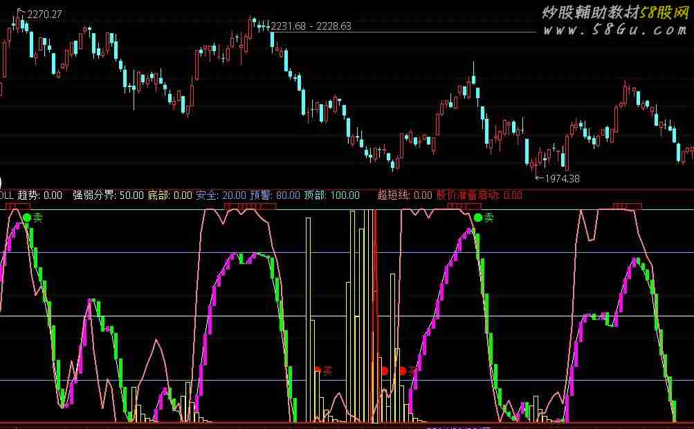 VAR1:=(HHV(HIGH,9)-CLOSE)/(HHV(HIGH,9)-LLV(LOW,9))*100-70;VAR2:=SMA(VAR1,9,1)+100;VAR3:=(CLOSE-LLV(LOW,9))/(HHV(HIGH,9)-LLV(LOW,9))*100;VAR4:=SMA(VAR3,3,1);VAR5:=SMA(VAR4,3,1)+100;VAR6:=VAR5-VAR2;趋势: IF(VAR6>45,VAR6-45,0);STICKLINE(REF(趋势,1)< 趋势, 趋势,REF(趋势,1),2,0),COLORMAGENTA;STICKLINE(REF(趋势,1)> 趋势, 趋势,REF(趋势,1),2,0),COLORGREEN;强弱分界:50,COLORFFFFCC;底部:0,COLOR00FFFF;安全:20,COLORFFAA66,LINETHICK1;预警:80,COLORFFAA66,LINETHICK1;顶部:100,COLORFFFF33;V1:=LLV(LOW,10);V2:=HHV(H,25);价位线:=EMA((C-V1)/(V2-V1)*4,4);DRAWTEXT(CROSS(价位线,0.3),20+4,'●买'),COLORRED;DRAWTEXT(CROSS(3.5,价位线),100-4,'●卖'),COLORGREEN;VAR2Q:=REF(LOW,1);VAR3Q:=SMA(ABS(LOW-VAR2Q),3,1)/SMA(MAX(LOW-VAR2Q,0),3,1)*100;VAR4Q:=EMA(IF(CLOSE*1.3,VAR3Q*10,VAR3Q/10),3);VAR5Q:=LLV(LOW,30);VAR6Q:=HHV(VAR4Q,30);VAR7Q:=IF(MA(CLOSE,58),1,0);VAR8Q:=EMA(IF(LOW<=VAR5Q,(VAR4Q+VAR6Q*2)/2,0),3)/618*VAR7Q;VAR9Q:=IF(VAR8Q>100,100,VAR8Q);吸筹:STICKLINE(VAR9Q>-120,0,VAR9Q,3,1),COLORYELLOW;AA3:=(HHV(HIGH,21)-CLOSE)/(HHV(HIGH,21)-LLV(LOW,21))*100-10;AA4:=(CLOSE-LLV(LOW,21))/(HHV(HIGH,21)-LLV(LOW,21))*100;AA5:=SMA(AA4,13,8);走势:=CEILING(SMA(AA5,13,8));AA6:=SMA(AA3,21,8);卖临界:STICKLINE(走势-AA6>85,103,100,15,1),COLORRED,LINETHICK2;主力线:=3*SMA((CLOSE-LLV(LOW,27))/(HHV(HIGH,27)-LLV(LOW,27))*100,5,1)-2*SMA(SMA((CLOSE-LLV(LOW,27))/(HHV(HIGH,27)-LLV(LOW,27))*100,5,1),3,1),LINETHICK1,POINTDOT;超短线:(((主力线-LLV(主力线,21))/(HHV(主力线,21)-LLV(主力线,21)))*(4))*(25),LINETHICK2,COLORLIRED;VAR11:=3;VAR21:=(3)*(SMA(((CLOSE - LLV(LOW,27))/(HHV(HIGH,27) - LLV(LOW,27)))*(100),5,1)) - (2)*(SMA(SMA(((CLOSE - LLV(LOW,27))/(HHV(HIGH,27) - LLV(LOW,27)))*(100),5,1),3,1));股价准备启动:IF(CROSS(VAR21,VAR11),100,0),COLORRED,LINETHICK2; |