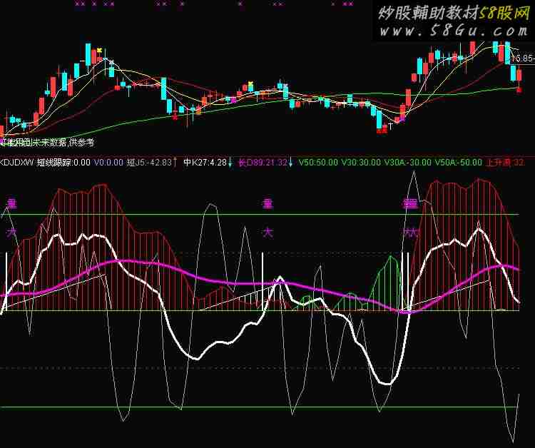 本指标适合中短线操作,来源已无从考证,如果作者看到请谅解。 操作方法:短线以‘短J5’为操盘线 经不起大风大浪的小市民请在V30--V30A之间操作(上穿V30A买入,跌破V30卖出)稳字当头,赚点 买菜钱,奶粉钱,过桥过路费那是绰绰有余啊。 如果你是激进派,那你可以在V50--V50A之间操作,获取暴利,本钱足够的话赚辆车开开没问题 觉得好不要忘了给我加分啊!!!! 乖离率:=(C-MA(C,250))/MA(C,250)*100,COLOR00FFFF,LINETHICK2; MA乖离率5:=EMA(乖离率,5),COLOR4080FF; MA乖离率20:=EMA(乖离率,20),COLORRED; N1:=BARSLAST(CROSS(C,MA(C,250))); N2:=BARSLAST(CROSS(MA(C,250),C)); 长期趋势:=IF(N1<N2,N1+1,0),COLOR0000FF; 峰值乖离:=HHV(乖离率,长期趋势),COLOR00FF00; N1A:=BARSLAST(CROSS(C,MA(C,13))); N2A:=BARSLAST(CROSS(MA(C,13),C)); 短线跟踪:IF(N1A<N2A,N1A+1,0),COLORFFFFFF,LINETHICK1,LINESTICK; V0:0,COLORFFA2AF; RSV5:=(CLOSE-LLV(LOW,5))/(HHV(HIGH,5)-LLV(LOW,5))*100-50; 短K5:=SMA(RSV5,3,1); 短D5:=SMA(短K5,3,1); 短J5:3*短K5-2*短D5,COLORAAAAAA; RSV27:=(CLOSE-LLV(LOW,27))/(HHV(HIGH,27)-LLV(LOW,27))*100-50; 中K27:SMA(RSV27,3,1),LINETHICK3,COLORFFFFFF; RSV89:=(CLOSE-LLV(LOW,89))/(HHV(HIGH,89)-LLV(LOW,89))*100-50; K89:=SMA(RSV89,13,1); 长D89:SMA(K89,3,1),LINETHICK3,COLORFF00FF; V50:50,COLOR00FF00; V30:30,COLOR00FF00,POINTDOT; V30A:-30,COLOR00FF00,POINTDOT; V50A:-50,COLOR00FF00; VAR1:=MA(100*(CLOSE-LLV(CLOSE,34))/(HHV(HIGH,34)-LLV(LOW,34)),5)-20; VAR2:=2*ABS(VAR1); 上升浪: IF(VAR1>0,VAR1,0),COLORRED, LINESTICK; 下跌浪: IF(VAR1<0,VAR2,0),COLOR00FF00,LINESTICK; S1:=V/MA(V,20); XG:IF(S1>2 AND C>REF(C,1) AND V>REF(V,1),30,0),STICK,COLORFFFFFF, LINETHICK2; DRAWTEXT(S1>2 AND C>REF(C,1) AND V>REF(V,1),40,'大'),COLORFF00FF; DRAWTEXT(S1>2 AND C>REF(C,1) AND V>REF(V,1),55,'量'),COLORFF00FF; |