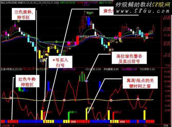 WL:(CLOSE-MA(CLOSE,6))/MA(CLOSE,6)*100,LINETHICK1,COLOR0000FF; WL3:=MA(WL,3),COLOR00FFFF; WLT:MA(WL,89),COLOR00FFFF,LINETHICK1; DRAWBAND(WL,RGB(200,60,200),WLT,RGB(0,100,50)); 遵涨:IF(WL>=WLT,WL,DRAWNULL),COLOR3300FF; 守望:IF(WLT>=WL,WLT,DRAWNULL),COLORFF6000; 纪买:IF(WL>=WLT,WLT,DRAWNULL),COLOR00FFFF; 律跌:IF(WLT>=WL,WL,DRAWNULL),COLOR00FF00; WLT1:=CROSS(WL,WLT); WLT11:=CROSS(WL,-10); WLT2:=FILTER(WLT1,8); SKY:=10,POINTDOT,COLORFF0000,LINETHICK1; SEA:=-10,POINTDOT,COLORFF00FF,LINETHICK1; DRAWICON(WLT2,WLT,23); DRAWICON(WLT11,SEA,15); T8:=FILTER(CROSS(WL,WL3) AND WL3<WLT,5); DRAWICON(T8,WL,25); WLT3:=COUNT(WL>10,5)>=3; WLT33:=CROSS(10,WL); SEL:=WLT3 AND WLT33; DRAWICON(SEL,10,19); STICKLINE(WL>10,WL,10,0.001,0),COLOR00FF00; STICKLINE(WL<-10,WL,-10,0.001,0),COLORFF00FF; DIF:=EMA(CLOSE,12)-EMA(CLOSE,26); DEA:=EMA(DIF,9); MACD:=(DIF-DEA)*2,COLORSTICK; DIF底:=LLV(DIF,120); 最底价:=L=LLV(L,120); 距今:=BARSLAST(最底价); 偏离:=IF((距今=0 AND DIF>DIF底),1,0); DDD:=EXIST(偏离,20) AND SLOPE(DEA,2)>=0; HRY:=FILTER(DDD,10); STICKLINE(HRY,-5,-10,3,0),COLOR00FFFF; DRAWTEXT(HRY,-5,'M背'),COLOR88FFFF; {YYY:COUNT(偏离,5);} DIF顶:=HHV(DIF,120); 最高价:=H=HHV(H,120); 距今高:=BARSLAST(最高价); 偏离高:=IF((距今高=0 AND DIF<DIF顶),1,0); GGG:=EXIST(偏离高,20) AND SLOPE(DEA,2)<0; HRY1:=FILTER(GGG,10); STICKLINE(HRY1,10,6.5,7,1),COLORFF8000; DRAWTEXT(HRY1,6,' M背'),COLORFF8000; A2:=BARSLAST(REF(CROSS("KDJ.K"(9,3,3),"KDJ.D"(9,3,3)),1)); B2:=REF(C,A2+1)>C AND REF("KDJ.K"(9,3,3),A2+1)<"KDJ.K"(9,3,3) AND CROSS("KDJ.K"(9,3,3),"KDJ.D"(9,3,3)); A3:=BARSLAST(REF(CROSS("RSI.RSI1"(6,12,24),"RSI.RSI2"(6,12,24)),1)); B3:=REF(C,A3+1)>C AND REF("RSI.RSI1"(6,12,24),A3+1)<"RSI.RSI1"(6,12,24) AND CROSS("RSI.RSI1"(6,12,24),"RSI.RSI2"(6,12,24)); C2:=BARSLAST(REF(CROSS("KDJ.D"(9,3,3),"KDJ.K"(9,3,3)),1)); D2:=REF(C,C2+1)<C AND REF("KDJ.K"(9,3,3),C2+1)>"KDJ.K"(9,3,3) AND CROSS("KDJ.D"(9,3,3),"KDJ.K"(9,3,3)); C3:=BARSLAST(REF(CROSS("RSI.RSI2"(6,12,24),"RSI.RSI1"(6,12,24)),1)); D3:=REF(C,C3+1)<C AND REF("RSI.RSI1"(6,12,24),C3+1)>"RSI.RSI1"(6,12,24) AND CROSS("RSI.RSI2"(6,12,24),"RSI.RSI1"(6,12,24));KDJ底背:FILTER(IF(B2>0,-1,0),13),COLORFF00FF,NODRAW; STICKLINE(KDJ底背,-10,-8,3,0),COLORFF00FF; DRAWTEXT(KDJ底背,-7.5,'K背'),COLORFF00FF; RSI底背:FILTER(IF(B3>0,-1,0),13),COLORFF8000,NODRAW; STICKLINE(RSI底背,-10,-7,3,0),COLORFFFFFF; DRAWTEXT(RSI底背,-6.5,'R背'),COLORFFFFFF; KDJ顶背:FILTER(IF(D2>0,1,0),13),COLORFFF000,NODRAW; STICKLINE(KDJ顶背,10,5,2,0),COLORFFFF00; DRAWTEXT(KDJ顶背,4.5,'K背'),COLORFFFF00; RSI顶背:FILTER(IF(D3>0,1,0),13),NODRAW; STICKLINE(RSI顶背,10,8,5,0),COLOR00FF00; DRAWTEXT(RSI顶背,7.5,'R背'),COLOR00FF80; T:=IF((BARSCOUNT(C) > 7),(100)*((MA(C,7))/(LLV(MA(C,7),7)) - 1),1); N:=IF((T > 0.35),6,65); W:=((-((100)*(HHV(H,N) - C))/(HHV(HIGH,N) - LLV(L,N)))); RV:=(CLOSE-LLV(LOW,27))/(HHV(HIGH,27)-LLV(LOW,27))*100; RG:=(CLOSE-LLV(LOW,5))/(HHV(HIGH,5)-LLV(LOW,5))*100; J0:=(HIGH+LOW)/2; QJ:=EMA(J0,3); J1:=IF(CLOSE>QJ,VOL,0); J2:=IF(CLOSE<QJ,VOL,0); BB:=MA(SUM(J1-J2,22),3); 修改1:=DYNAINFO(8)*240/FROMOPEN; 修改2:=IF(CLOSE>QJ,修改1,0); 修改3:=IF(CLOSE<QJ,修改1,0); 修改4:=MA(SUM(修改2-修改3,22),3); 累加:=21*修改4+20*REF(BB,1)+19*REF(BB,2)+18*REF(BB,3)+17*REF(BB,4) +16*REF(BB,5)+15*REF(BB,6)+14*REF(BB,7)+13*REF(BB,8)+12*REF (BB,9)+11*REF(BB,10)+10*REF(BB,11)+9*REF(BB,12)+8*REF(BB,13) +7*REF(BB,14)+6*REF(BB,15)+5*REF(BB,16)+4*REF(BB,17)+3*REF (BB,18)+2*REF(BB,19)+REF(BB,20); CC:=累加/(21+1)/21*2; VAR3:=(BB-CC);VAR4:=SMA(RV,3,1); VAR5:=SMA(VAR4,3,1); KK:=EMA(SMA(RG,3,1),2),COLORFFFFFF; DD:=SMA(KK,3,1),COLOR00FFFF; 涨停:=CROSS(W,-2) AND CROSS(VAR4,VAR5) AND CROSS(KK,DD); STICKLINE(涨停,-10,-5,4,0)COLORRED; DRAWTEXT(REF("KDJ.J",1)<0 AND "KDJ.J">0,-4,'短'),COLORFF88FF; STICKLINE(REF("KDJ.J",1)<0 AND "KDJ.J">0,-10,-4.5,3,0),COLORFF88FF; AA1:=HHV(H,55); BB1:=REF(H,13); TJ1:=AA1=BB1; XX:=LLV(L,55); YY:=REF(L,13); YY1:=REF(L,21); TJ2:=XX=YY; TJ3:=XX=YY1; 选股:TJ1 OR TJ2; DRAWTEXT(TJ2,-6,'离底13'),COLOR00FF00; STICKLINE(TJ2 ,-10,-6.5,2,1),COLOR00FF00; DRAWTEXT(TJ3,-7.5,'离底21'),COLOR00FFFF; STICKLINE(TJ3 ,-10,-8,4,1),COLOR00FFFF; DRAWTEXT(TJ1,-5.5,'离高13'),COLOR0000FF; STICKLINE(TJ1 ,-10,-6,2,0),COLOR0000FF; LV:=MA(C,24); HR0:=HHV(HIGH,N); HRY0:=LLV(LOW,N); HRY110:=HR0*HRY0; HRY330:=SQRT(HRY110); NS1:=C>HRY330 AND HRY330 >=REF(HRY330,1) AND C>LV; STICKLINE(C>0,-10,-11.5,3,0),COLORFF6000; STICKLINE(WLT2 OR WL>WLT,-10,-11.5,3,0),COLOR00FFFF; STICKLINE(NS1,-10,-11.5,3,0),COLOR0000FF; DRAWTEXT(FILTER(NS1,21),-11,'持股'),COLORFFFFFF; DRAWTEXT(FILTER(WLT2 OR WL>WLT,13),-11,'买入'),COLOR0000FF;